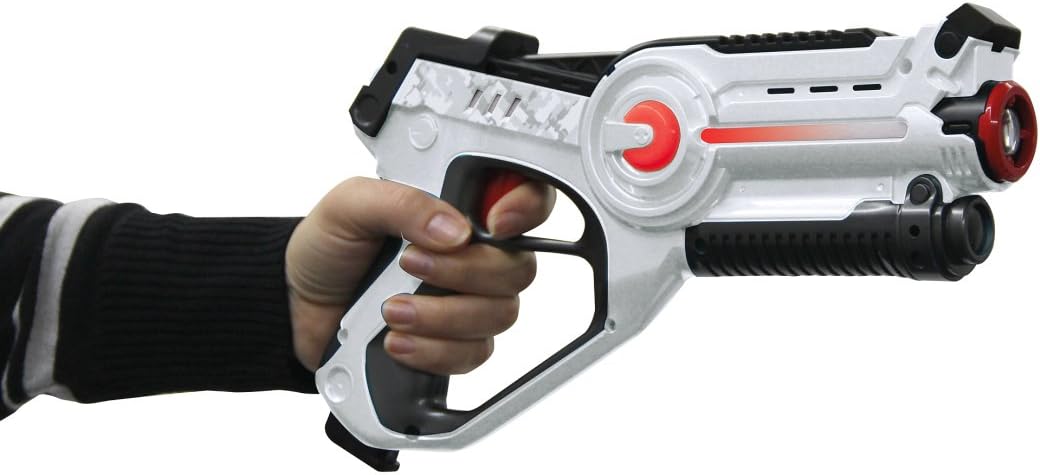Tecnologia a infrarossi innocua per gli occhi e pelle, nessun abbigliamento protettivo necessario Il riconoscimento dei colpi con alta precisione garantisce un grande divertimento e motivazione 4 diversi tipi di armi simulate, funzioni spara, ricarica, cambio armi, vibrazione, effetti sonori Colpo e ricarica realistica con effetto vibrante ricarica manuale premendo il caricatore pulsante La selezione della squadra è possibile solo con almeno 2 armi, modalità demo, laser tag