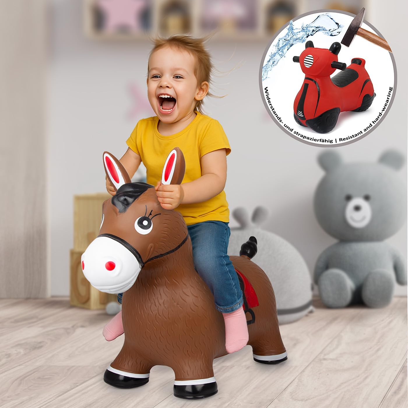 Promuove il senso dell‘equilibrio e delle capacità motorie Le orecchie degli animali fungono da supporto per il bambino Robusto e resistente Facilità di manutenzione Caricabile fino a 50 kg