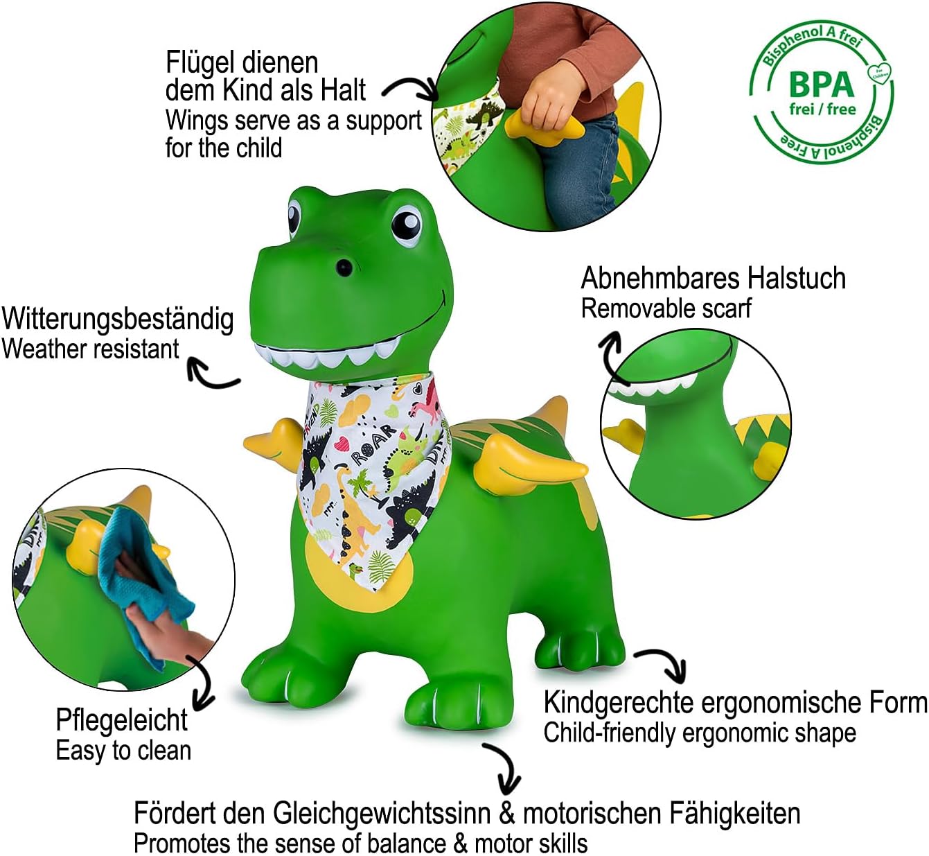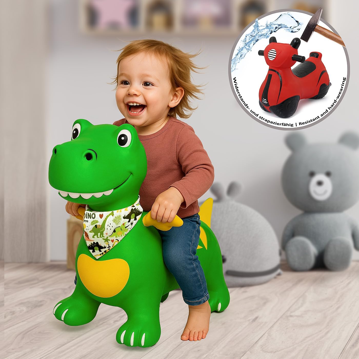 Un sacco di divertimento per bambini dai 12 mesi in su, gli animali rimbalzanti dipinti a mano con la pompa ad aria in dotazione sono facili da modellare, senza BPA. Le orecchie degli animali rimbalzanti servono a tenere fermo e dare al bambino una presa sicura Funzione di apprendimento: l'animale rimbalzante promuove il senso di equilibrio e le capacità motorie, rafforza i muscoli del bambino, quindi aiuta a sviluppare il cervello Robusto: il materiale resistente e resistente ha una portata fino a 50 kg. La zona centrale è adattata alla forma del corpo, questo garantisce una vestibilità ergonomica e confortevole. Anche all'aperto l'animale che rimbalza in giardino è divertente Struttura: la quantità d'aria consente al modello di adattarsi all'altezza e al peso del bambino. Basta gonfiare l'animale rimbalzante alla dimensione desiderata con la pompa ad aria e saltare via. L'altezza della seduta è di circa 24,5-27 cm Facile da pulire: il materiale di facile manutenzione può essere lavato con acqua corrente o pulito con acqua corrente