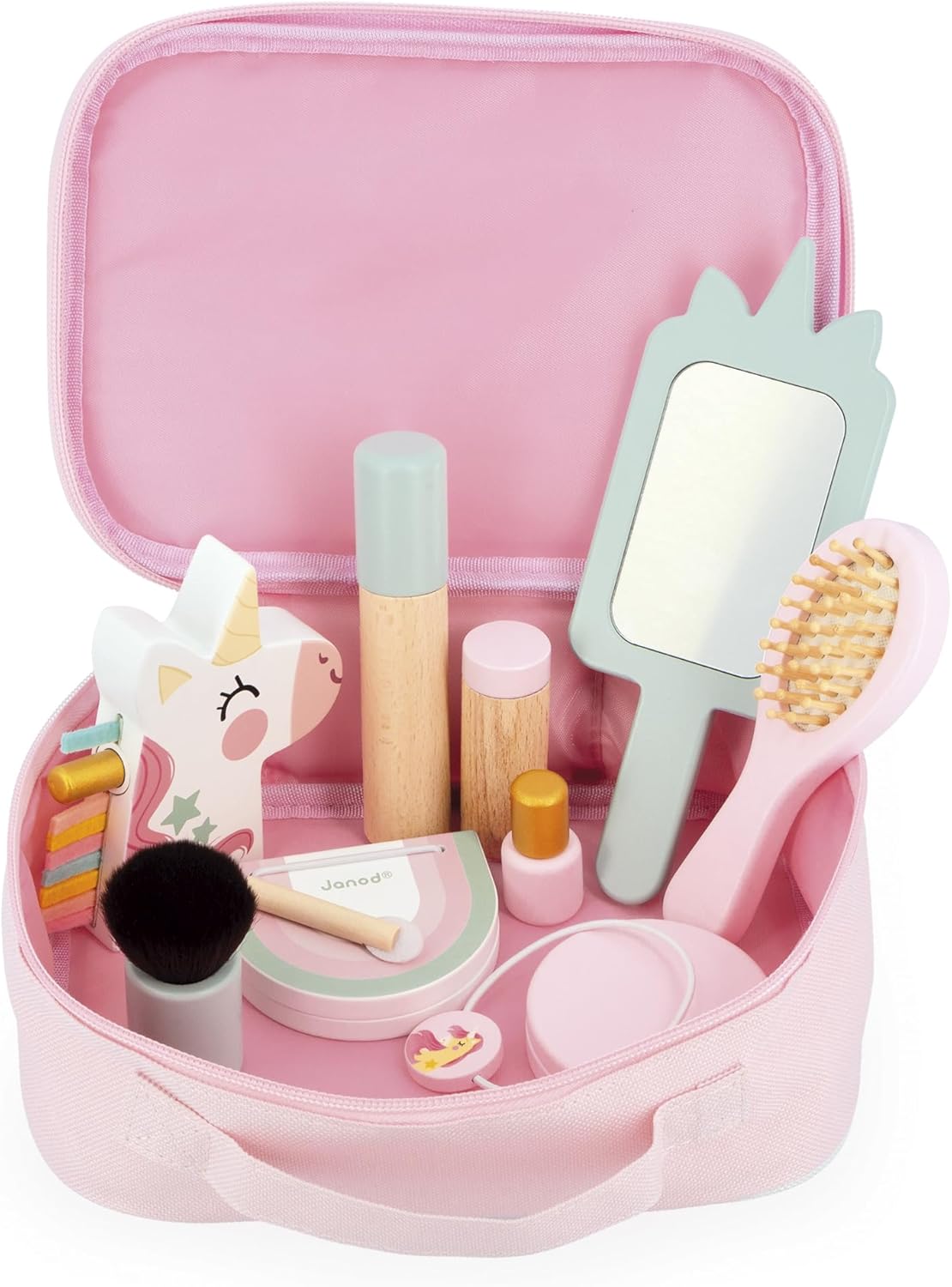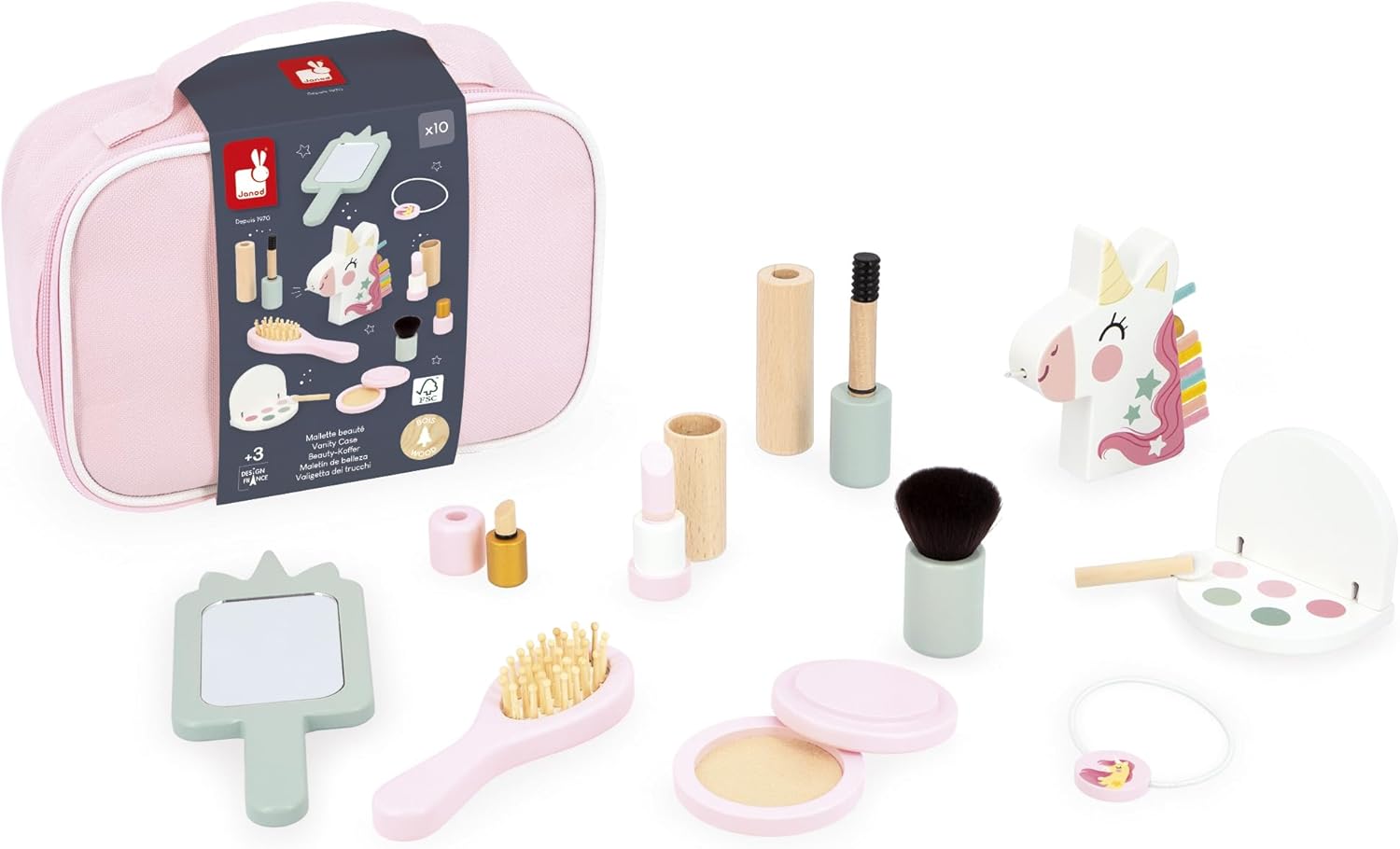MAGIC LICORN MAKE-UP KIT: questo kit di bellezza unicorno con 10 accessori permette ai bambini dai 3 anni in su di immaginarsi in un mondo da favola e di imparare a prendersi cura di sé e dei propri cari. È un modo divertente e magico per sviluppare la loro creatività! COQUETTE LICORNA: Che carini: premete la criniera dell'unicorno e lui tira fuori la lingua! Tutti gli accessori di bellezza possono essere riposti in un pratico astuccio con zip, divertente da trasportare. CARATTERISTICHE: Contiene 1 palette di ombretti, 1 pennello, 1 mascara, 1 rossetto, 1 vernice, 1 spazzola per capelli, 1 elastico, 1 pennello, 1 fard, 1 specchio, 1 profumo. Materiali utilizzati: Legno FSC. Dimensioni dell'astuccio: L 20,4 x L 9 x H 15,4 cm. il regno incantato o la valle bianca. IL POTERE DEL GIOCO: con le sue collezioni audaci e innovative, Janod accompagna i bambini nell'avventura più emozionante di tutte: la crescita! Giocattoli bellissimi per imparare senza accorgersene, esplorare il mondo, sognare e condividere... Ben fatto!