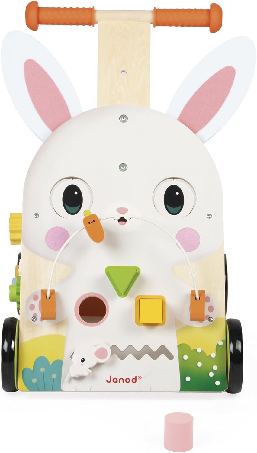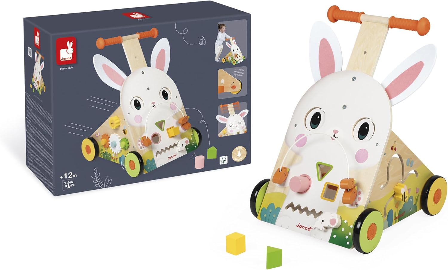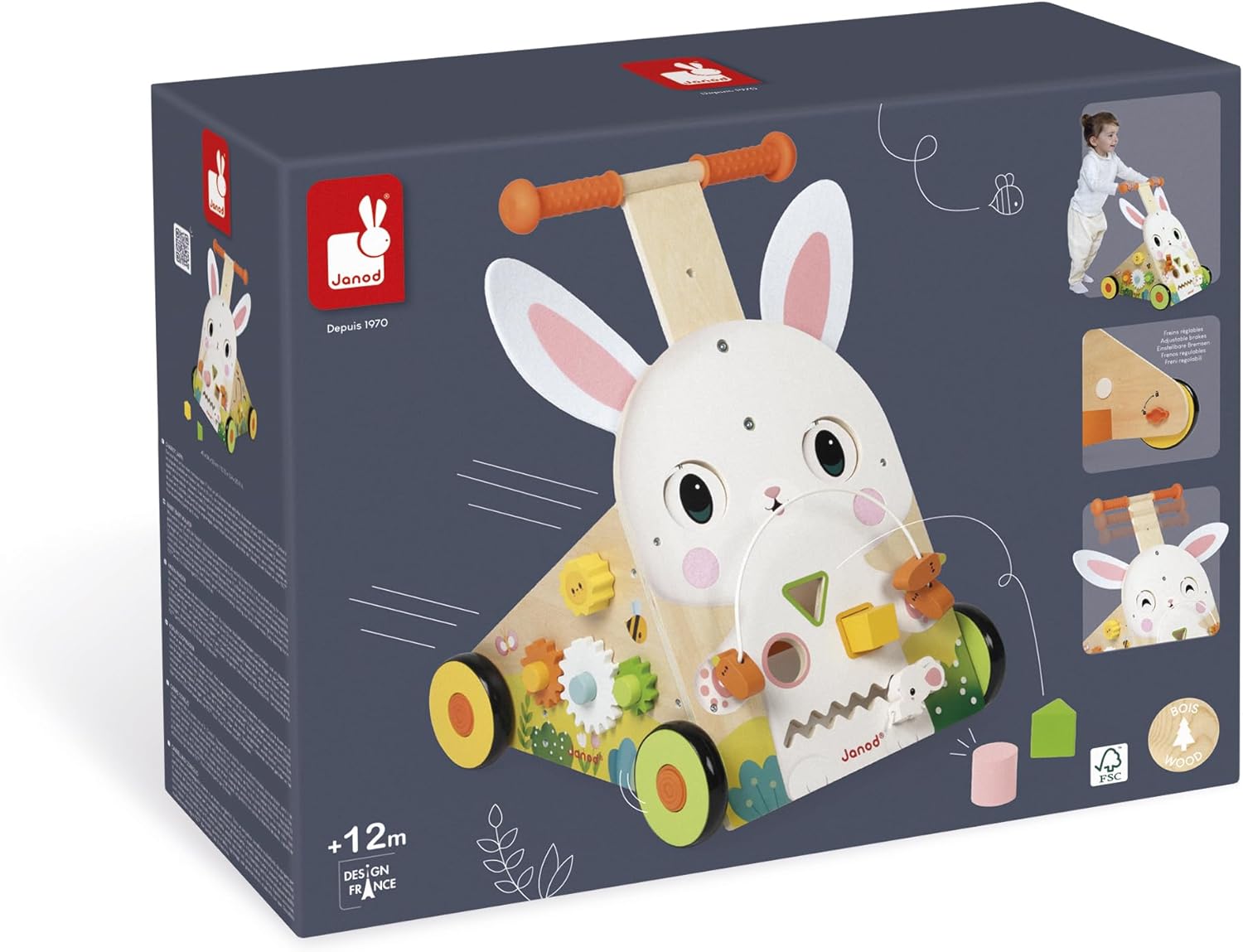 CARRELLO RABBIT: ideale per imparare a camminare a partire dai 12 mesi, questo carrello a tema fattoria è dotato di maniglie regolabili, ruote silenziose e un freno innovativo. Il compagno perfetto per i primi passi del bambino, che unisce sicurezza e divertimento. SISTEMA DI FRENO BREVETTATO JANOD: Freno integrato nella ruota, estetico e pratico (non è necessario smontarlo). Offre 3 posizioni: libero, folle, stop totale. Design innovativo e brevettato per un utilizzo facile e discreto. 9 ATTIVITÀ PER INCORAGGIARE IL BAMBINO: trasportino con 9 giochi sensoriali: sole sonoro, labirinto, ingranaggi, orecchie e guancia in feltro, occhi rotanti, abaco di carote, scatola delle forme, camminata del topolino. Stimola la motricità fine. CARATTERISTICHE: contiene un carrello da passeggio, 3 cubi e 2 orecchie di feltro. Manici regolabili in altezza: da 47 a 53 cm. Dimensioni del giocattolo (con le orecchie): 35 cm x 40,5 cm x 52 cm. A partire da 12 mesi. IL POTERE DEL GIOCO: con le sue collezioni audaci e innovative, Janod accompagna i bambini nella più grande avventura di tutti: crescere! Giocattoli bellissimi per imparare senza accorgersene, esplorare il mondo, sognare e condividere... Bravi!