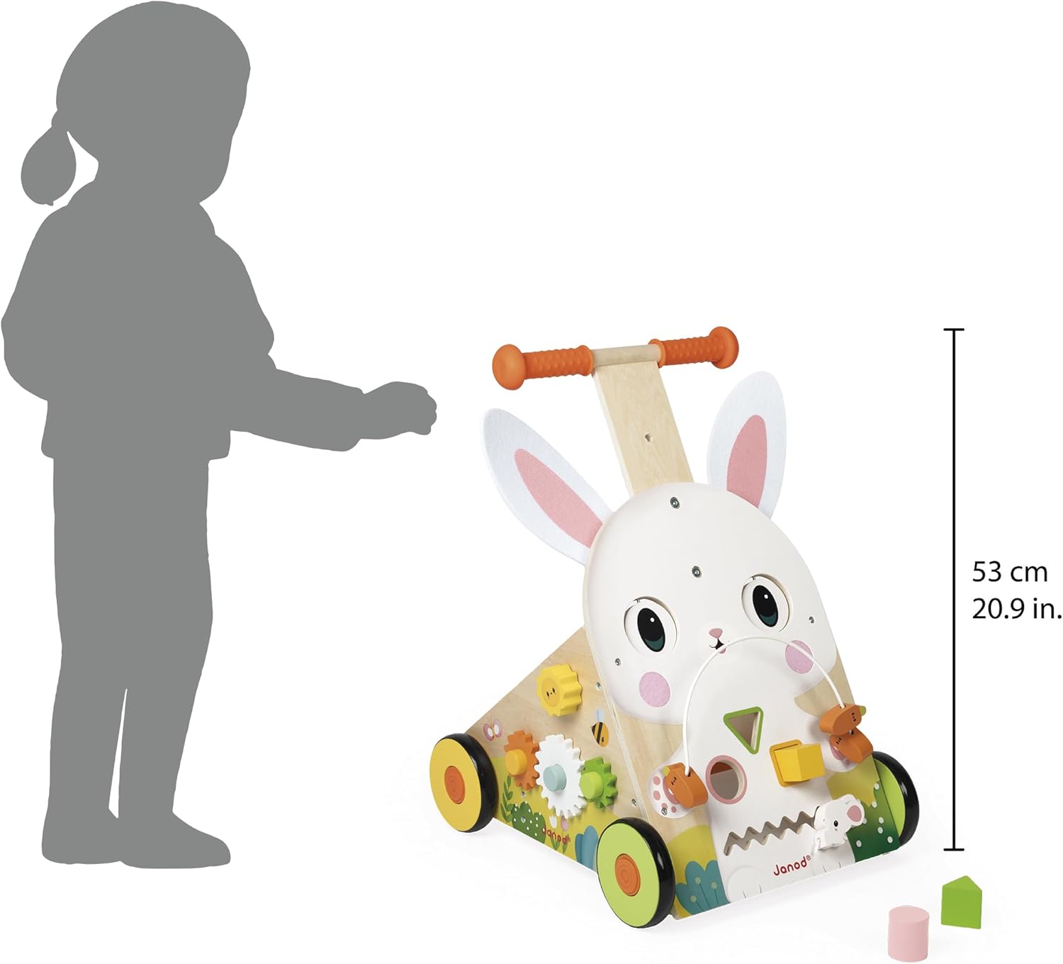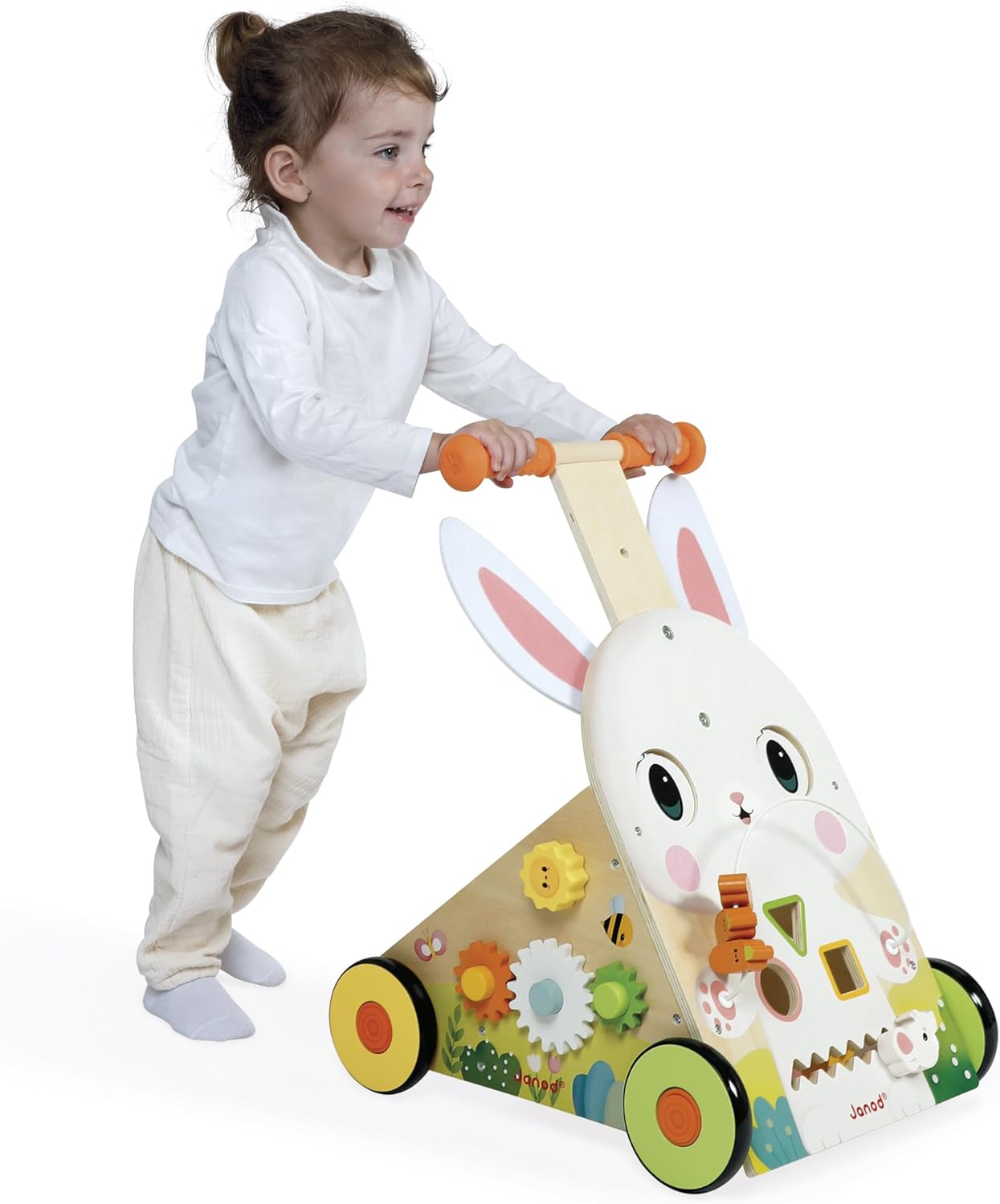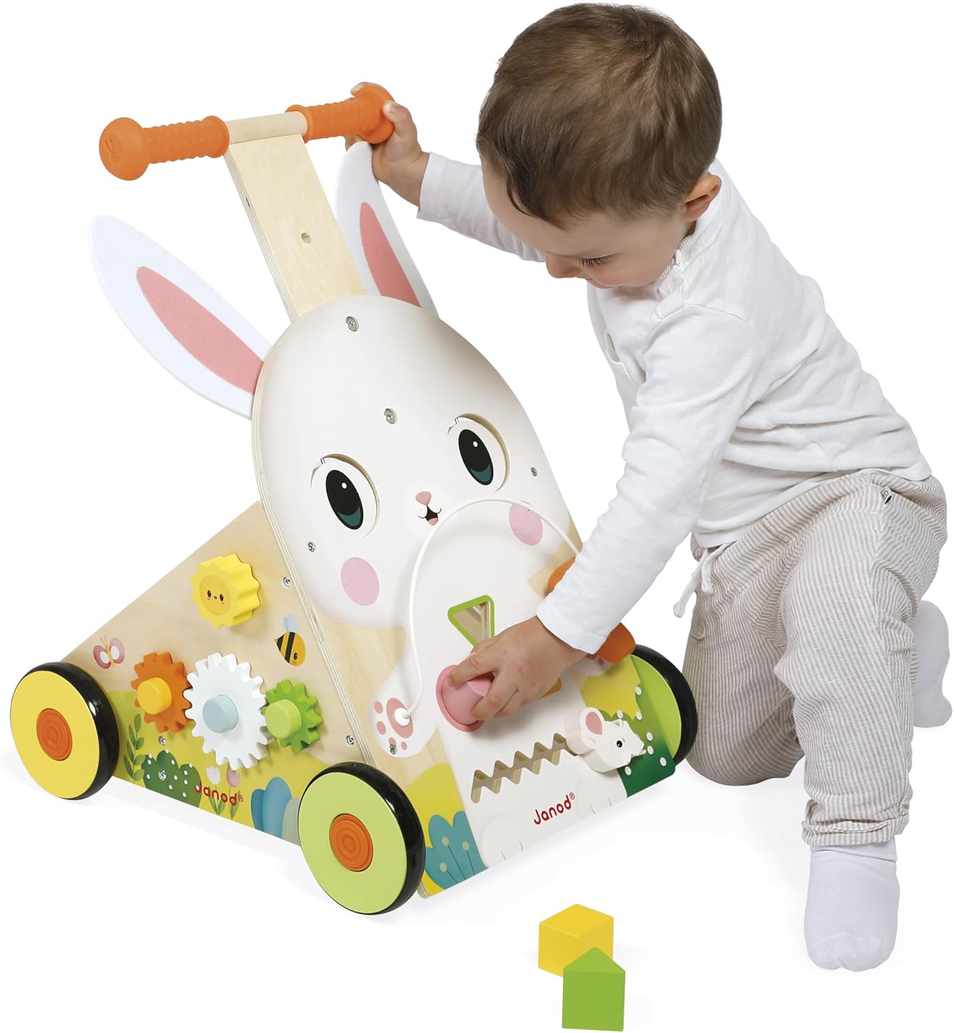 CARRELLO RABBIT: ideale per imparare a camminare a partire dai 12 mesi, questo carrello a tema fattoria è dotato di maniglie regolabili, ruote silenziose e un freno innovativo. Il compagno perfetto per i primi passi del bambino, che unisce sicurezza e divertimento. SISTEMA DI FRENO BREVETTATO JANOD: Freno integrato nella ruota, estetico e pratico (non è necessario smontarlo). Offre 3 posizioni: libero, folle, stop totale. Design innovativo e brevettato per un utilizzo facile e discreto. 9 ATTIVITÀ PER INCORAGGIARE IL BAMBINO: trasportino con 9 giochi sensoriali: sole sonoro, labirinto, ingranaggi, orecchie e guancia in feltro, occhi rotanti, abaco di carote, scatola delle forme, camminata del topolino. Stimola la motricità fine. CARATTERISTICHE: contiene un carrello da passeggio, 3 cubi e 2 orecchie di feltro. Manici regolabili in altezza: da 47 a 53 cm. Dimensioni del giocattolo (con le orecchie): 35 cm x 40,5 cm x 52 cm. A partire da 12 mesi. IL POTERE DEL GIOCO: con le sue collezioni audaci e innovative, Janod accompagna i bambini nella più grande avventura di tutti: crescere! Giocattoli bellissimi per imparare senza accorgersene, esplorare il mondo, sognare e condividere... Bravi!