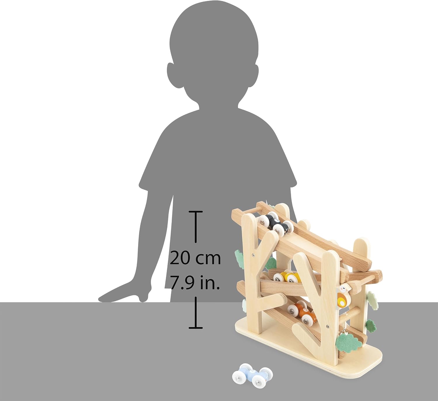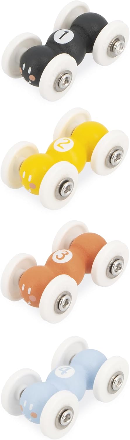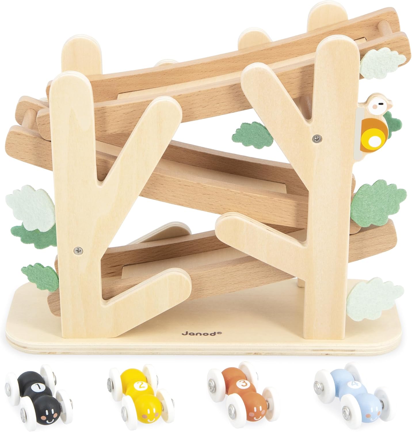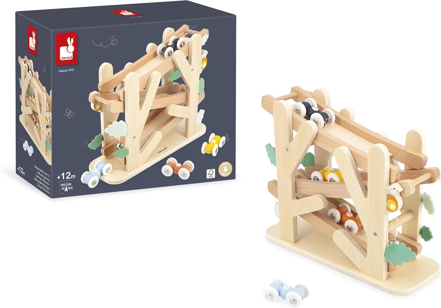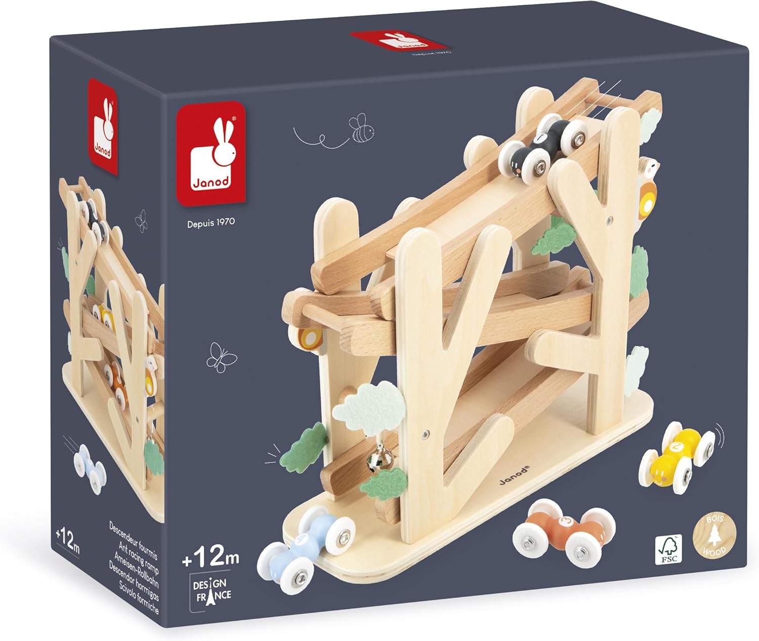 PRONTI A GAREGGIARE? Mettete in fila le 4 formiche su questo discensore in legno naturale e fatele correre fino alla campana che annuncia il traguardo! Il bambino adorerà riposizionare la sua formica preferita per vederla scendere! MANIPOLAZIONE: aiuta a dare il via all'apprendimento precoce del bambino. Manipolando le 4 macchinine a forma di formica e facendole correre lungo le 3 rampe di questo giocattolo educativo, svilupperanno la motricità fine e la destrezza. SVILUPPO DEI SENSI: il bambino può affinare la sua acutezza visiva seguendo con gli occhi le formiche dell'auto e l'udito ascoltando il suono della campanella alla fine della discesa. Ore e ore di divertimento! CARATTERISTICHE: 1 discensore in legno di tiglio, 4 formiche in 4 colori diversi (nero, giallo, blu, marrone). Da 12 mesi. IL POTERE DEL GIOCO: Con le sue collezioni audaci e innovative, Janod accompagna i bambini nell'avventura più emozionante di tutte: crescere! Giocattoli bellissimi per imparare senza accorgersene, esplorare il mondo, sognare e condividere... Ben fatto!
