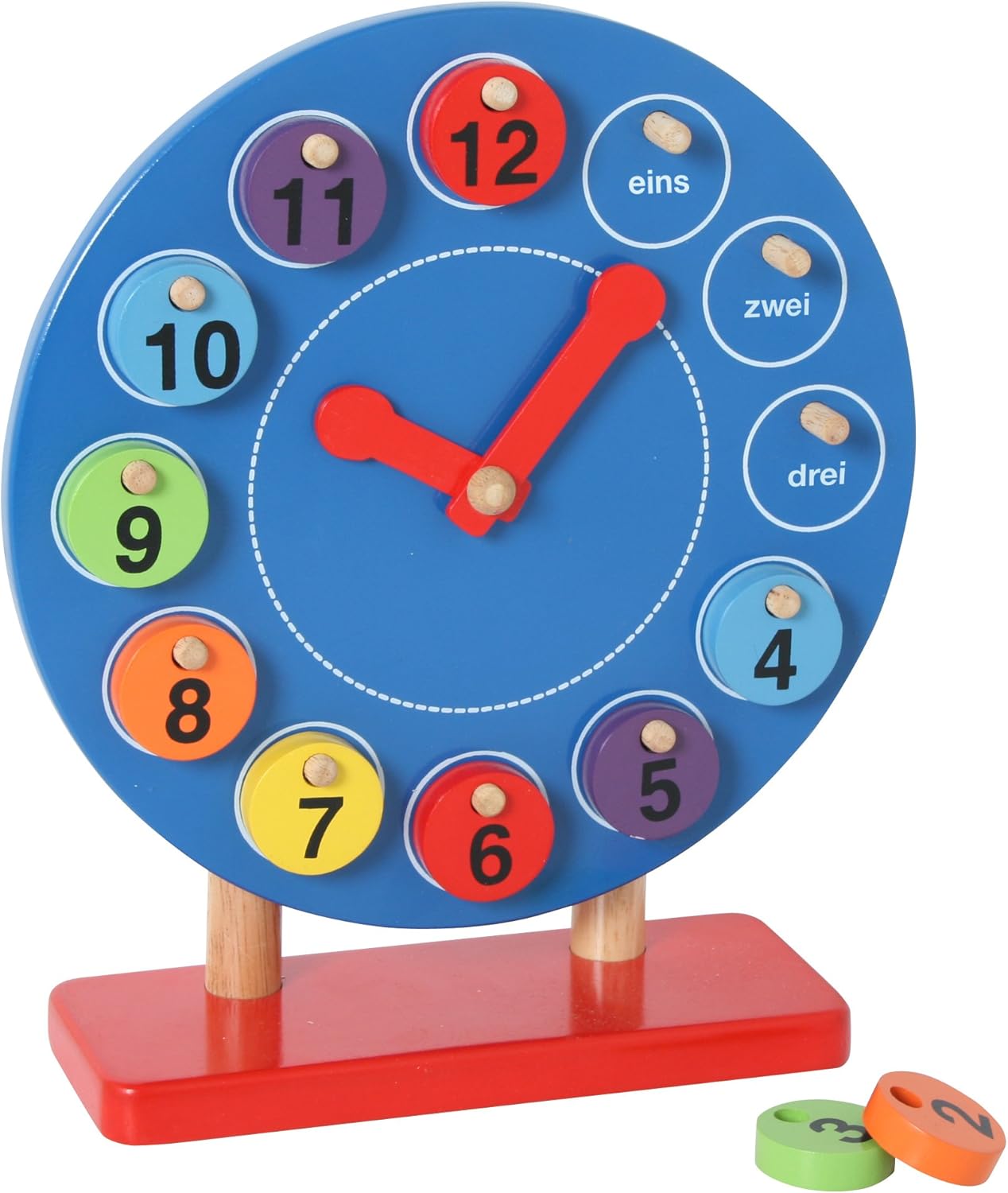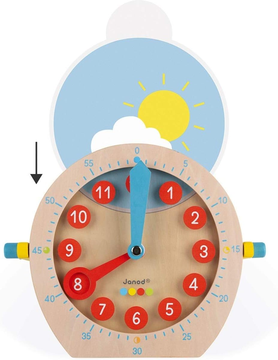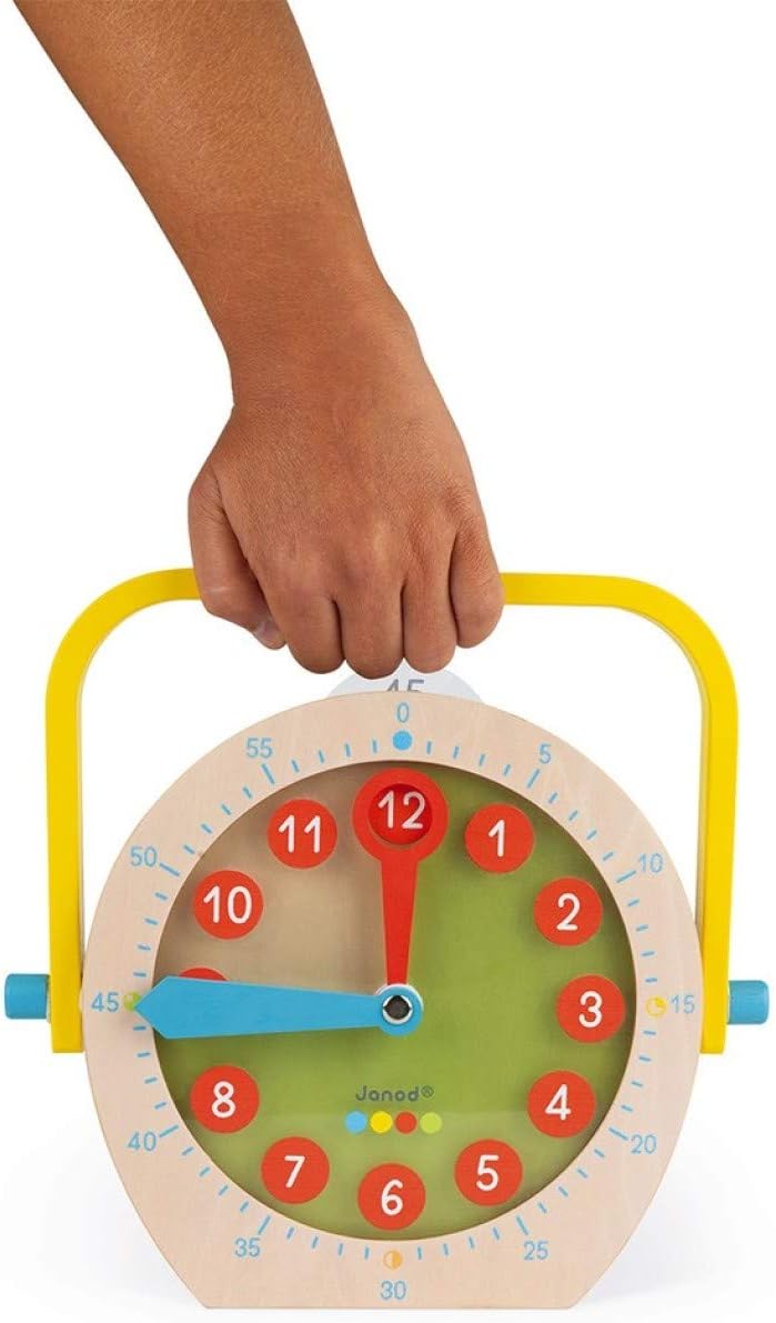 IMPARA L'ORA: Questo colorato orologio in legno dipinto d'acqua renderà l'apprendimento del tempo un momento allegro e divertente. Il bambino sarà in grado di riprodurre i 13 orari mostrati sulle schede modello spostando la grande lancetta delle ore e la piccola lancetta dei minuti. MODALITÀ DI GIOCO DIFFERENTI: Questo orologio intelligente consente di avvicinarsi all'apprendimento del tempo in modi diversi, al fine di variare le conoscenze del bambino e tenerlo curioso e interessato. Può semplicemente riprodurre le ore rappresentate sui fogli del modello a due lati (sulla parte anteriore del formato digitale e sul retro del formato analogico), ma è anche possibile creare le proprie combinazioni con il pennarello cancellabile sul foglio bianco fornito a questo scopo. Le schede "giorno" e "notte" così come le carte colorate ci permettono di comprendere le nozioni di ora del giorno e frazioni di ore (quarto d'ora, mezz'ora, ecc.) PRATICO E ALLEGRO: Orologio con una grande maniglia in legno, che rende più facile il trasporto ma può anche essere inclinato all'indietro per sostenere e stabilizzare l'orologio CARATTERISTICHE: L'orologio misura circa 24 x 23,8 cm e viene fornito con molti accessori: 13 carte modello fronte-retro, 1 carta bianca cancellabile con 1 pennarello rosso e 1 pennarello blu, 6 carte (giorno, notte e frazioni di ore) COLLEZIONE ESSENTIEL: La collezione Essentiel di Janod è caratterizzata da linee pulite, colori facilmente riconoscibili e legno naturale. Un'associazione perfetta per la scoperta degli apprendimenti fondamentali. I giocattoli Janod sono progettati in Francia, nel Giura, con particolare attenzione ai materiali utilizzati, allo stile e ai colori. Giocattoli e giochi originali, audaci, educativi e ben congegnati per accompagnare i tuoi figli nel loro sviluppo e nello sviluppo cognitivo, psicomotorio e socio-emotivo.