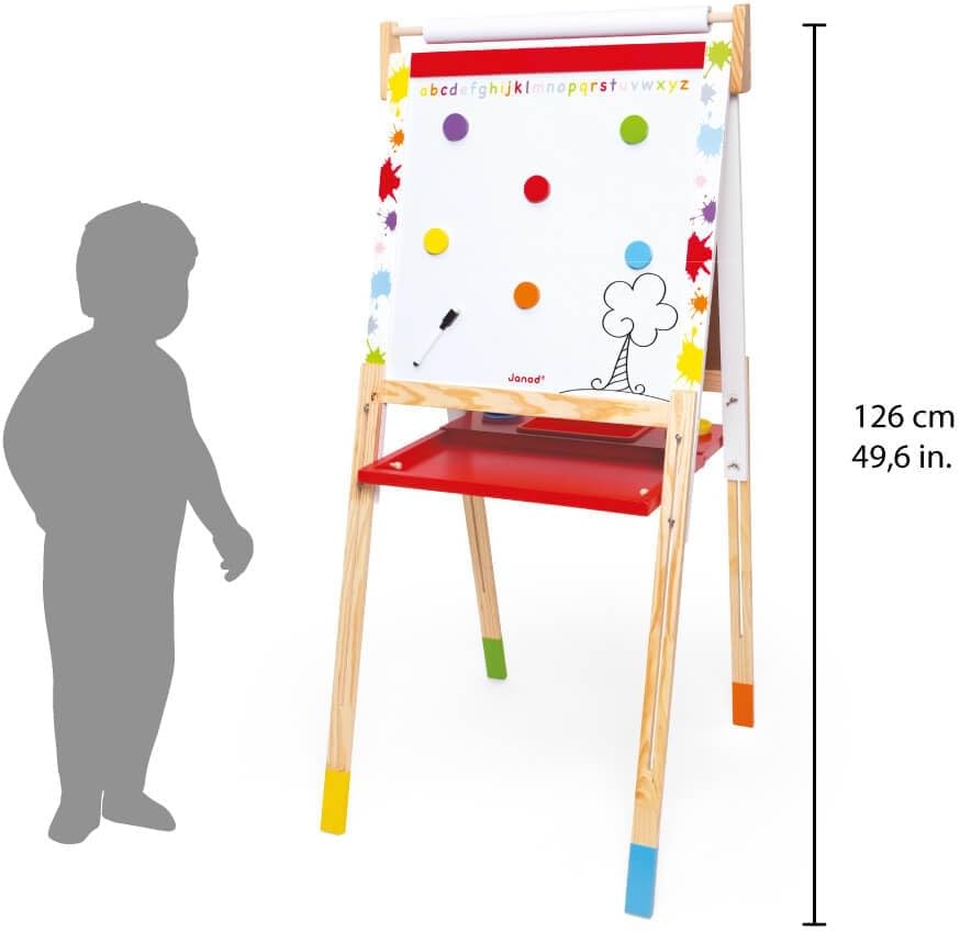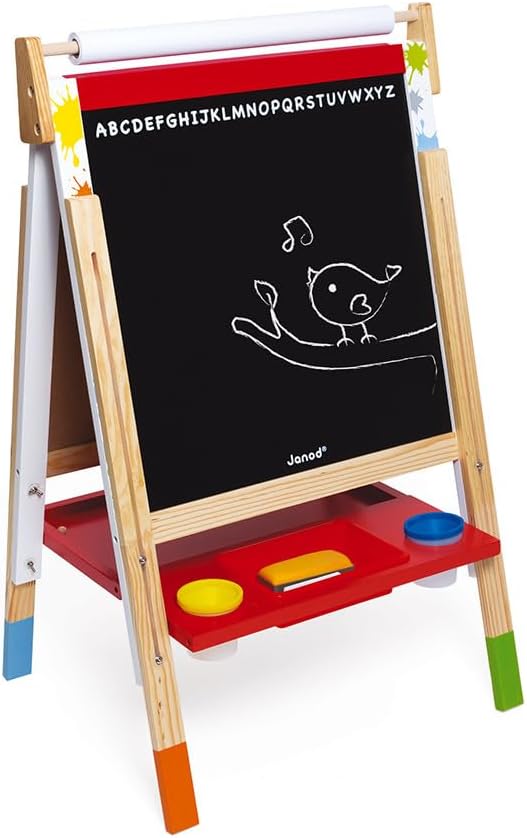 GIOCA, DISEGNA, SCAMBIA: Una lavagna per bambini in legno dalle tante funzioni educative e ricreative: permette ai bambini dai 3 anni di giocare all'insegnante, di esprimersi disegnando e cancellando e infine di esercitarsi scoprendo, ad esempio, come utilizzare gesso e pennarello. DUE LATI, DUE SUPERFICI DI ESPRESSIONE: Le due grandi superfici di disegno permettono a due bambini di giocare contemporaneamente su ciascun lato del cavalletto. Un lato con lavagnetta bianca magnetica per pennarello cancellabile e un lato con lavagnetta nera per scrivere con il gesso (Superficie di scrittura: 47 x 47,5 cm). Il rotolo di carta posto sulla parte superiore permette al bambino di realizzare grandi disegni con i tradizionali pennarelli o con la pittura (non inclusa). SCALABILE E PRATICO: I piedi di questa tavola scolastica sono regolabili da 91 a 126 cm, la tavola Janod può così adattarsi al bambino in crescita e permettergli di utilizzarla più a lungo. Pratico, il pannello si ripiega per riporlo facilmente, ad esempio dietro una porta. Include uno scaffale che ti consente di avere tutta la tua attrezzatura a portata di mano. 13 ACCESSORI INCLUSI La lavagna viene fornita con tutto il necessario per iniziare a giocare e creare senza indugi: 6 magneti per magnetizzare i tuoi fogli, i tuoi disegni, una scatola di 10 gessetti per ardesia, 1 pennarello cancellabile, 1 rotolo di carta, 1 pennello per cancellare e 3 vaschette per dipingere in plastica. DESIGN FRANCIA: I giocattoli Janod sono progettati in Francia, nel Giura, con particolare attenzione ai materiali utilizzati, allo stile e ai colori. Giocattoli e giochi originali, audaci, educativi e premurosi per sostenere i vostri bambini nella loro crescita e sviluppo cognitivo, psicomotorio e socio-emotivo.