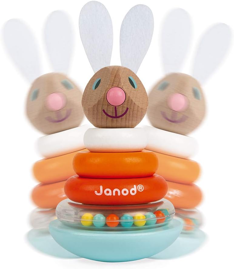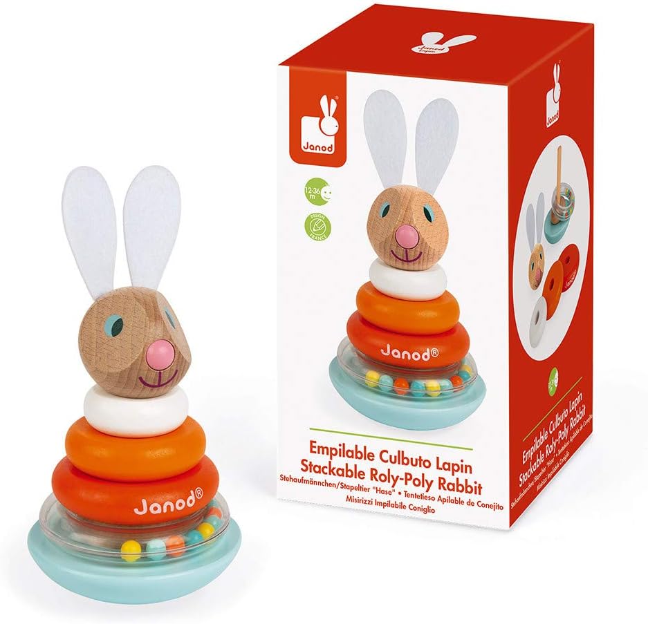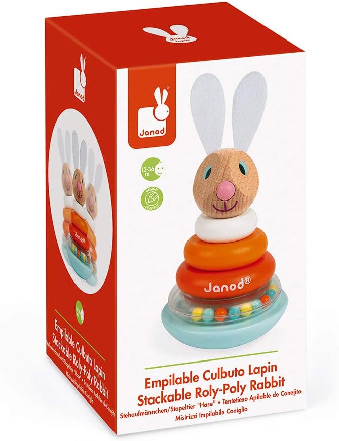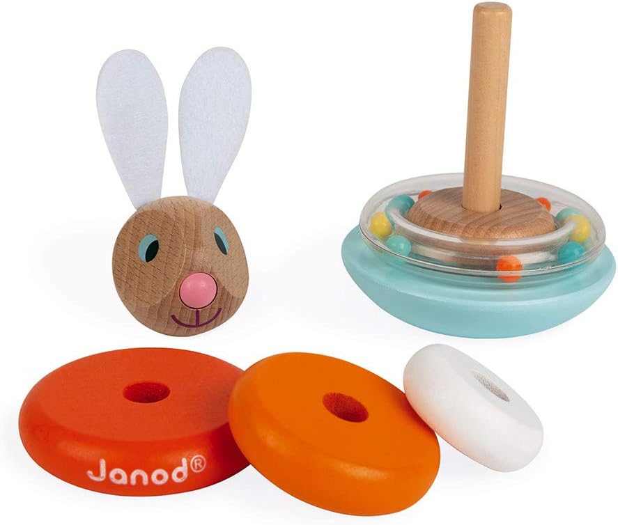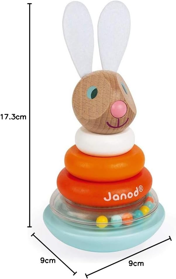 Coniglio da ricomporre impilando i 4 pezzi per ottenere una caduta Ausgestattet mit einem Ring mit farbigen Perlen Hasenohren aus Filz Ideal für die Entwicklung der motorischen Fähigkeiten
