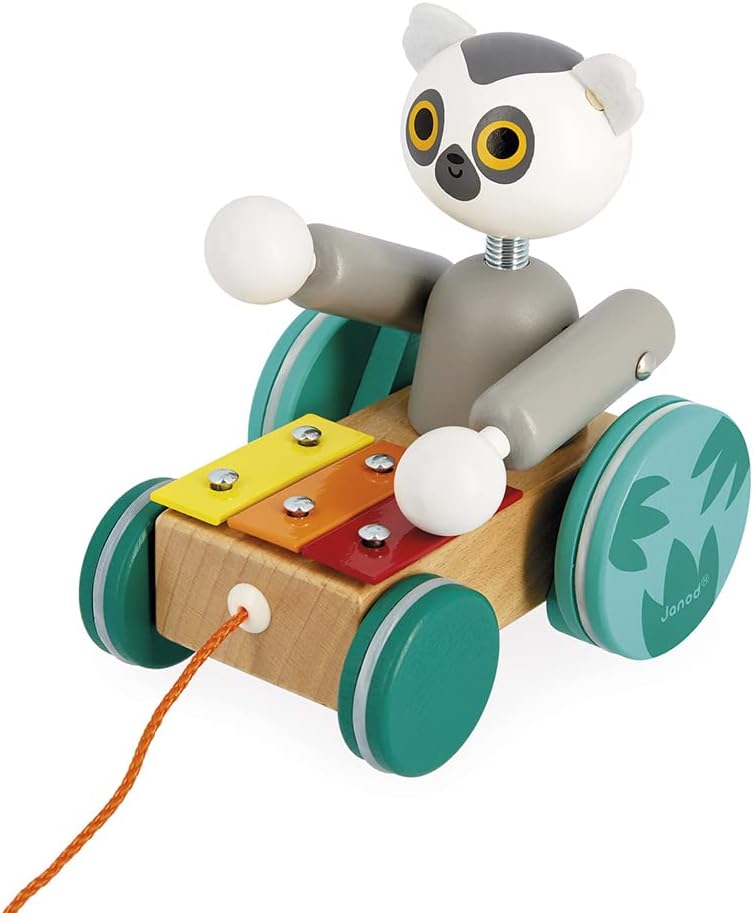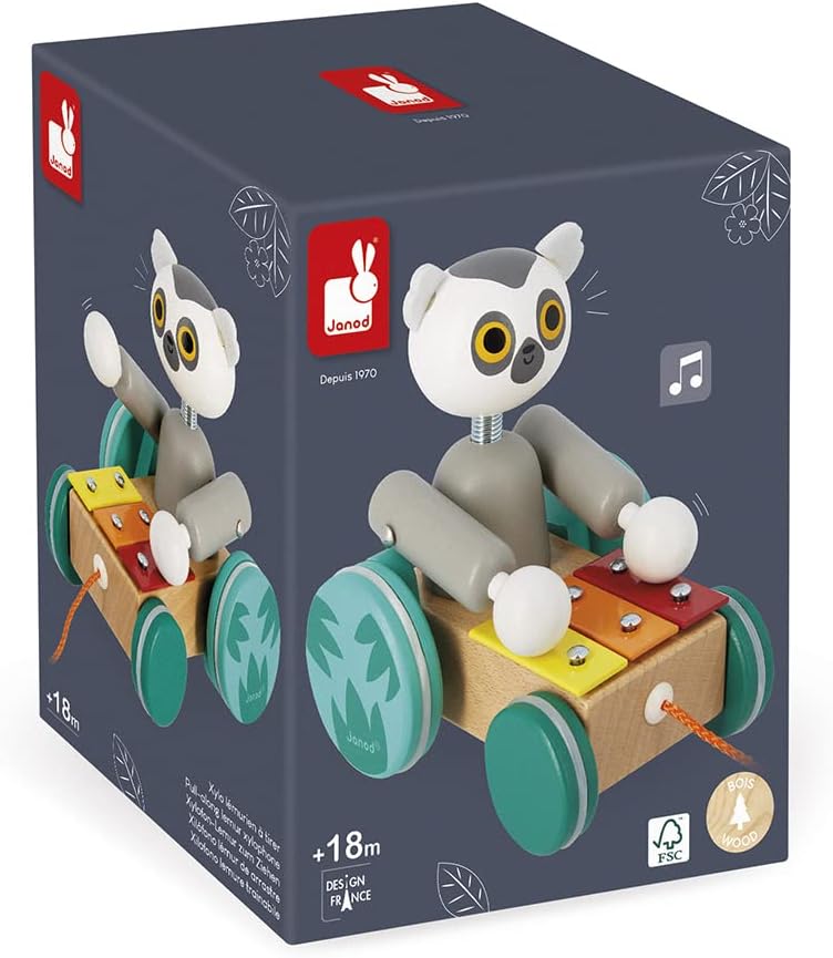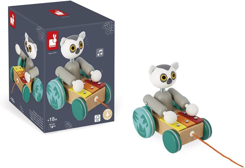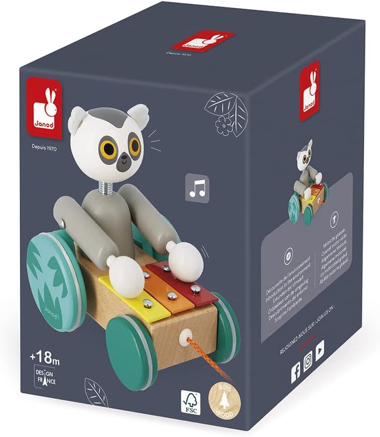 LEMURE DIVERTENTE DA TRAINARE: i bambini si innamoreranno di questo piccolo giocattolo da traino in legno certificato FSC, con le braccia articolate e la testa dondolante. Sotto i suoi occhi attenti, il neonato muoverà i suoi primi passi ed esplorerà l'ambiente che lo circonda in modo divertente, senza rischi per i pavimenti grazie alle ruote rivestite in gomma progettate per non lasciare tracce. GIOCATTOLO MUSICALE CON XILOFONO: grazie al loro nuovo amico che li seguirà ovunque a ritmo di musica, i più piccoli scopriranno suoni diversi e affineranno il loro udito, un primo passo verso la sensibilità musicale, un'abilità fondamentale necessaria per il loro sviluppo. COLLEZIONE TROPIK: Janod propone una collezione completa di giocattoli educativi per la prima infanzia dai colori vivaci e sul tema della giungla tropicale! Farai la conoscenza di personaggi accattivanti, divertenti e colorati che decoreranno magnificamente la cameretta del neonato. CARATTERISTICHE : Contiene uno xilofono. Dimensioni del giocattolo : Lunghezza 13 cm x Larghezza 10,8 cm x Altezza 14 cm. Materiale(i) utilizzato(i) : Legno (faggio, schima), metallo. Fascia d'età consigliata : da 18 mesi a 36 mesi. DESIGN FRANCESE: i giocattoli Janod sono progettati in Francia, nella regione della Giura, ponendo particolare attenzione ai materiali utilizzati, allo stile e ai colori. Giochi e giocattoli originali, creativi, educativi e ideati per accompagnare i bambini durante la crescita e lo sviluppo cognitivo, psicomotorio e socio-emotivo.