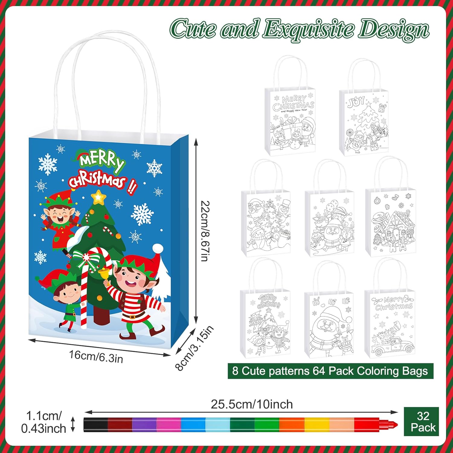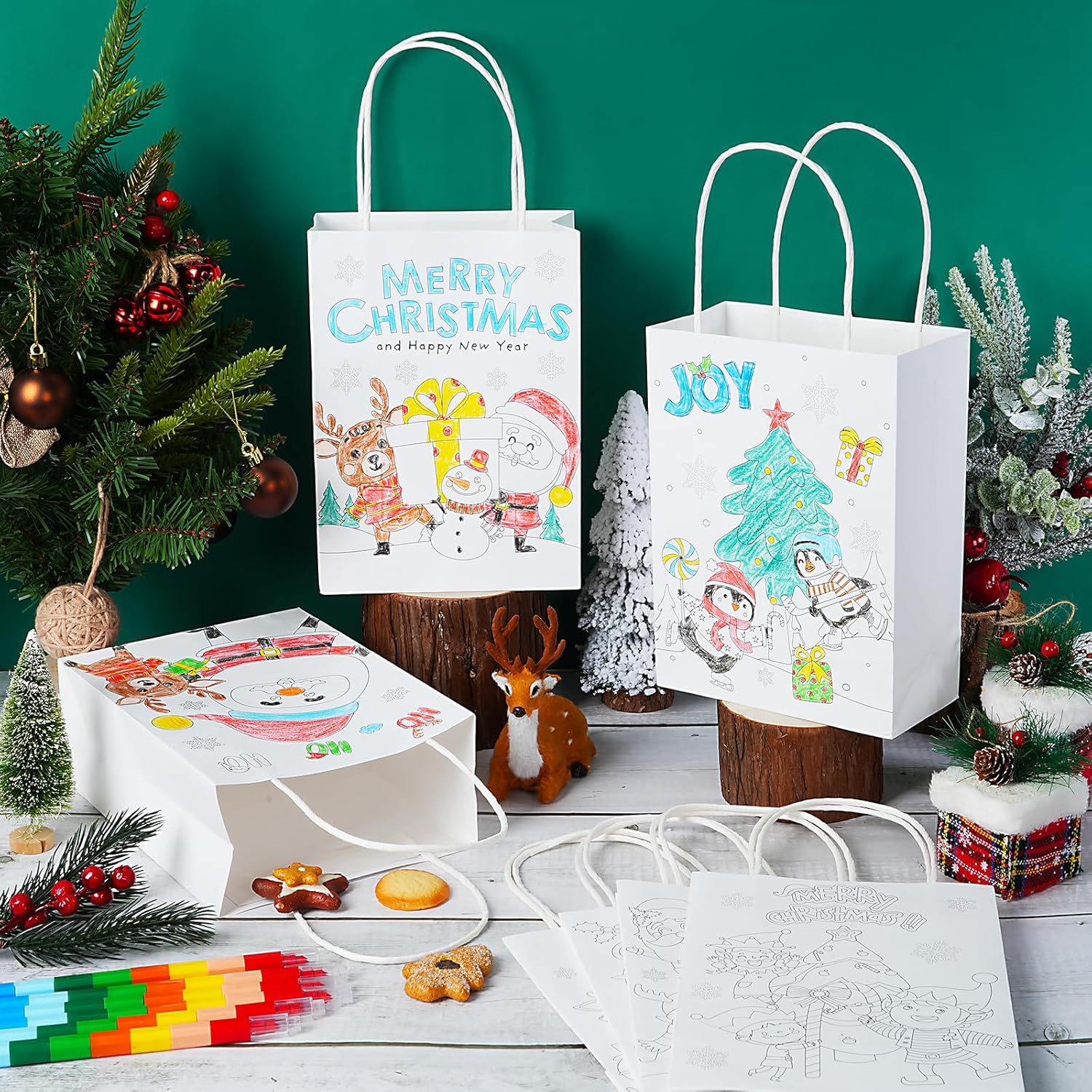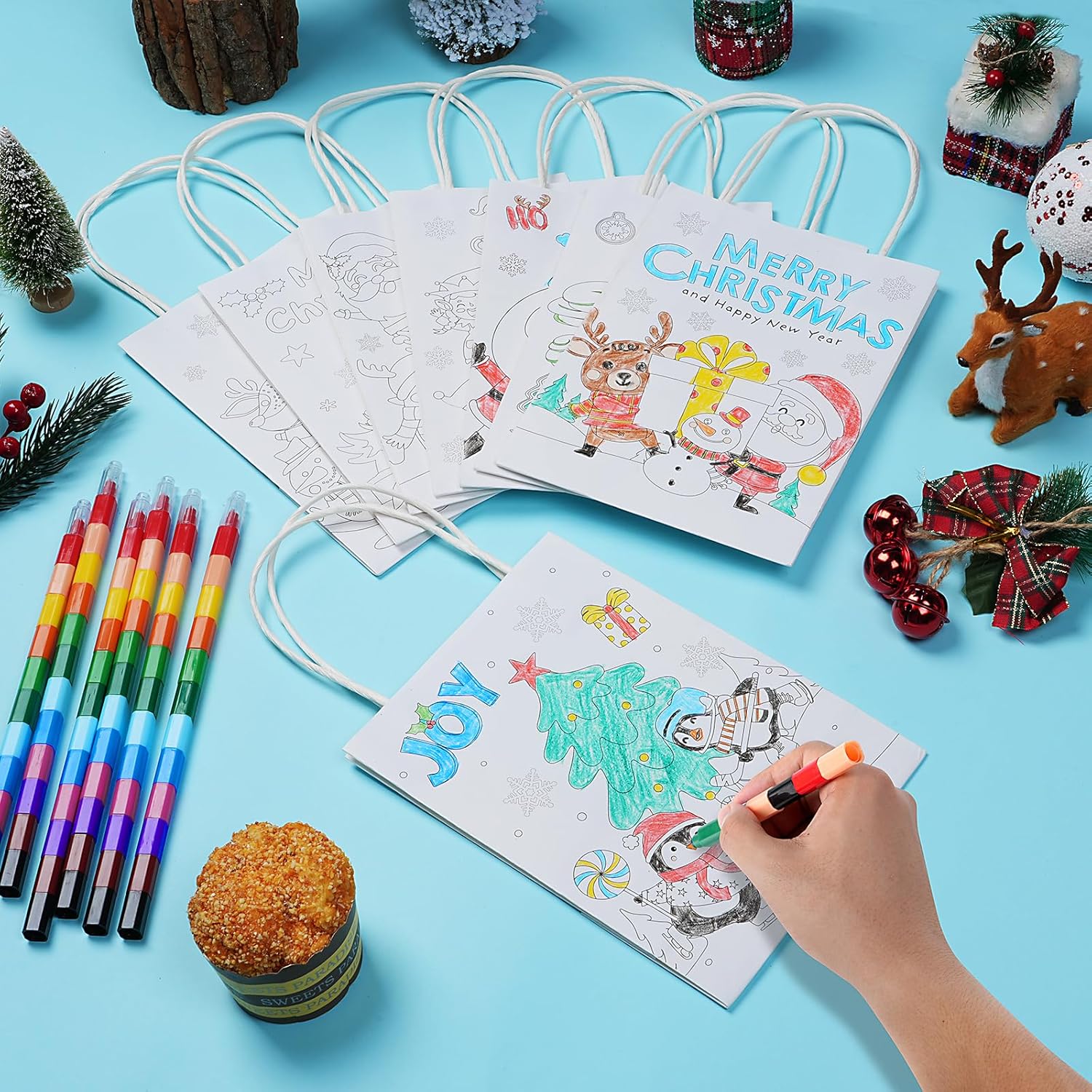 Cosa riceverai: 64 sacchetti regalo di Natale da colorare in 8 stili e 32 pastelli impilabili in 12 colori. Quantità sufficiente per soddisfare le diverse esigenze di confezione regalo e di utilizzo quotidiano. Divertenti sacchetti regalo natalizi da colorare: i nostri sacchetti regalo natalizi sono stampati con motivi di elementi natalizi: albero di Natale, pupazzo di neve, renna, pan di zenzero, camion, Babbo Natale e figlio, i diversi colori sui sacchetti regalo natalizi aggiungono una forte atmosfera festosa. Dimensioni adatte e materiale affidabile: i nostri sacchetti regalo natalizi sono realizzati in carta di alta qualità, misurano 22,1 x 8,1 x 16 cm, di buone dimensioni per mettere cioccolato, caramelle, piccoli giocattoli, una confezione regalo, dolcetti e facili da trasportare all'esterno. Le 12 matite colorate sfuse sono realizzate in paraffina e plastica, la lunghezza totale della penna è di 10 pollici con 12 colori. Crea i tuoi sacchetti regalo di Natale: questi sacchetti da colorare natalizi non sono solo per trasportare dolcetti, ma aumentano l'abilità pratica e la creatività e forniscono divertimento nella pittura e coltivano la loro immaginazione e creatività, tengono occupato e divertito. I destinatari saranno sorpresi da questi sacchetti regalo da colorare fai da te. Ampia applicazione: questi sacchetti per feste di Natale sono perfetti per lo scambio di regali di Natale, sacchetti di caramelle natalizie, sacchetti per dolcetti, biscotti ripieni, caramelle, cioccolato e così via. Allo stesso tempo, possono migliorare l'immaginazione e la creatività per colorare le proprie borse per Natale, compleanno o per l'uso quotidiano