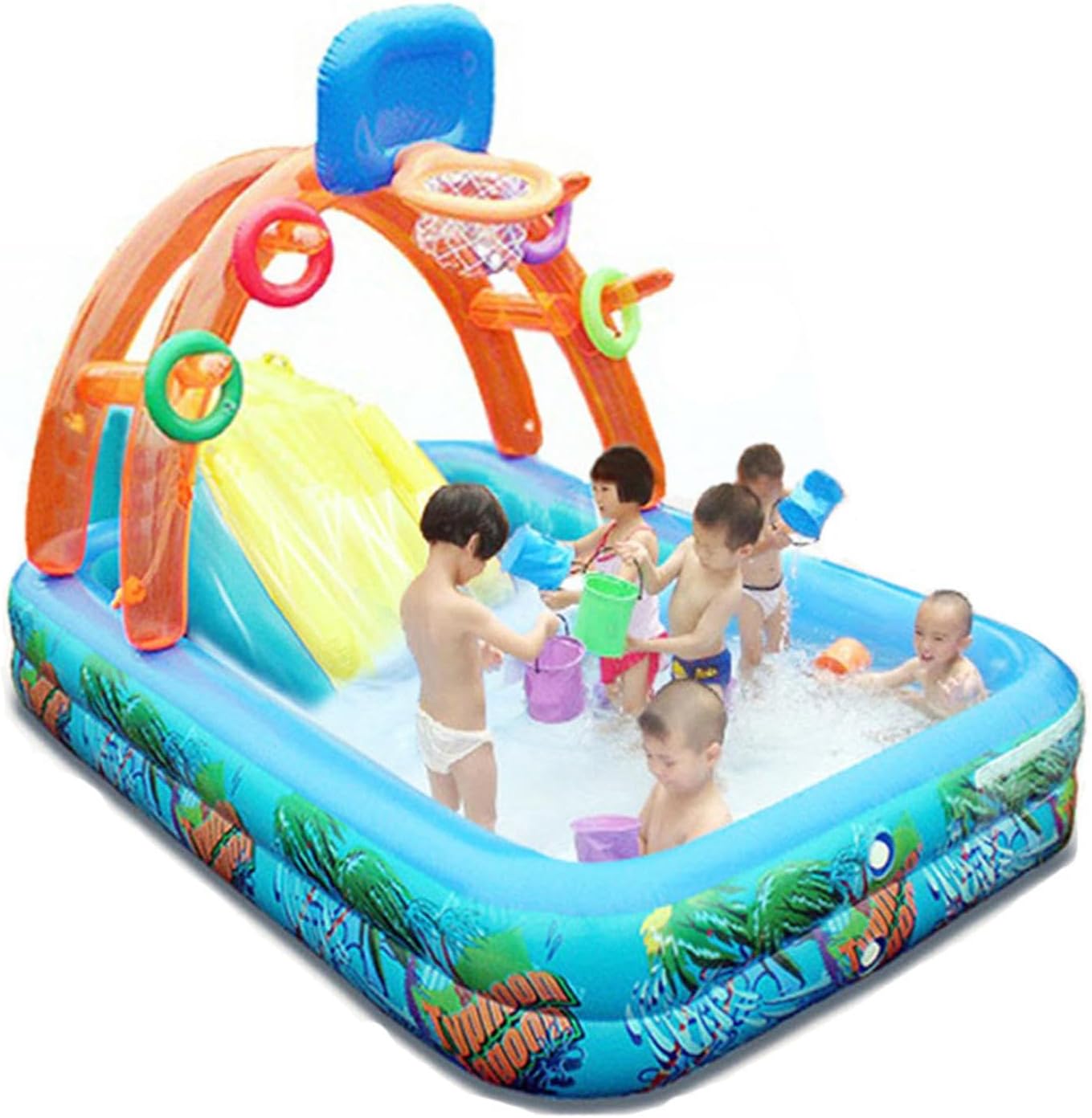 Divertente piscina per bambini con mostri. Dimensioni ± 205 x 190 x 84 cm. Altezza della piscina ± 18 cm, capacità 75% 170 L (44 galloni) Si collega al tubo dell'acqua per la funzione di spruzzo. Realizzato in resistente PVC da 0,25 mm/0,27 mm/0,30 mm Adatto per bambini dai 2 ai 6 anni, sotto la supervisione di un adulto Include: piscina con scivolo, mostri e anelli da lancio.