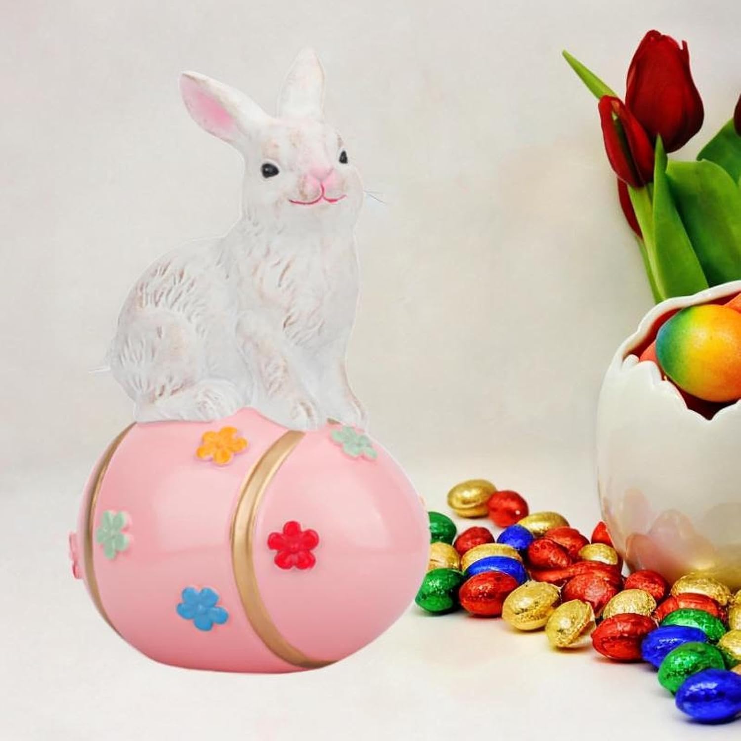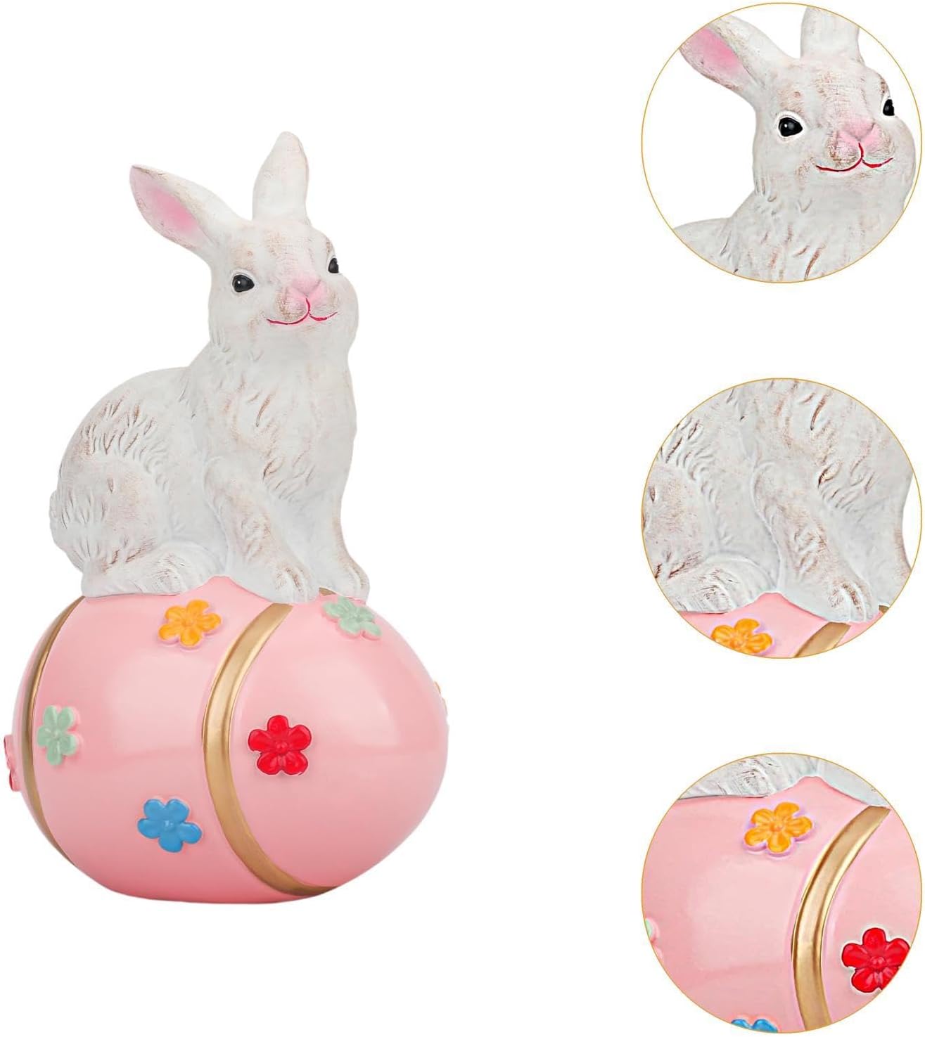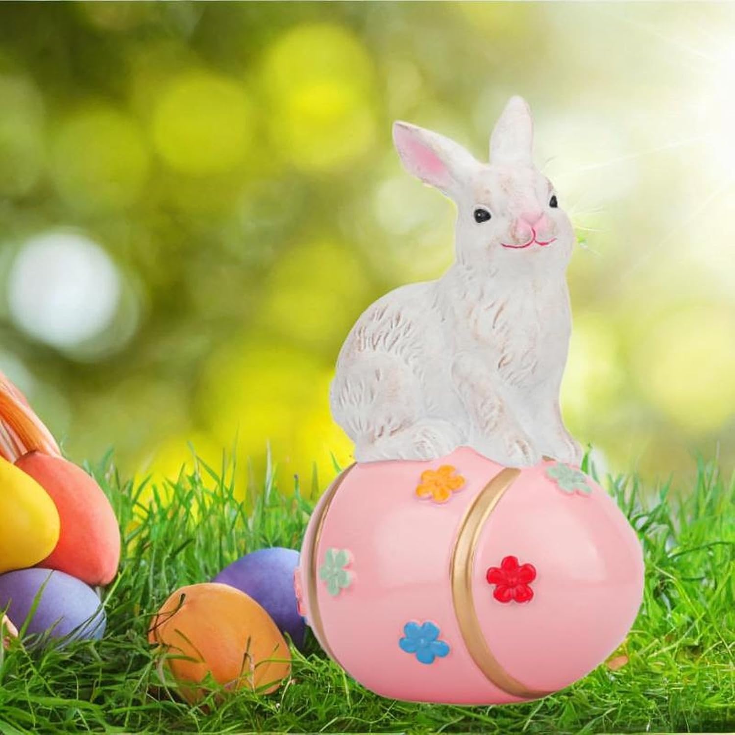 Affascinante decorazione pasquale: illumina il tuo spazio con questo delizioso coniglietto bianco seduto su un uovo di Pasqua splendidamente dipinto a mano, perfetto per accogliere la primavera nella tua casa. Dettagli artigianali: ogni fiore sull'uovo è meticolosamente dipinto a mano, rendendo ogni pezzo unico e un'aggiunta speciale ai tuoi ambienti interni o esterni. Robusto e versatile: realizzato in resina di qualità, questo affascinante arredamento è progettato sia per uso interno che esterno, rendendolo adatto per salotti, portici o giardini. Scelta regalo perfetta: delizia i tuoi cari con questo regalo premuroso per Pasqua, feste primaverili o come sorpresa per mogli e appassionati di arredamento stagionale. Fascino primaverile senza tempo: caratterizzato da un adorabile coniglietto e un uovo di Pasqua dai colori vivaci, questa statua aggiunge calore e gioia a qualsiasi tema decorativo festivo per tutta la stagione.