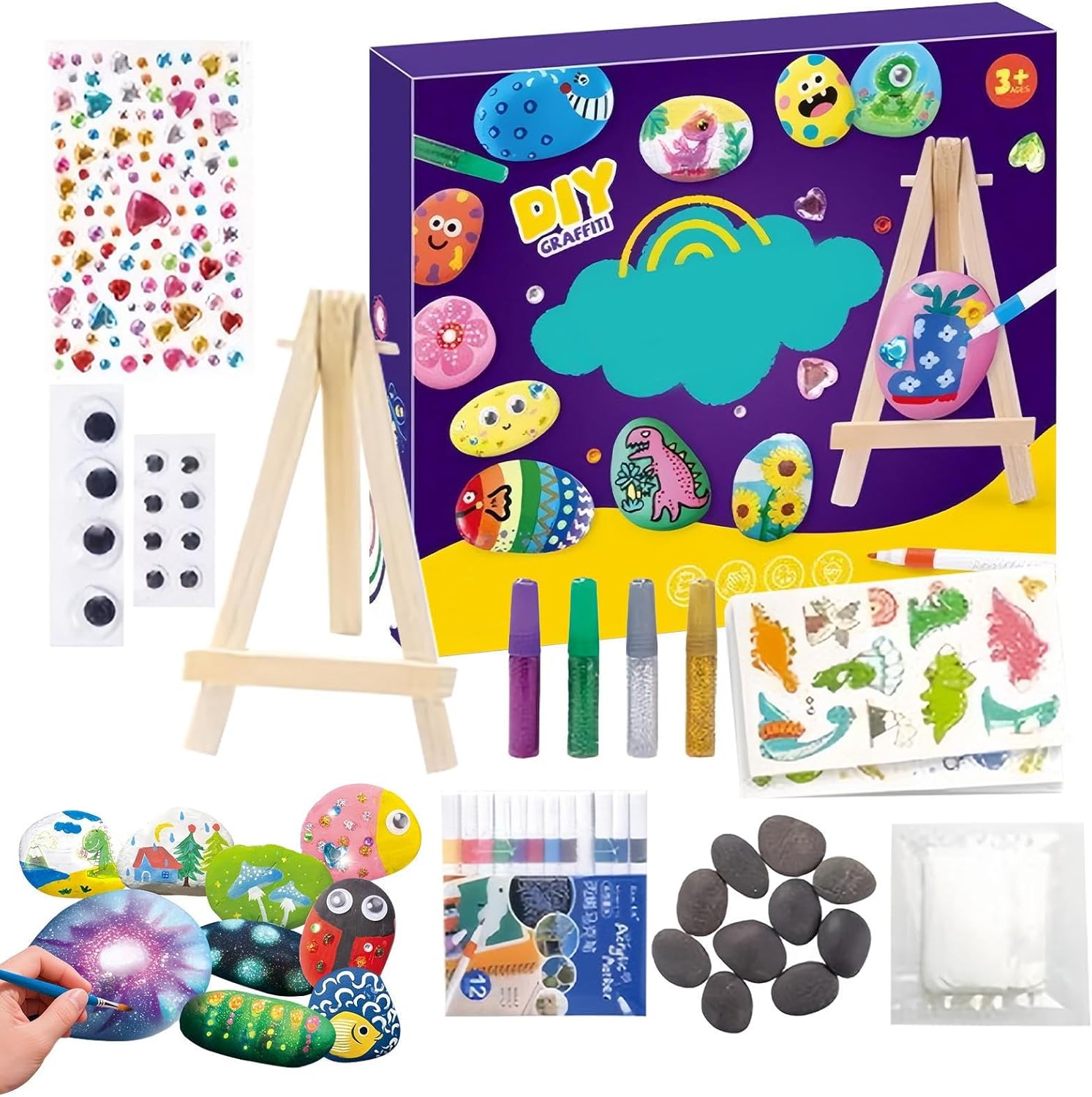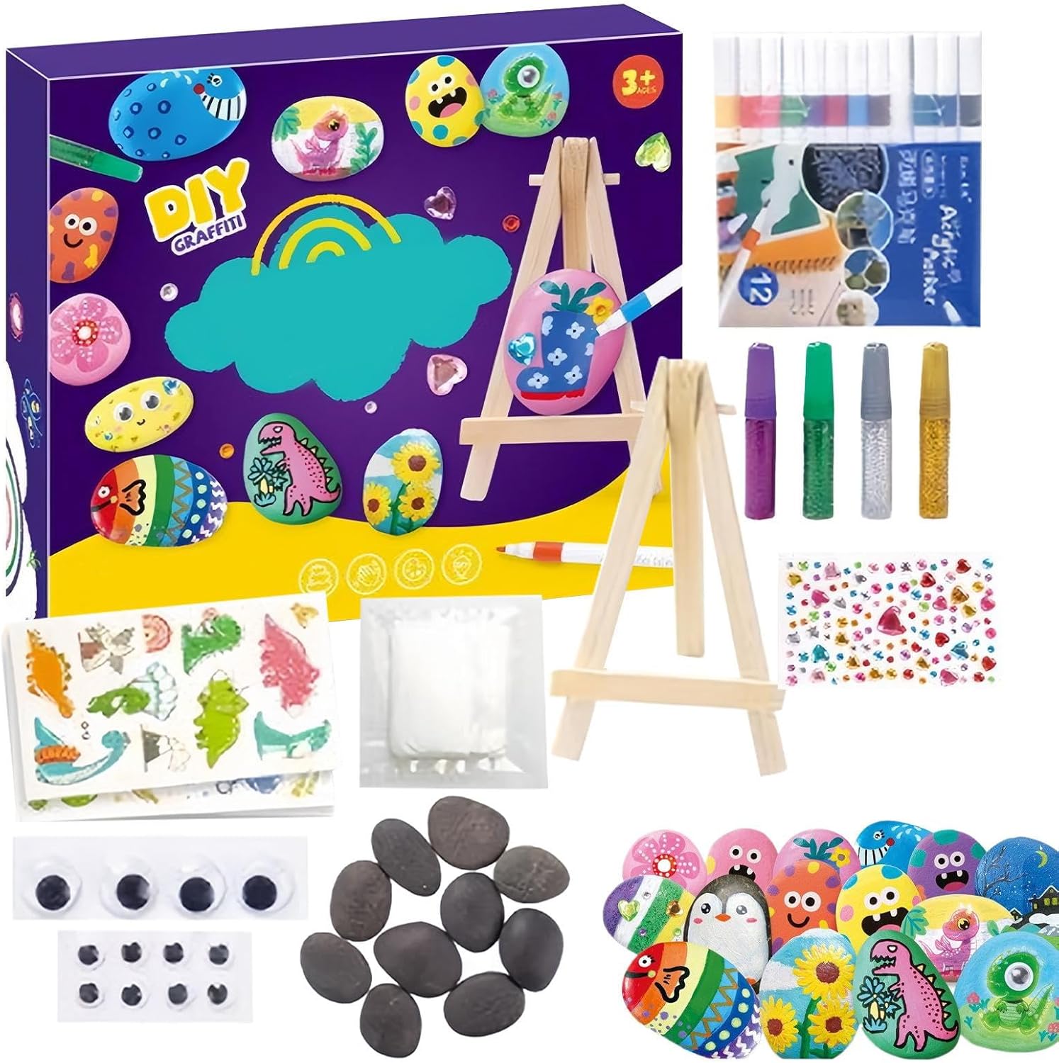 Set artistico pronto all'uso: Contiene pennelli e rocce per disegnare senza interruzioni, realizzare gradienti e stratificazioni con vernici luminose, tutto il necessario per creare dipinti su roccia brillanti direttamente dopo l'apertura del kit Sviluppo Creativo: Questo kit di pittura su rocce permette ai bambini di migliorare la concentrazione e il senso estetico, affinando le capacità di coordinazione dei colori e la consapevolezza spaziale, supportando idealmente la crescita artistica attraverso il coinvolgimento con progetti creativi tridimensionali su rocce Attività Artistiche Divertenti e Ispiratrici: I bambini possono creare in autonomia dai sei anni in su, utilizzando il kit per dipingere sassi con colori facili da stendere e pennelli dai manici arrotondati, promuovendo un'espressione artistica coinvolgente e adatta ai più piccoli in modo divertente e sicuro Creatività Notturna Ispiratrice: Realizza disegni avvincenti con sassi dipinti e pigmenti fluorescenti incorporati che brillano al buio, offrendo un'esperienza artistica luce-ombra unica e stimolando la creatività notturna con infinite possibilità creative Protezione Impermeabile Colori: Costruisce una barriera idrofoba per proteggere dallo sbiadimento causato dall'esposizione alla pioggia o all'acqua, preservando la brillantezza dei lavoretti artigianali con integrità cromatica costante e affidabile