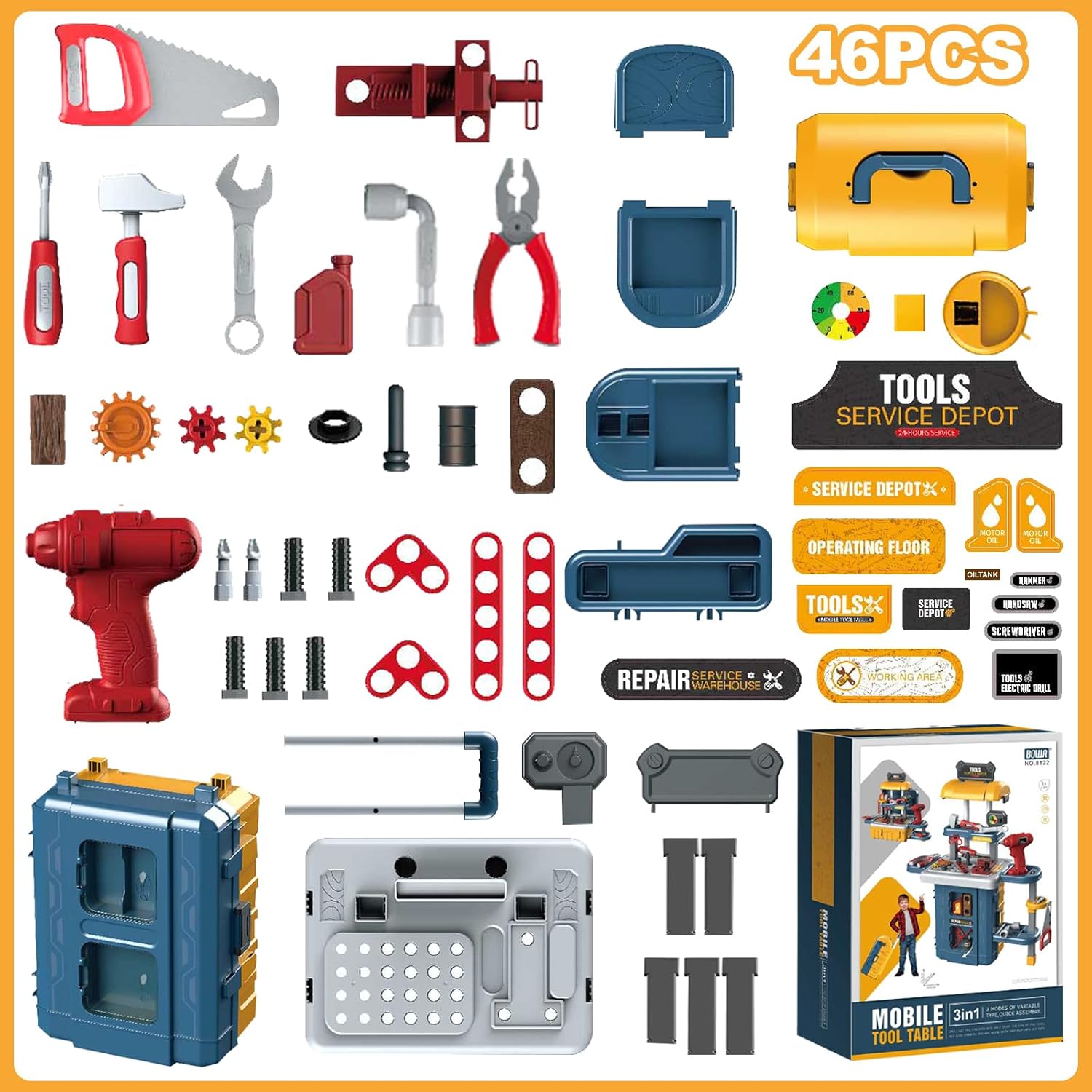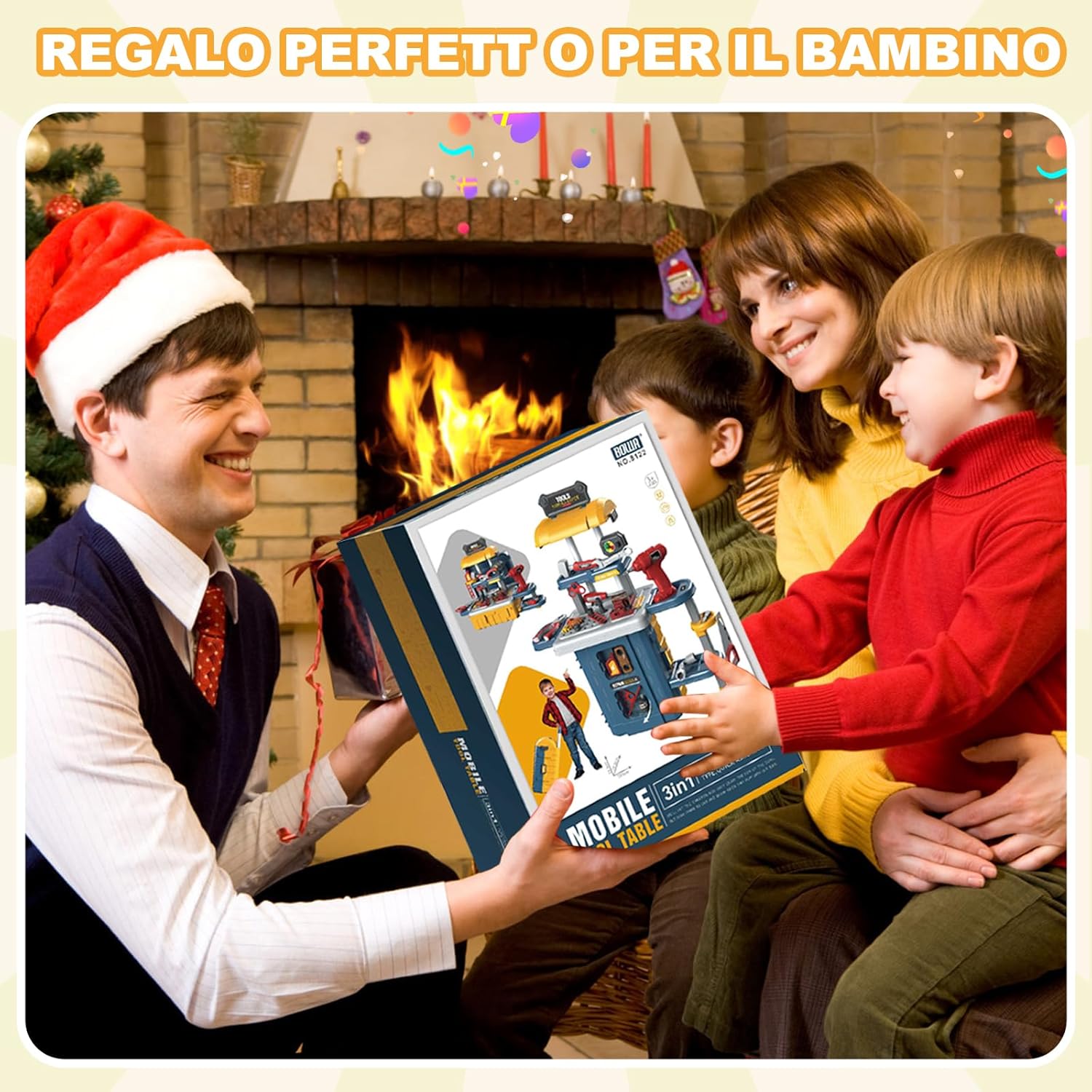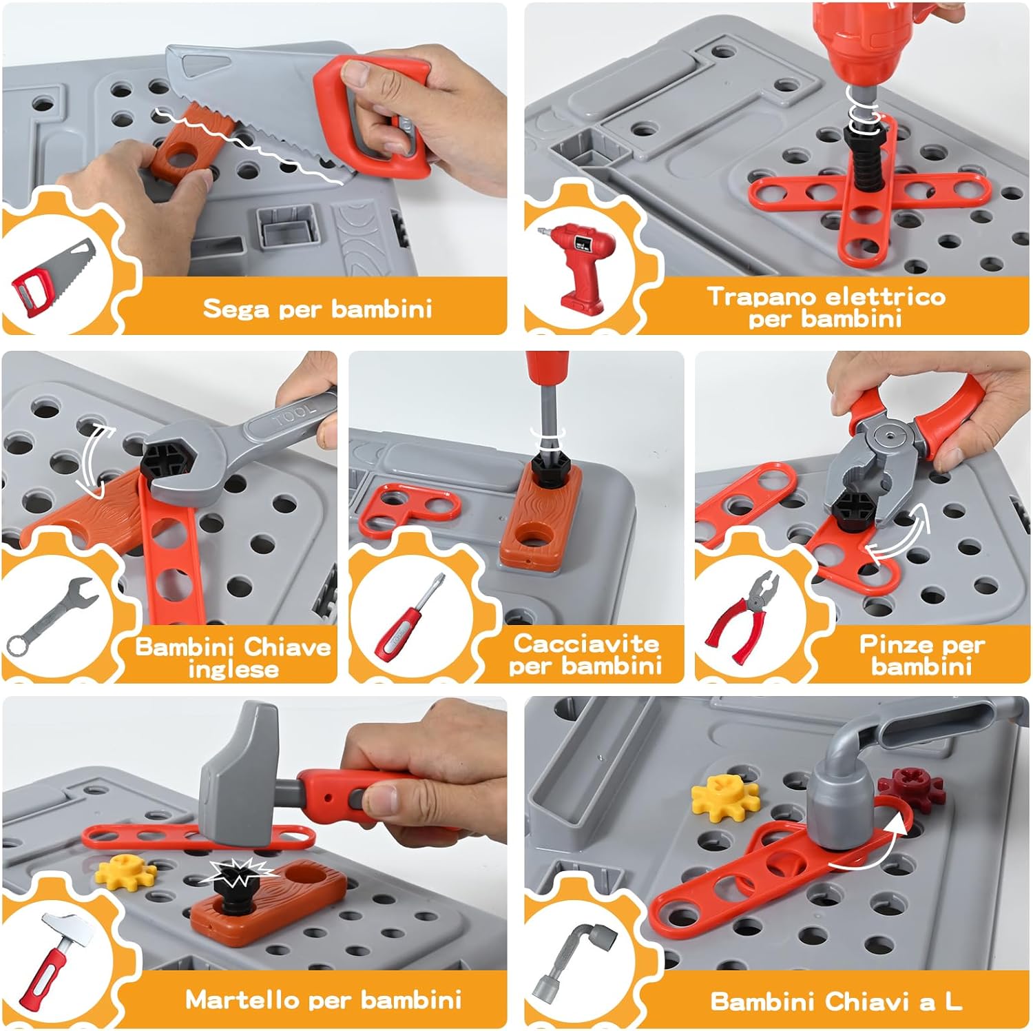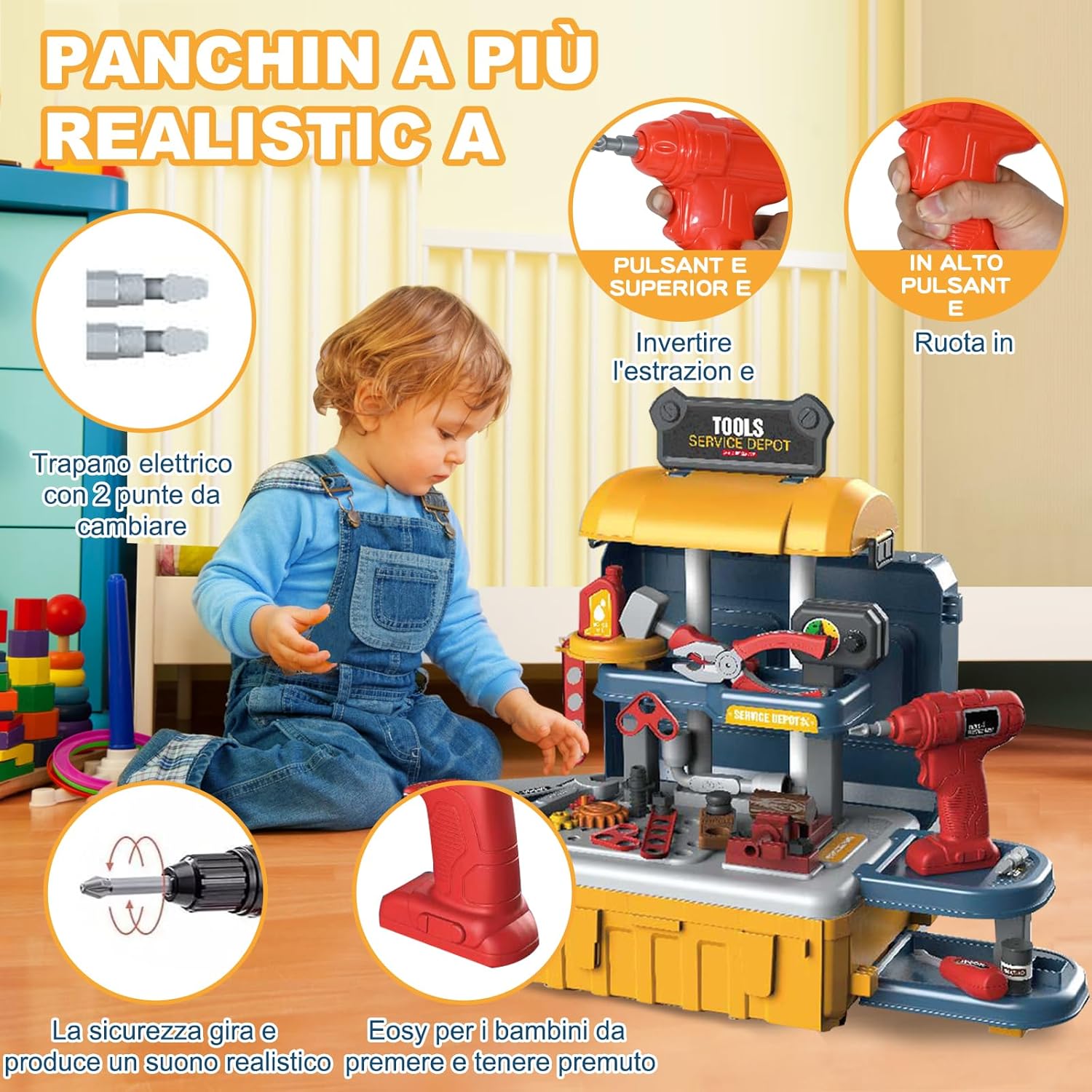 🧰 【Set di Banco da Lavoro Giocattolo 3 in 1】: Questa banco da lavoro multifunzionale per bambini può essere trasformata in tre forme: banco da lavoro, cassetta degli attrezzi portatile e valigia con ruote. Un unico giocattolo offre tre modi di giocare, consentendo ai bambini di divertirsi con il gioco di ruolo in diversi scenari. Una volta assemblato come banco da lavoro, le dimensioni sono 60 × 26 × 74 cm (23,4 × 10,4 × 28,9 pollici), con un'altezza moderata, adatta all'uso da parte dei bambini. ⚙️ 【Set di Attrezzi da 46 Pezzi】: Questo set di cassetta attrezzi bambini contiene 46 utensili e accessori comuni, tra cui un trapano giocattolo, un cacciavite, un martello, una chiave inglese, dadi, trucioli di legno e altro ancora. La gamma completa simula situazioni di lavoro reali, aiutando i bambini a conoscere gli utensili e a sviluppare le loro capacità manuali attraverso il gioco. 🔩 【Esperienza Reale con Utensili Elettrici】: Il trapano elettrico giocattolo incluso può ruotare in senso orario/antiorario, è dotato di luci e effetti sonori realistici e riproduce scenari di utilizzo reali (richiede 2 batterie AA, non incluse). Il design del vano batterie rimovibile è più vicino all'uso reale e permette ai bambini di comprendere il principio di funzionamento degli utensili mentre giocano. 🔨 【Giocattoli Cassetta Attrezzi Educativi per Bambini】: Attraverso l'assemblaggio e l'uso degli attrezzi, i bambini possono esercitare la coordinazione occhio-mano, il pensiero logico e le capacità manuali, stimolando la creatività e la capacità di risolvere i problemi. Questo set di attrezzi da lavoro bambini non è solo un giocattolo divertente, ma anche un ottimo strumento per l'educazione precoce. 🔧 【Il Regalo Perfetto per le Feste】: Che si tratti di un compleanno, di Natale o di un momento di interazione genitore-figlio, questo set di attrezzi da lavoro bambini è il regalo ideale per i bambini dai 3 anni in su. Adatto sia al gioco individuale che all'interazione genitore-figlio, è una scelta di qualità che unisce divertimento e valore educativo.