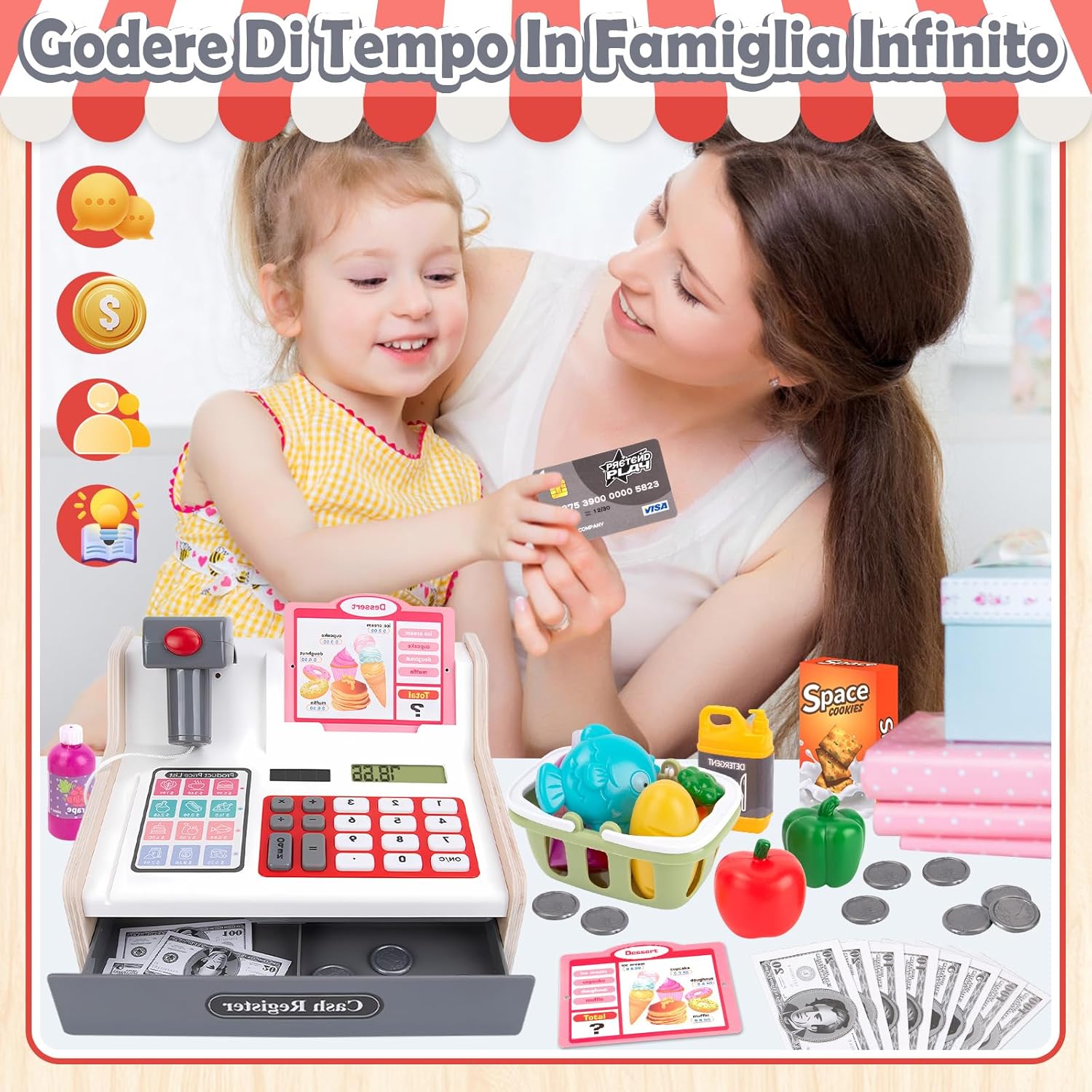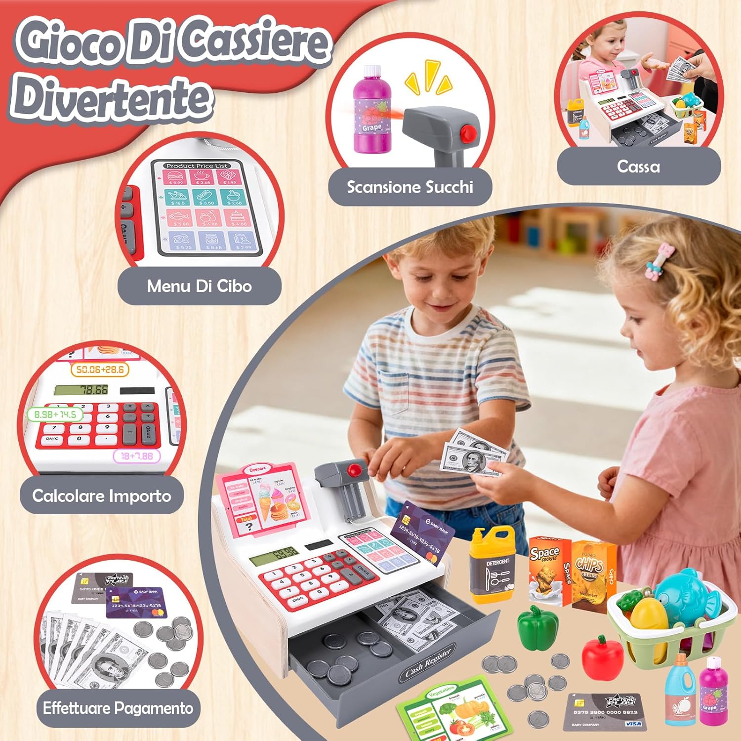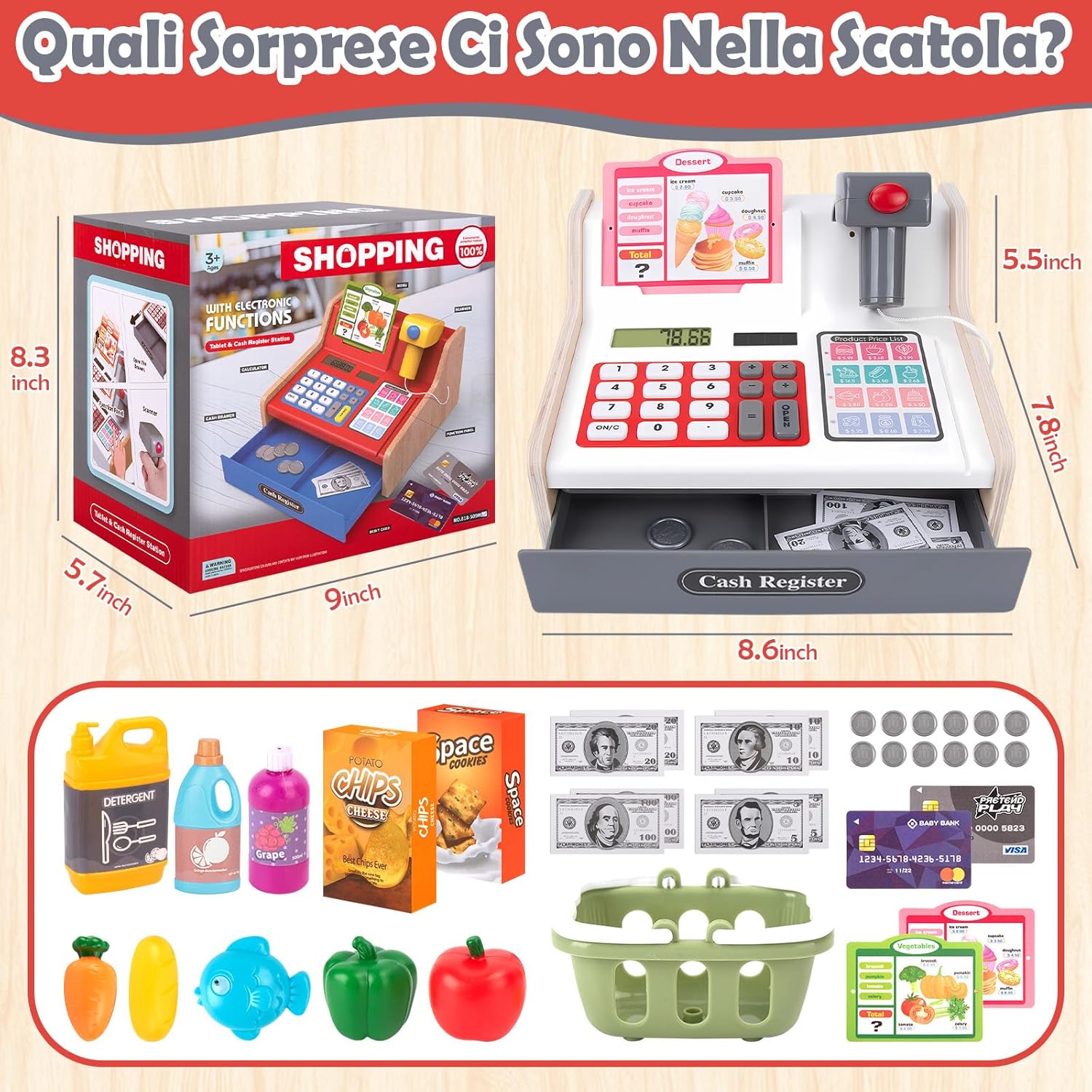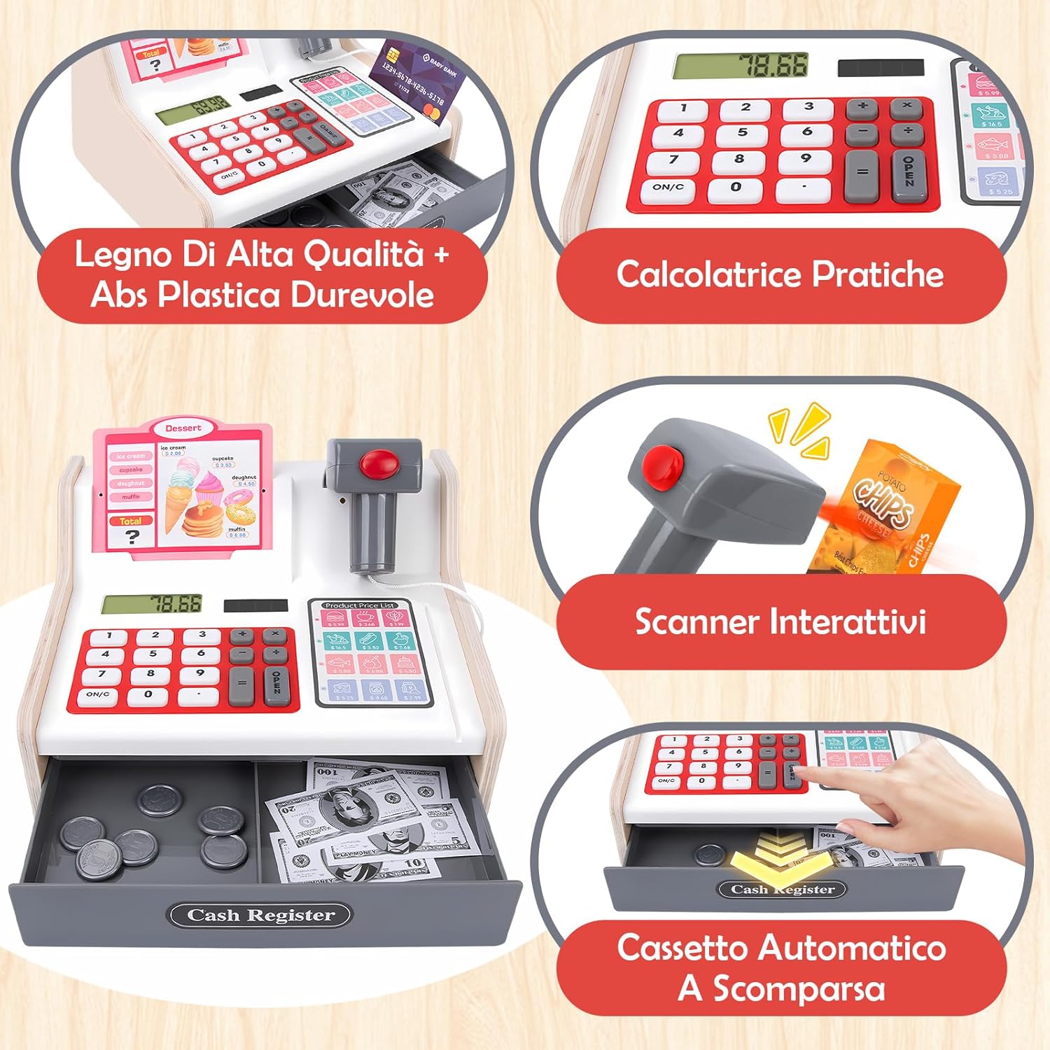 🛒【Cassa Giocattolo in Legno per Bambini Aggiornato】 Questo robusto registratore di cassa giocattolo è realizzato in legno e PVC di alta qualità, con un design elegante ma giocoso. Dotato di calcolatrice completamente funzionante, cassetto portadenaro automatico e scanner con effetti sonori e luminosi (emette autentici segnali acustici e luci rosse), immerge i bambini in scenari di cassa del supermercato. 🛒【40 Accessori Supermercato Giocattolo per Giochi Di Ruolo】 Questo cassa supermercato giocattolo per bambini include: 1 scanner con luci/suoni, 1 cestino della spesa, 8 soldi finti + 16 monete, 2 scatole di snack, 2 carte di credito giocattolo, 2 menu, modelli di alimenti (verdura, frutta, pane, pesce, succhi, ecc.) e detersivo per piatti, completo di cavo di ricarica. Il cassetto della cassa giocattolo si apre automaticamente per simulare transazioni autentiche, stimolando la creatività e il gioco imitativo. 🛒【Imparare Giocando, Divertirsi Con L'istruzione】Ricreando scenari di acquisti al supermercato, i bambini imparano la categorizzazione dei prodotti, il calcolo dei prezzi e l'elaborazione delle transazioni (pagamenti in contanti e con carta). Il registratore di cassa bambini supermercato dotato di scanner non solo affina il pensiero logico e le abilità aritmetiche di base, ma migliora anche le capacità di comunicazione e cooperazione, rendendo l'apprendimento coinvolgente piuttosto che noioso. 🛒【Materiali di Alta Qualità e Struttura Robusta】 Realizzato in legno di alta qualità e plastica ABS con bordi lisci e senza sbavature, questo gioco cassa supermercato bambini è atossico, inodore e soddisfa gli standard di sicurezza dei giocattoli per bambini. Certificato ASTM e CPSIA, la sua struttura robusta garantisce durata e sicurezza durante il gioco. Progettato specificamente per i bambini piccoli. 🛒【Il Regalo Perfetto per Bambini 3 Ai 9 Anni】Questo cassa giocattolo per bambini è un regalo ideale per i compleanni dei bambini, Natale, feste o festeggiamenti di Capodanno. Attraverso giochi di ruolo e giochi di shopping, stimola l'immaginazione mentre alimenta sottilmente la consapevolezza finanziaria e le abilità correlate. Il nostro registratore di cassa giocattolo in legno è perfettamente adatto a bambine e bambini di 3, 4, 5, 6, 7, 8 e 9 anni.