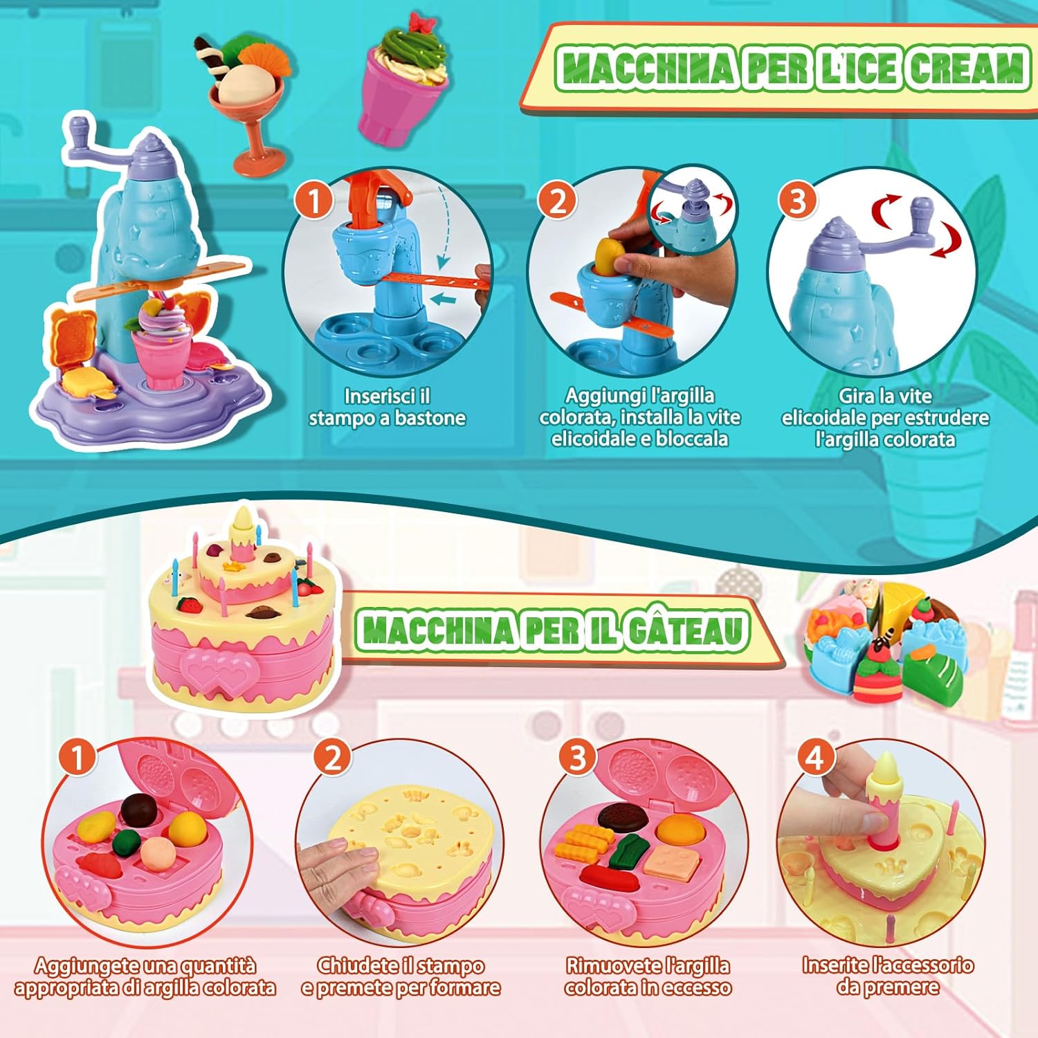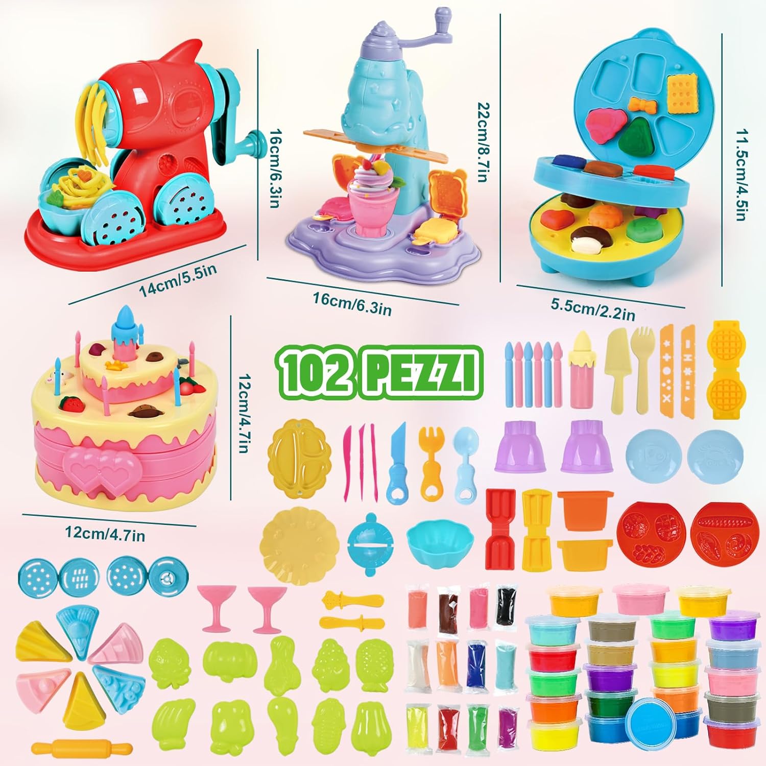 🍨【102 Pezzi di Plastilina per Bambini】: Questo set di plastilina bambini contiene 36 pezzi di pasta da gioco colorata e un'infinità di accessori: gelatiera, spaghettatrice, creatrice di torte, creatrice di hamburger, stampi per animali, stampi per alimenti, stampi per forme geometriche, una varietà di strumenti per modellare, posate, ciotole, tazze, piatti, bacchette e altro ancora. Tutti gli accessori sono inclusi, non è necessario acquistarne altri, per soddisfare la produzione creativa e il gioco libero del bambino! 🍆【Alta Qualità】: Gli accessori per la plastilina da gioco sono realizzati con materiali di alta qualità, leggeri, resistenti e colorati, che permettono al bambino di esercitarsi nella pratica. Lavorazione raffinata, senza bordi taglienti e senza sbavature, per consentire ai bambini di giocare e divertirsi. Plastilina a base di farina di grano commestibile, non grassa, non appiccicosa, riutilizzabile, sicura al 100%. 🍜【Giocattoli Educativi】: La pasta giocattolo è facile da modellare in qualsiasi forma e i bambini possono usare diversi tipi di stampi per creare modelli creativi di argilla come spaghetti, gelato, cibo, frutta e così via. La pasta da gioco colorata arricchisce anche la vista dei bambini e favorisce la percezione dei colori. 🥟【Facile da Usare】: Questo formine per plastilina è stato appositamente progettato per le piccole mani dei bambini, semplice da usare e facile da padroneggiare. I bambini devono solo mettere la pasta da gioco colorata nello stampo e, premendo, tagliando, modellando e rotolando, possono creare tutti i tipi di “cibo”. 🍝【Regalo Perfetto per Bambini】: Se siete alla ricerca di un regalo emozionante ed educativo per compleanni, feste, Natale, Halloween, Pasqua o altre celebrazioni, allora il nostro set di plastilina play doh bambini è la scelta perfetta per voi! È il regalo perfetto per bambini di 3, 4, 5, 6 anni.