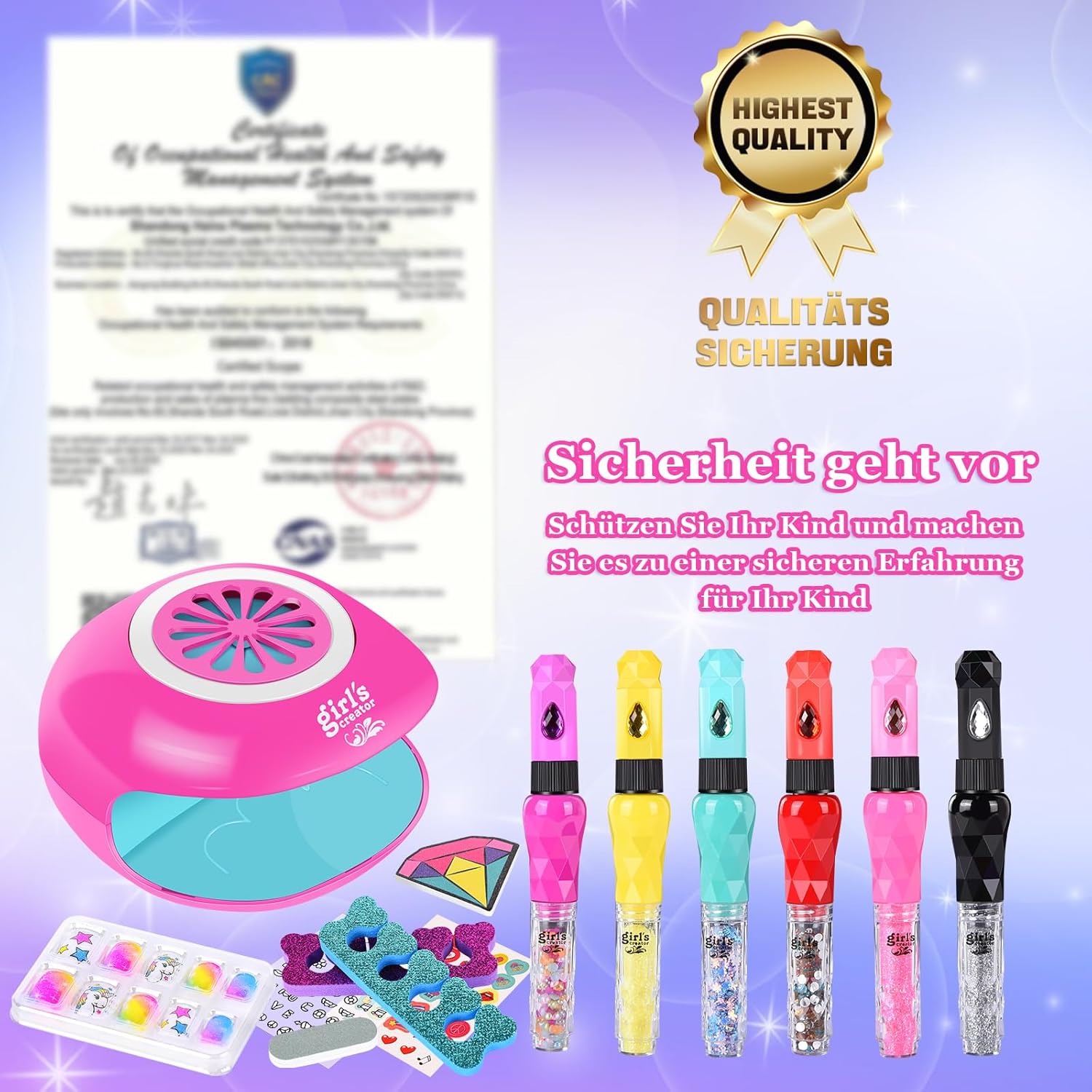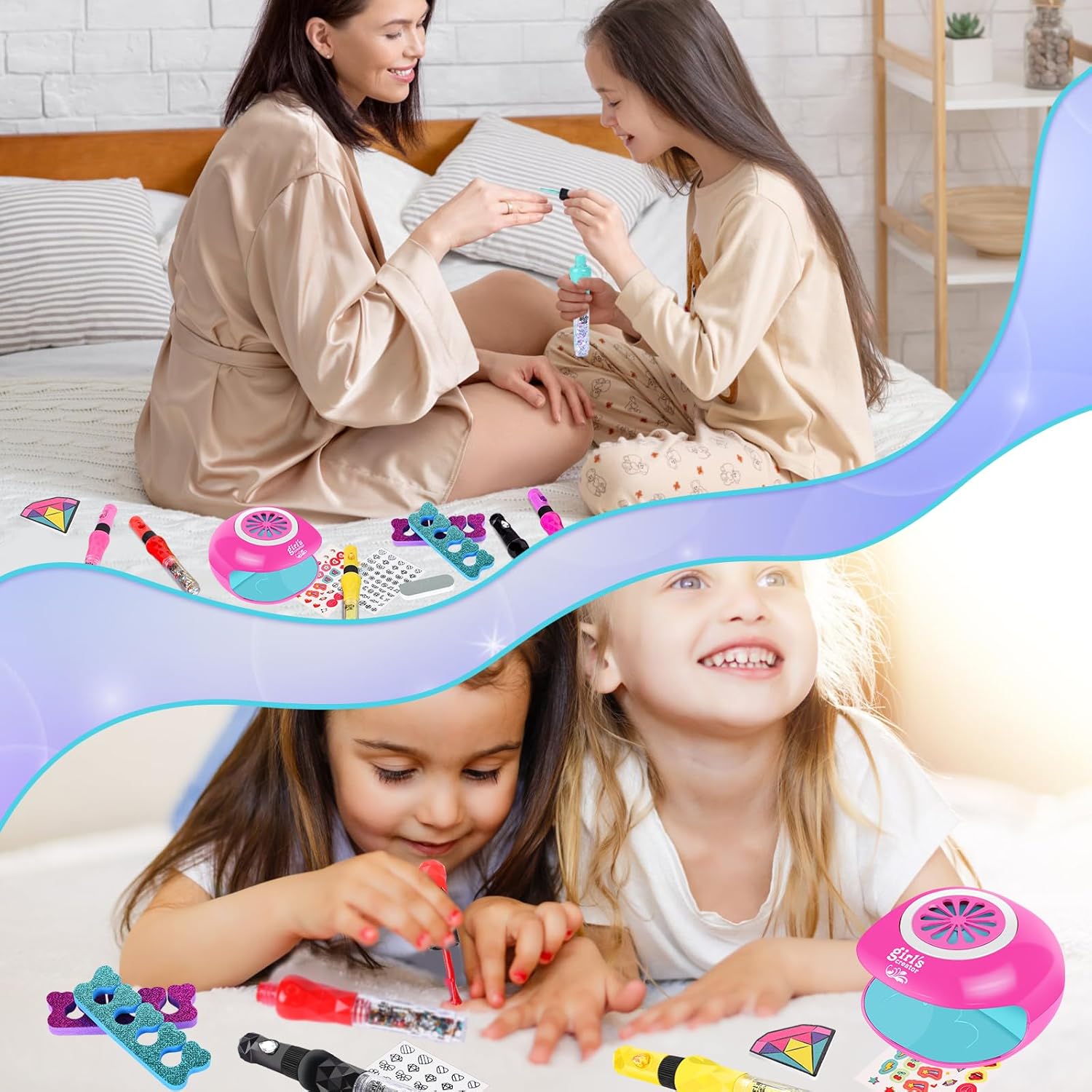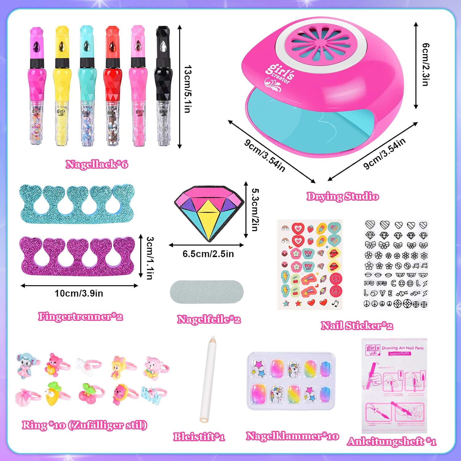 Kit salone per unghie da 33 pezzi per ragazze: penne per nail art 3 in 1*6, macchina per nail art*1 (asciugatura + effetto luce), lima per unghie*1, separatore per dita*2, adesivi per unghie*2, penna bianca*1, adesivi per unghie finite*1 (10 pezzi), anelli*10 (stili casuali). Le bambine possono creare la loro bellissima manicure migliorando al tempo stesso le loro capacità motorie e l'estetica visiva. Penna per nail art 3 in 1: le nostre penne per smalto sono progettate in modo unico e hanno tre funzioni. La penna per nail art può disegnare, spazzolare e abbellire diamanti per abbellire le tue unghie e dare alle tue unghie il disegno che hai immaginato. Il mini asciuga unghie è facile da usare, non solo puoi asciugare rapidamente le unghie, ma non danneggerà anche le unghie del tuo bambino. Design creativo per ragazze: il nostro design unico, le penne possono disegnare, spazzolare, punteggiare le unghie con la tua immaginazione, puoi anche disegnare, possono anche adattarsi bene ad adesivi, motivi sagomati, soddisfare i pensieri interiori delle ragazze. Può consentire alle ragazze di usare la loro immaginazione illimitata per creare unghie colorate, che possono portare più felicità alle ragazze di 6-12 anni. Materiale adatto ai bambini: il set da salone per nail art per bambini è realizzato con ingredienti sicuri e di alta qualità a base d'acqua, lavabili e delicati sulla pelle. Si stacca facilmente dalle unghie e dalla pelle ed è sicuro da usare per i bambini. Ciò significa che i bambini possono creare bellissime unghie con lo smalto senza preoccupazioni. Regalo perfetto per ragazze: il regalo perfetto per il salone di bellezza per ragazze di 6 7 8 9 10 11 anni. Nail art principessa fai da te per bambini come regalo per ragazze. Man mano che apprezzi la bellezza, diventi più concentrato e paziente. Puoi trovare la felicità con gli amici nelle bambine. Questo è il regalo perfetto per una festa di compleanno, regali per feste e Natale.