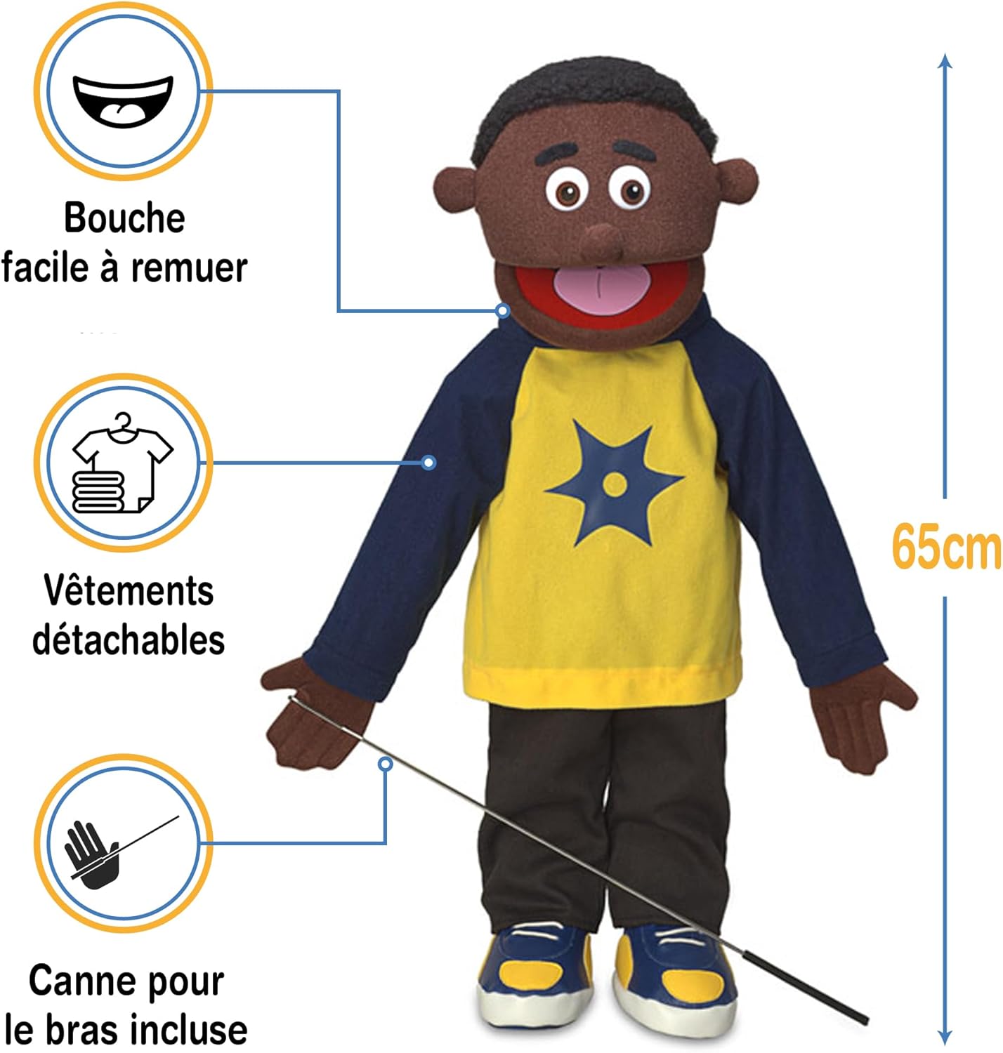 Burattino ventriloquo a figura intera di alta qualità realizzato da Silly Puppets. Bocca facile da muovere. Ingresso manuale dal retro del burattino. Include 1 asta di controllo del braccio che può essere agganciata a entrambe le mani per il movimento. Altezza: circa 65 cm. Peso leggero: ca. 500 g. Il pupazzo può essere vestito con abiti a misura di bambino a partire dai 18 mesi.