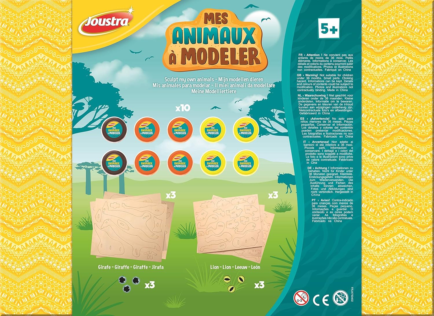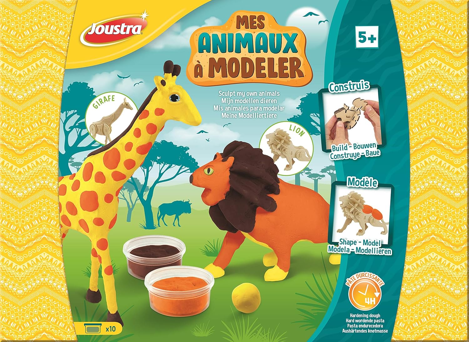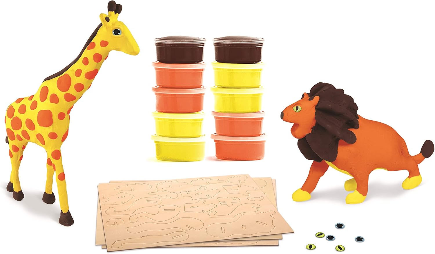 Una scatola per creare un leone e una giraffa in argilla indurente per sviluppare la creatività e la destrezza dei bambini. Riporta in vita il tuo leone e la tua giraffa! 1/ Assembla il loro scheletro 2/ Ricoprili con pasta indurente, aggiungi gli occhi e lasciali asciugare all'aria 3/ Gioca con il tuo leone e la tua giraffa! La scatola contiene: 2 scheletri in legno (Leone e Giraffa) da assemblare, 10 vasetti di pasta indurente, 6 occhi, 1 scatola da conservare e un foglio esplicativo sui 2 animali. Dimensioni del leone: larghezza: 21 cm / altezza: 13 cm - Giraffa: 26 cm / altezza: 17 cm Età minima consigliata: 5 anni