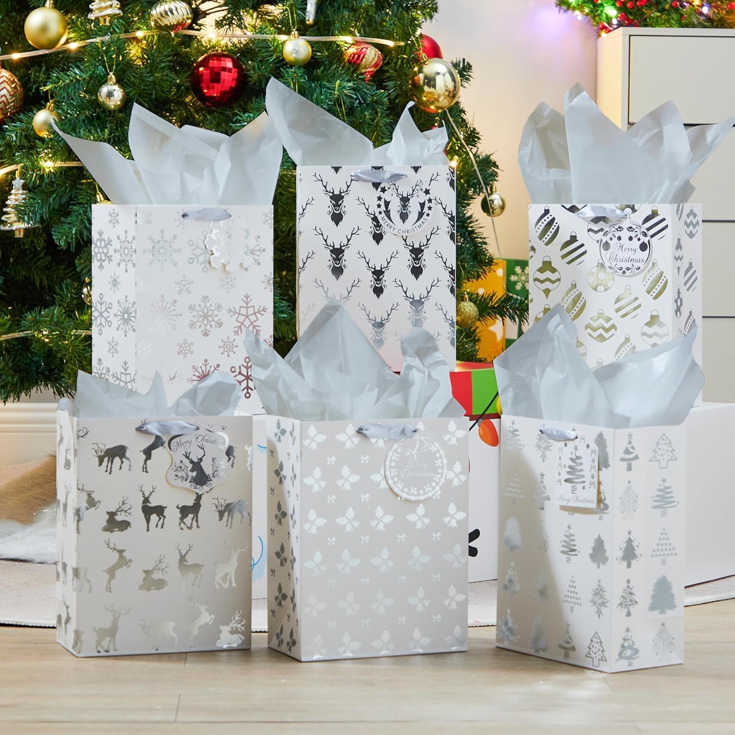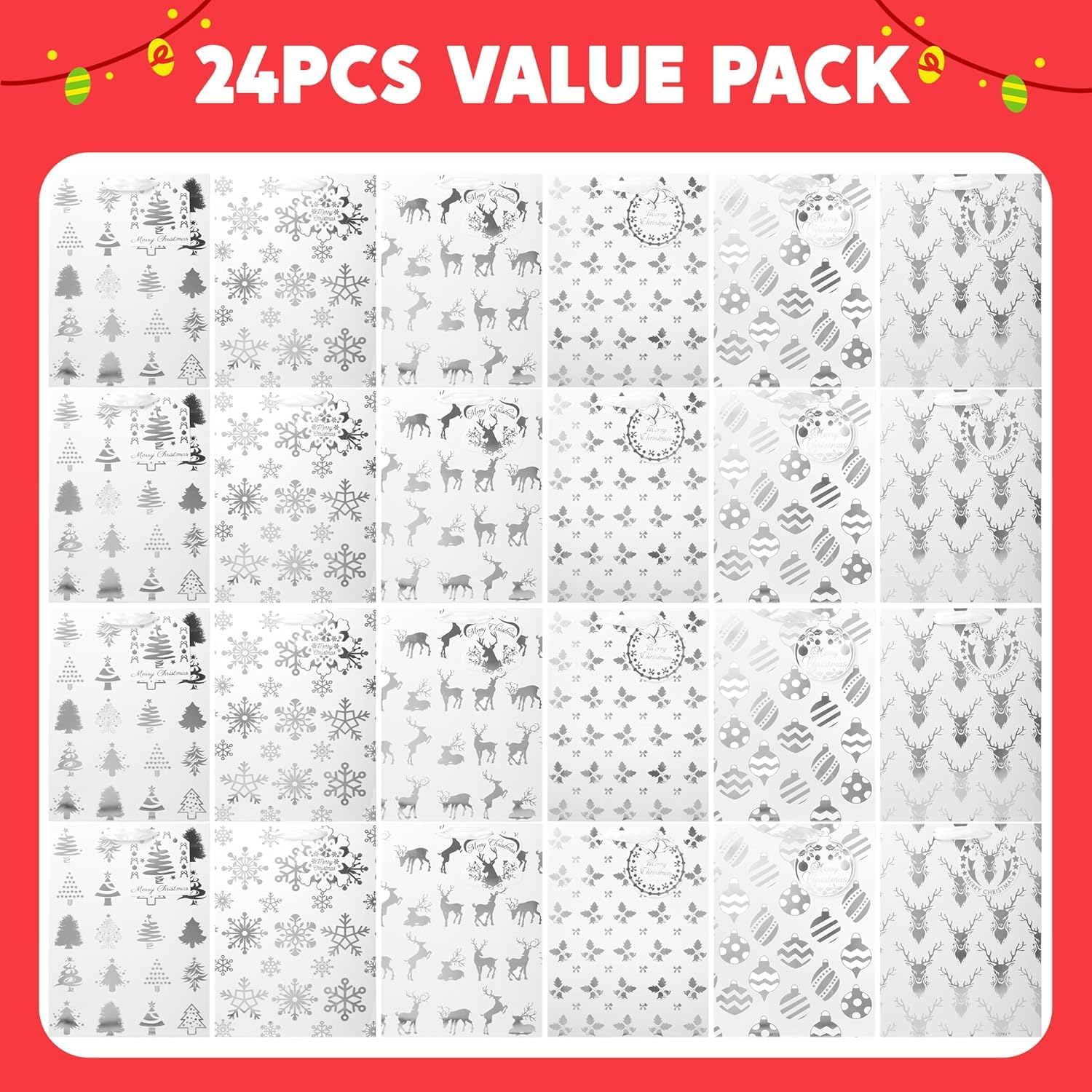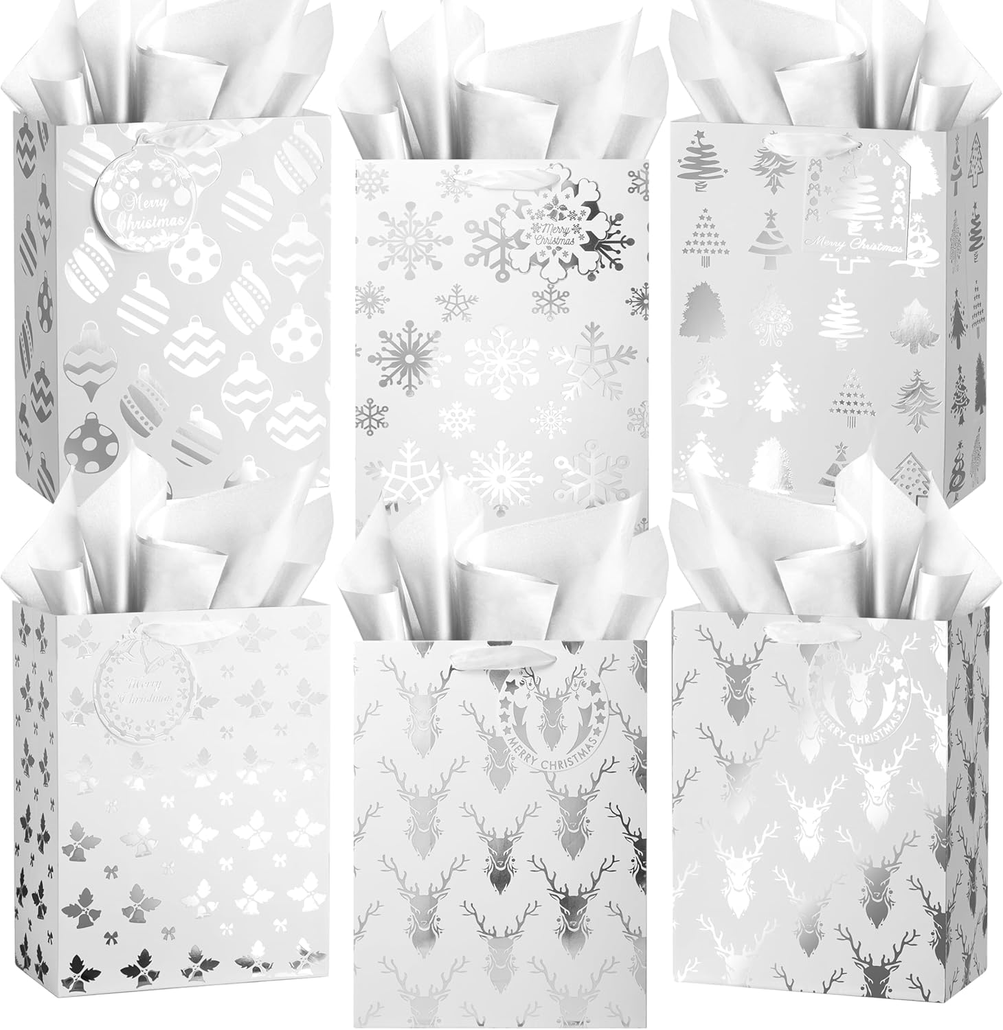 DIMENSIONI PRATICHE: Misurano 4" x 8" x 10", questi sacchetti regalo di Natale riutilizzabili in lamina d'argento con etichette per nome abbinate e carta velina sono la dimensione perfetta per una varietà di regali di piccole e medie dimensioni. La generosa capacità e la carta velina inclusa rendono avvolgere i regali un gioco da ragazzi. Questo pacchetto completo ti assicura di avere tutto il necessario per presentare i tuoi regali magnificamente. DESIGN VERSATILE: Questo set contiene 24 pezzi con 6 disegni: fiocco di neve, albero di Natale, teste di cervo, renna, campanelle e ornamenti. L'elegante finitura in lamina d'argento aggiunge un tocco lussuoso alla tua presentazione regalo. I bellissimi disegni in argento e i motivi festivi su questi sacchetti regalo di Natale renderanno le tue celebrazioni più gioiose e i tuoi regali più memorabili. Molte occasioni: perfetti per decorazioni natalizie, confezioni regalo, regali speciali, decorazioni per feste, matrimoni, alberi di Natale, aule, bomboniere, bottiglie di vino, piccoli regali e altro ancora. Questi sacchetti regalo di Natale in lamina d'argento sono ideali per qualsiasi occasione di regali natalizi albero.QUALITÀ PREMIUM: Realizzati in carta robusta, questi sacchetti regalo natalizi in lamina d'argento sono progettati per tenere i tuoi regali al sicuro e garantire che rimangano intatti e presentabili durante le festività natalizie.Facili da usare: dotati di maniglie robuste, questi sacchetti regalo natalizi in lamina d'argento con manici sono facili da trasportare e trasportare.