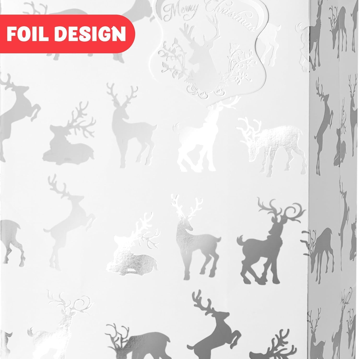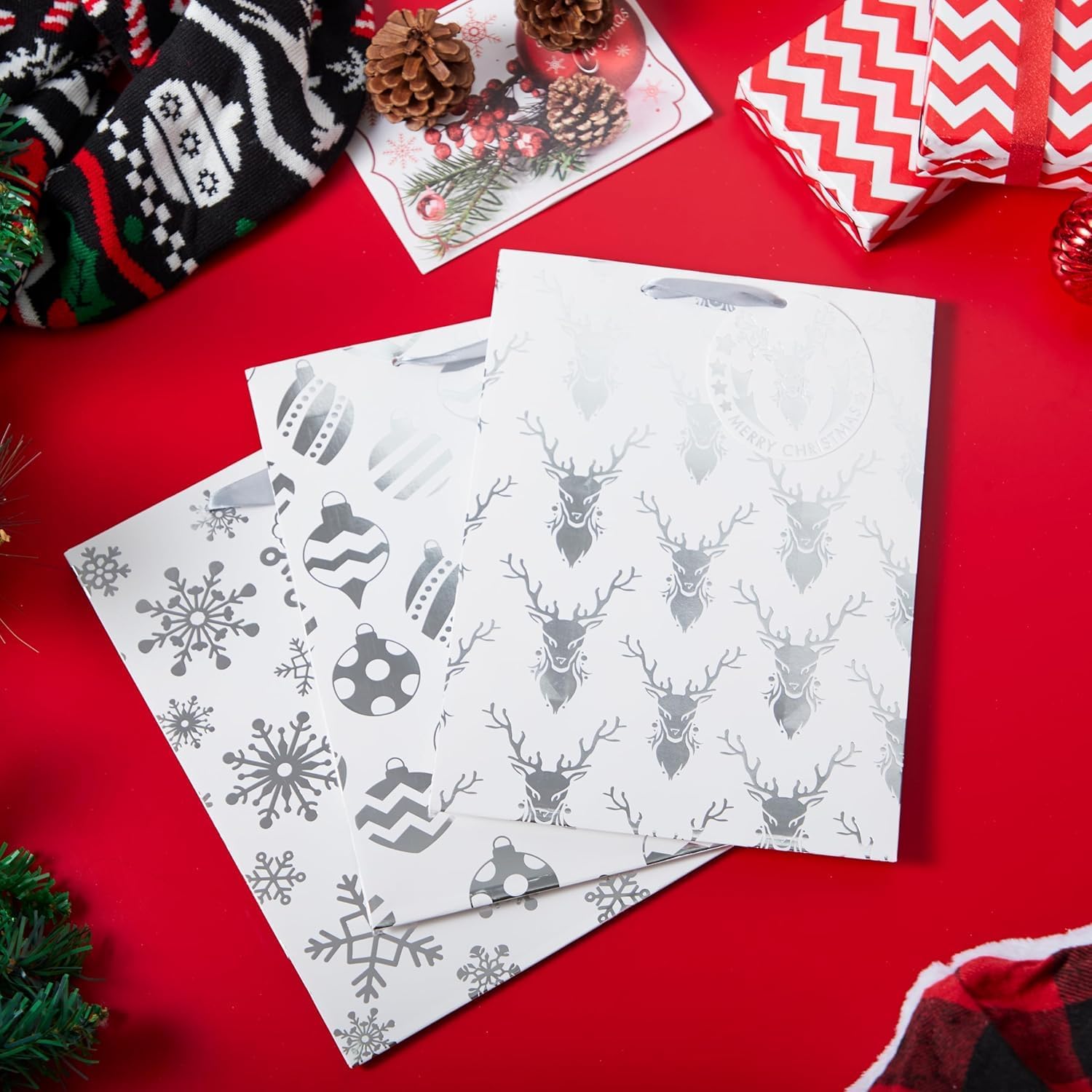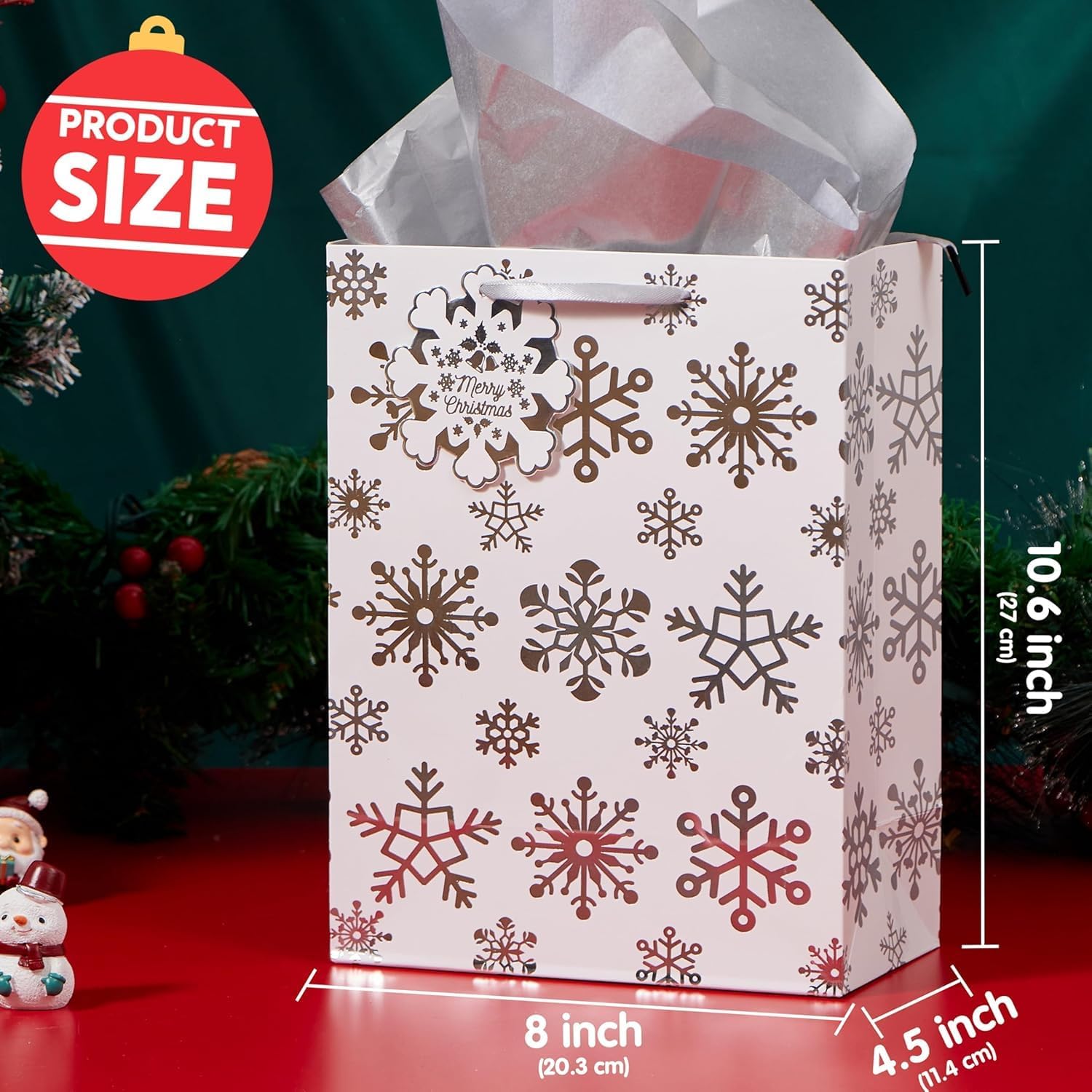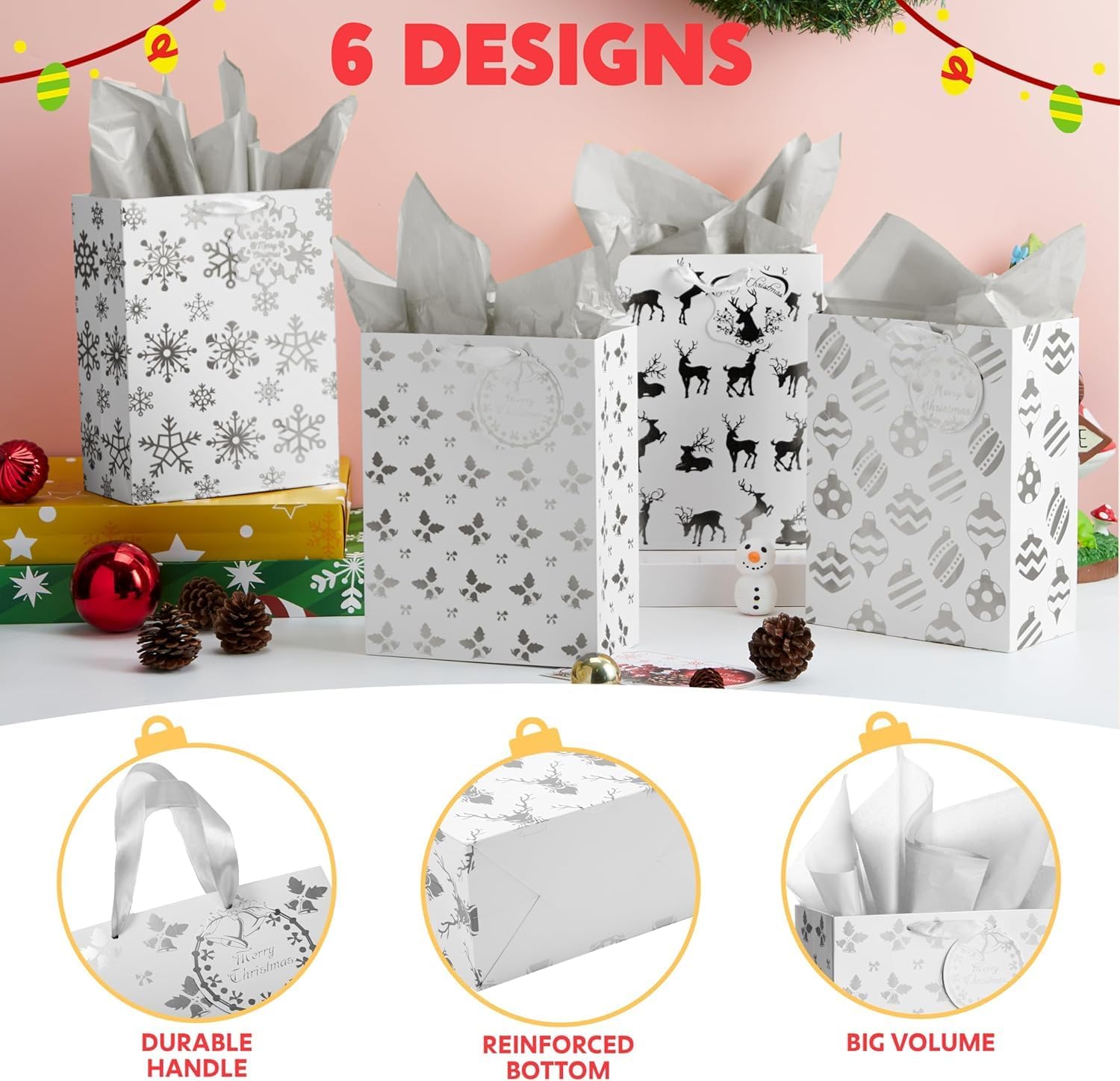 DIMENSIONI PRATICHE: Misurano 4" x 8" x 10", questi sacchetti regalo di Natale riutilizzabili in lamina d'argento con etichette per nome abbinate e carta velina sono la dimensione perfetta per una varietà di regali di piccole e medie dimensioni. La generosa capacità e la carta velina inclusa rendono avvolgere i regali un gioco da ragazzi. Questo pacchetto completo ti assicura di avere tutto il necessario per presentare i tuoi regali magnificamente. DESIGN VERSATILE: Questo set contiene 24 pezzi con 6 disegni: fiocco di neve, albero di Natale, teste di cervo, renna, campanelle e ornamenti. L'elegante finitura in lamina d'argento aggiunge un tocco lussuoso alla tua presentazione regalo. I bellissimi disegni in argento e i motivi festivi su questi sacchetti regalo di Natale renderanno le tue celebrazioni più gioiose e i tuoi regali più memorabili. Molte occasioni: perfetti per decorazioni natalizie, confezioni regalo, regali speciali, decorazioni per feste, matrimoni, alberi di Natale, aule, bomboniere, bottiglie di vino, piccoli regali e altro ancora. Questi sacchetti regalo di Natale in lamina d'argento sono ideali per qualsiasi occasione di regali natalizi albero.QUALITÀ PREMIUM: Realizzati in carta robusta, questi sacchetti regalo natalizi in lamina d'argento sono progettati per tenere i tuoi regali al sicuro e garantire che rimangano intatti e presentabili durante le festività natalizie.Facili da usare: dotati di maniglie robuste, questi sacchetti regalo natalizi in lamina d'argento con manici sono facili da trasportare e trasportare.