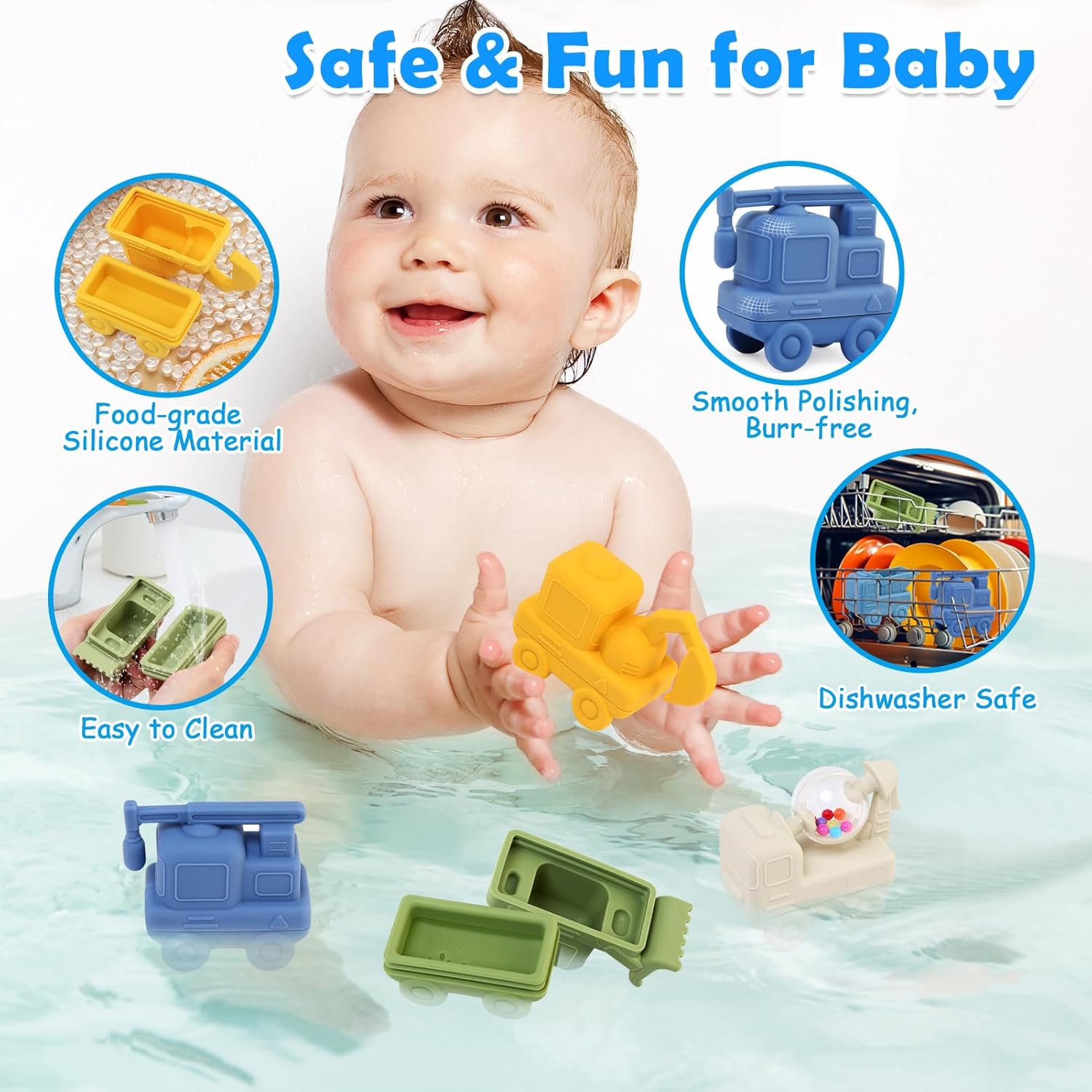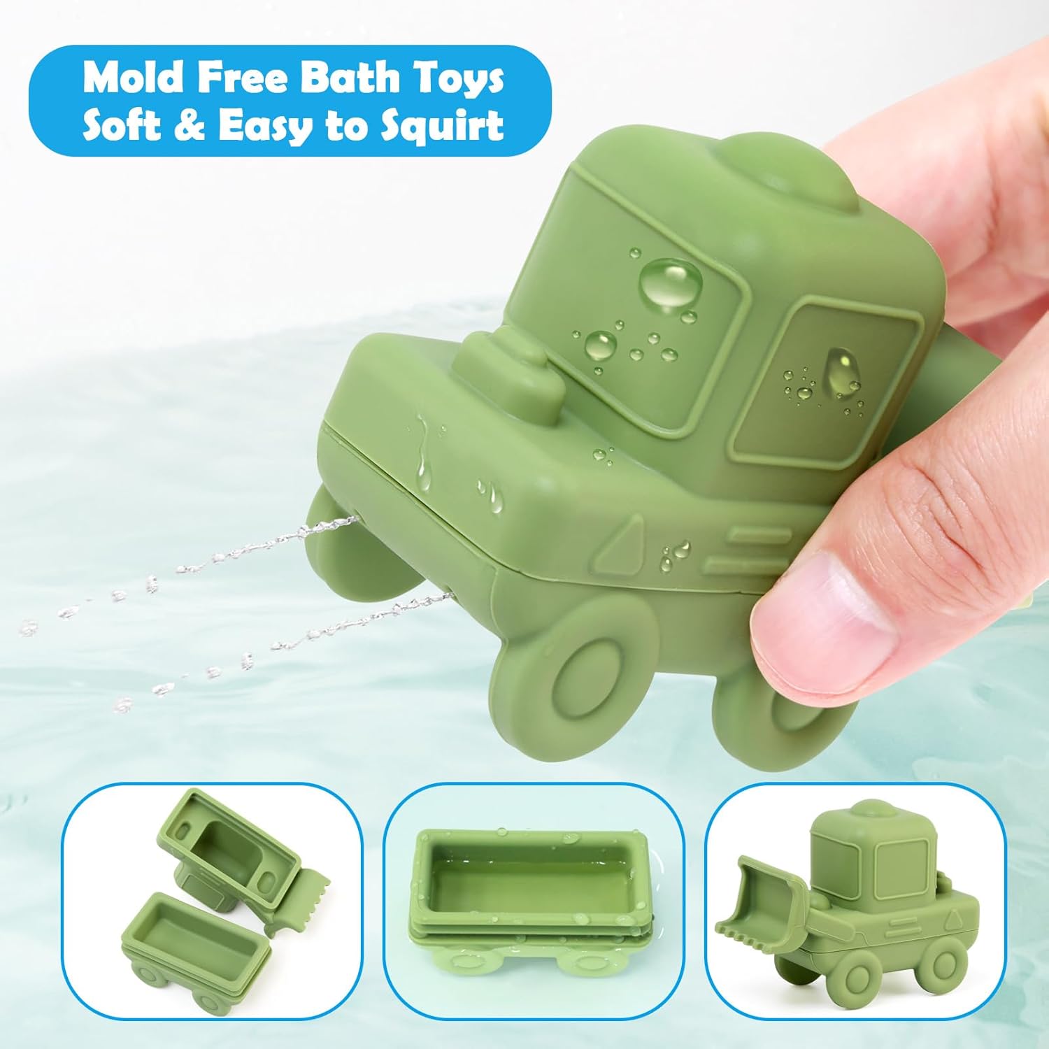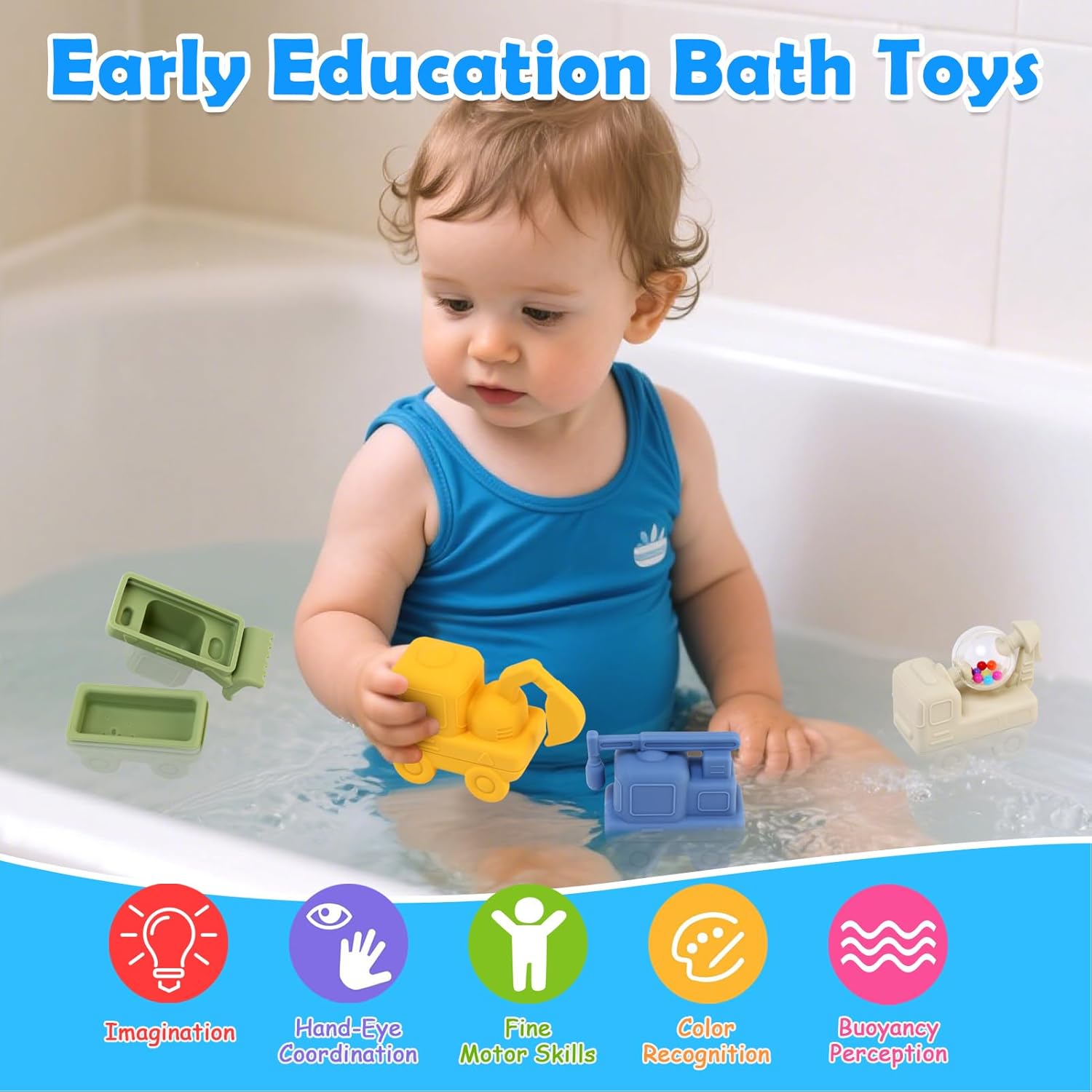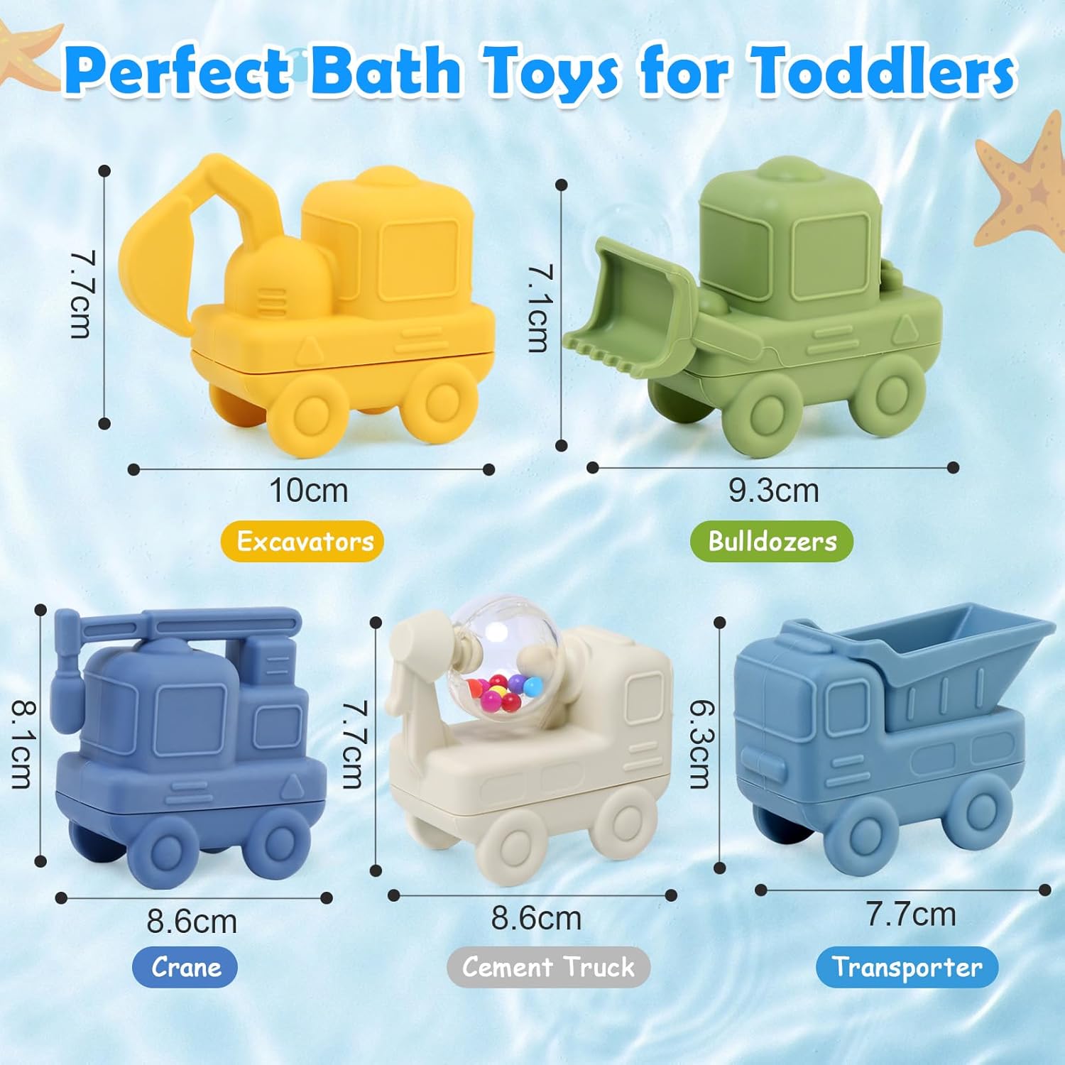 Giocattoli da bagno ideali per bambini e neonati: questo set di 5 giocattoli da bagno a tema costruzione include escavatori, trasportatori, camion di cemento, bulldozer e gru. Ogni camion dispone di due beccucci di precisione nella base. Riempire, spremere e spruzzare d'acqua, questi giocattoli da bagno per bambini forniranno infinite ore di intrattenimento schizzato. Design senza muffa: i giocattoli da bagno senza muffa sono lavabili in lavastoviglie. Il suo design innovativo consente a ogni giocattolo da bagno di aprirsi in due parti separate per una facile pulizia e un'asciugatura rapida, rendendo la pulizia un gioco da ragazzi e prevenire la muffa, non preoccuparti dell'acqua residua all'interno dei batteri riproduttivi. Divertenti giocattoli per imparare l'acqua: questi giocattoli da bagno per bambini di 1, 2, 3 e 4 anni presentano colori pastello e disegni adorabili, aiutano la percezione del colore e lo sviluppo della vista del bambino. Collegare/scollegare le parti del veicolo per raccogliere, versare o spruzzare acqua per fare un bagno felice mentre sviluppa la coordinazione occhio-mano del bambino, le capacità motorie, l'esplorazione sensoriale e stimola l'immaginazione del bambino. 100% silicone per uso alimentare: i nostri giocattoli per piscina sono realizzati in silicone non tossico per uso alimentare, leggero, morbido e comprimibile, robusto per un uso duraturo anche con l'uso quotidiano nella vasca da bagno e in piscina. Facile da tenere per le mani piccole, questi giocattoli da bagno per bambini dai 10 mesi in su sono divertenti e sicuri per ragazzi e ragazze Tutte le età possono godersi i nostri giocattoli per vasca da bagno. Regalo per auto da bagno: questi giocattoli per vasca da bagno per bambini sono più di un semplice giocattolo da bagno: dominano la piscina, la spiaggia e le aree giochi d'acqua all'aperto. I nostri giocattoli da bagno per bambini da 1 a 5 anni sono la scelta regalo ideale per Natale, compleanno, festa dei bambini, qualsiasi altra vacanza e baby shower. I genitori che vogliono che il loro bambino si goda un felice momento del bagno mentre imparano l'educazione precoce adoreranno sicuramente questi giocattoli da bagno!