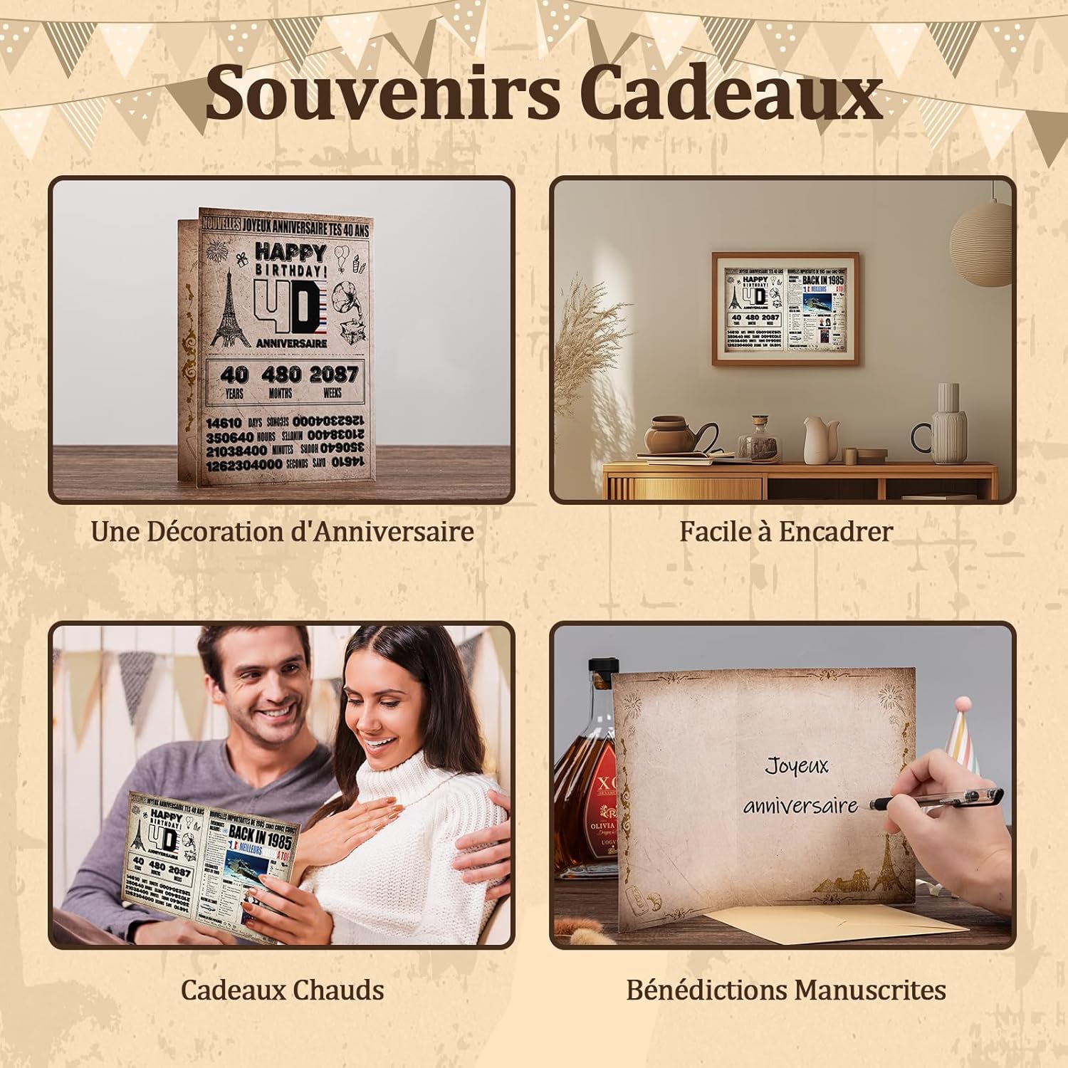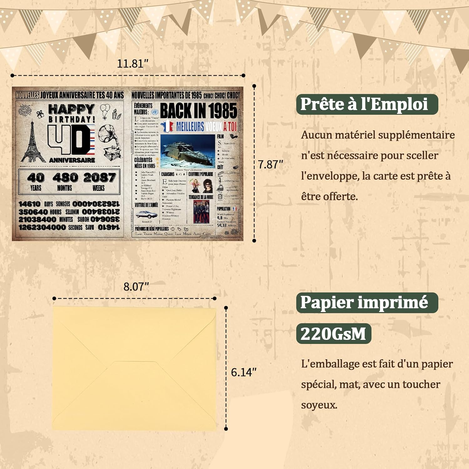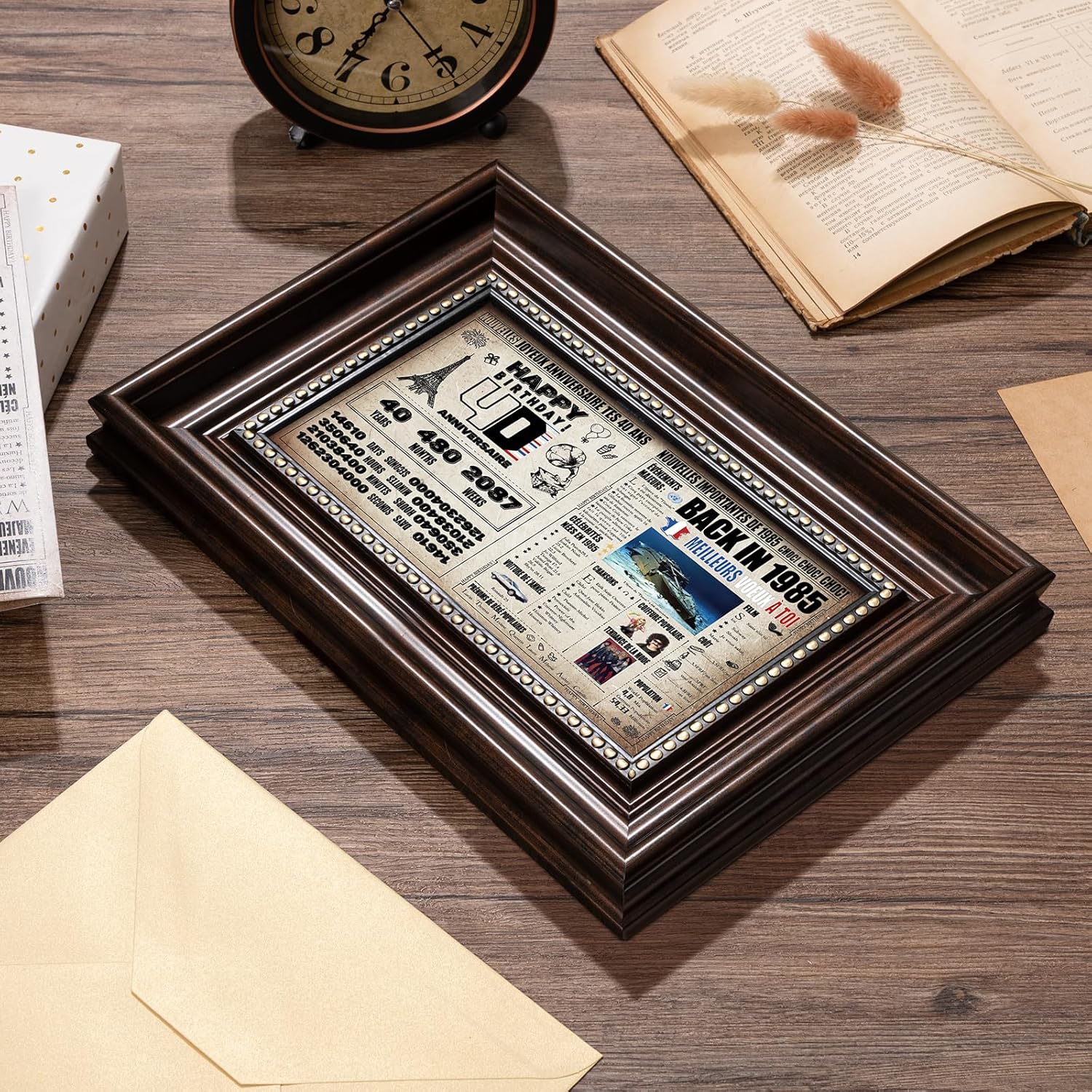 🎁【Regalo personalizzato e originale per il 40° compleanno】40 anni! Che giornata indimenticabile! Questo esclusivo biglietto di auguri vintage presenta un look retrò e invecchiato che porterà un tocco fresco e divertente alle celebrazioni di compleanno. Un regalo divertente contenente una storia interessante o un fatto poco noto sul tuo anno di nascita o anno di matrimonio. 📜【Una carta piena di attenzione ed emozione】 Più di una carta, ma un invito a condividere conversazioni interessanti ed emozionanti su eventi e ricordi passati. Il nostro biglietto "indietro nel 1985" sorprenderà e delizierà la persona amata, sia maschio (padre, nonno, fratello, amico, padrino, collega...) o femmina (madre, nonna, amica, madrina, sorella...). 🎁【Materiale di alta qualità】Qualità: i biglietti di compleanno sono spessi e molto robusti, i nostri biglietti di compleanno sono dotati di una resistente busta dorata per una maggiore protezione. Questo è un regalo bello, robusto, elegante e commovente, progettato con carta spessa e resistente per garantire una lunga durata anche dopo essere stato aperto più volte. 📜 【Ampiamente usato】 Questo biglietto d'auguri è più di un semplice biglietto di auguri. Puoi anche usarlo come regalo di compleanno, supporto fotografico, poster, decorazione per feste o anche foto. Puoi persino incorniciarlo per creare una foto preziosa per commemorare questo traguardo. 🎁【Aggiungi il tuo messaggio personale】 L'interno ti dà spazio per personalizzare il tuo messaggio, pronto per essere riempito con i tuoi desideri e ricordi, rendendo ogni desiderio unico. Queste cartoline con busta sono perfette per esprimere i tuoi auguri più sinceri e delizieranno tutti i destinatari