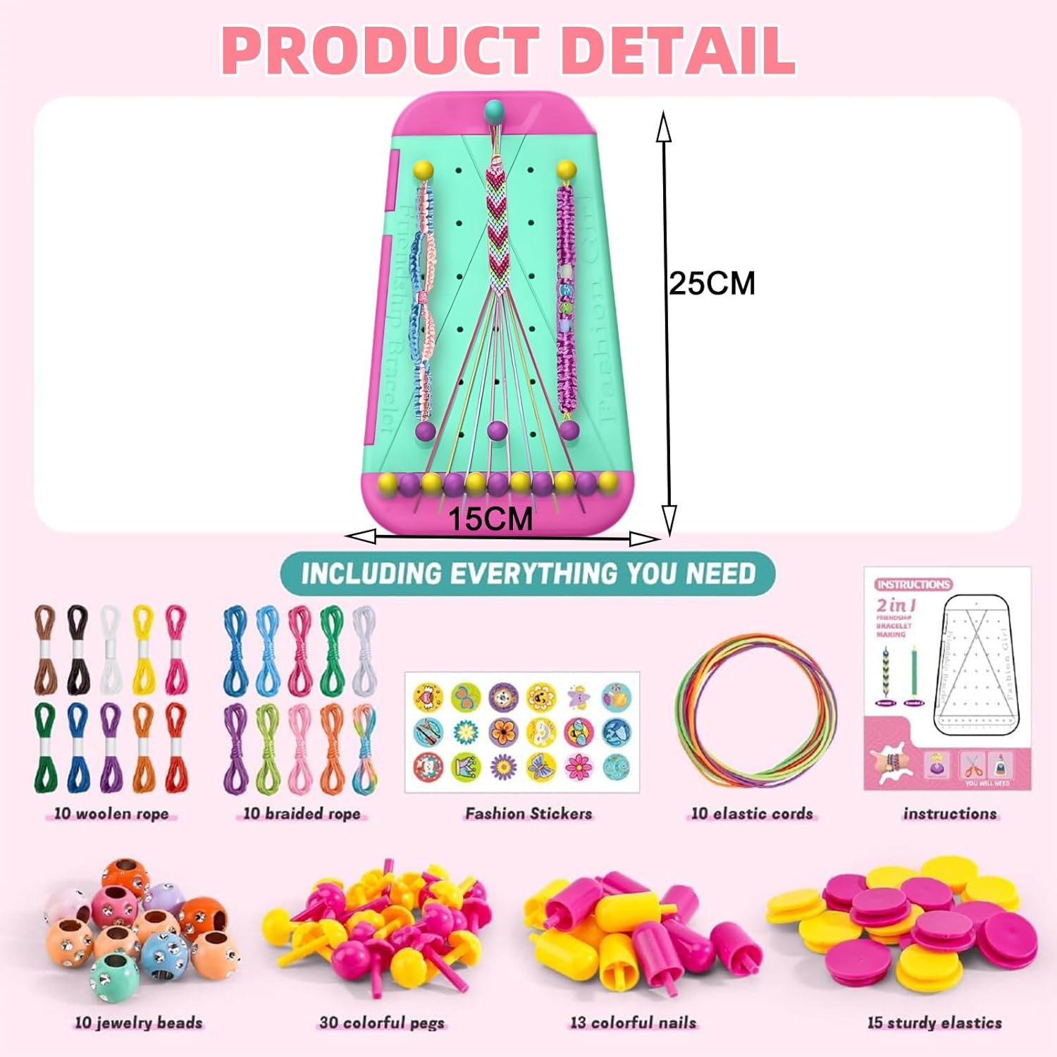 Lista Imballaggio: Il Kit per Braccialetti Ragazza è dotato di 1 strumento per realizzare braccialetti, 15 elastici resistenti, 30 mollette colorate, 13 chiodi colorati, 10 perline per gioielli, 1 adesivo alla moda, 10 corde di lana, 10 corde intrecciate, 10 cordini elastici e istruzioni Crea I Tuoi Braccialetti Dell'amicizia: Puoi realizzare i tuoi braccialetti usando il kit per braccialetti dell'amicizia, e include una vasta gamma di accessori di alta qualità. Diventa astuto con i tuoi amici e crea braccialetti impressionanti che amerai Coltiva Creatività e Immaginazione: Questo kit braccialetti consente ai bambini di creare braccialetti da soli, aiuta i bambini a concentrarsi e ad apprendere nuove abilità e abilità. Coltivano la creatività e l'immaginazione durante il processo di creazione dei braccialetti, migliorano le loro abilità manuali e consentono ai bambini di crescere e svilupparsi a tutto tondo durante il gioco Facile da Creare da Soli: Per realizzare questo set per fare braccialetti non servono nastro adesivo, spilli o altro. Il design unico mantiene il cavo saldamente in posizione. Clip e fessure separano e organizzano i cavi per facilitare il lavoro. I bambini possono costruirlo da soli o con gli amici, liberando la loro creatività e creando una splendida esposizione. Prenditi una pausa e riprendi da dove eri rimasto Regali per Ragazze: Il kit per fare braccialetti dell'amicizia è un ottimo regalo per ragazze di età compresa tra 6 e 12 anni, che si tratti di compleanni, festa, ritorno a scuola, Natale o altre festività. Anche gli adulti possono giocarci e riportare i loro ricordi all'infanzia