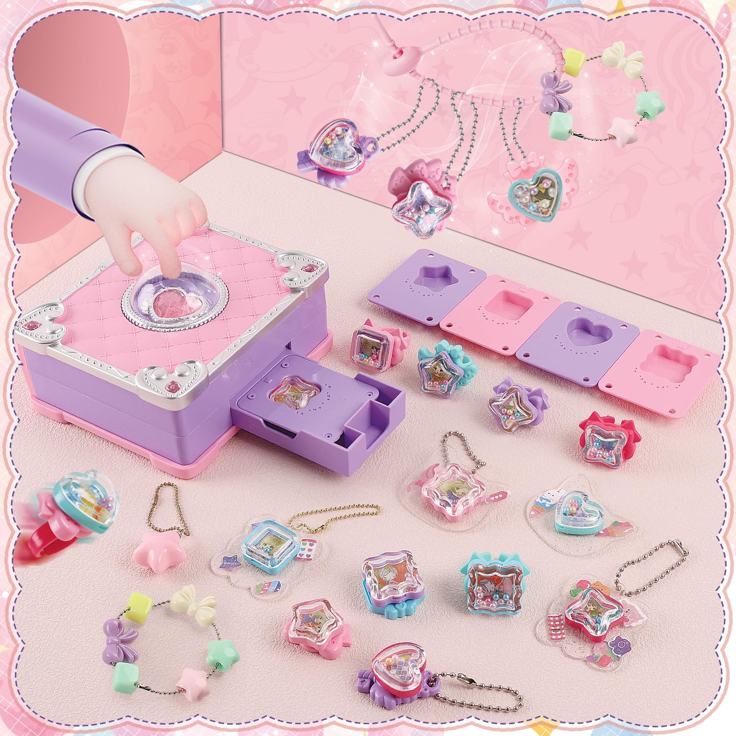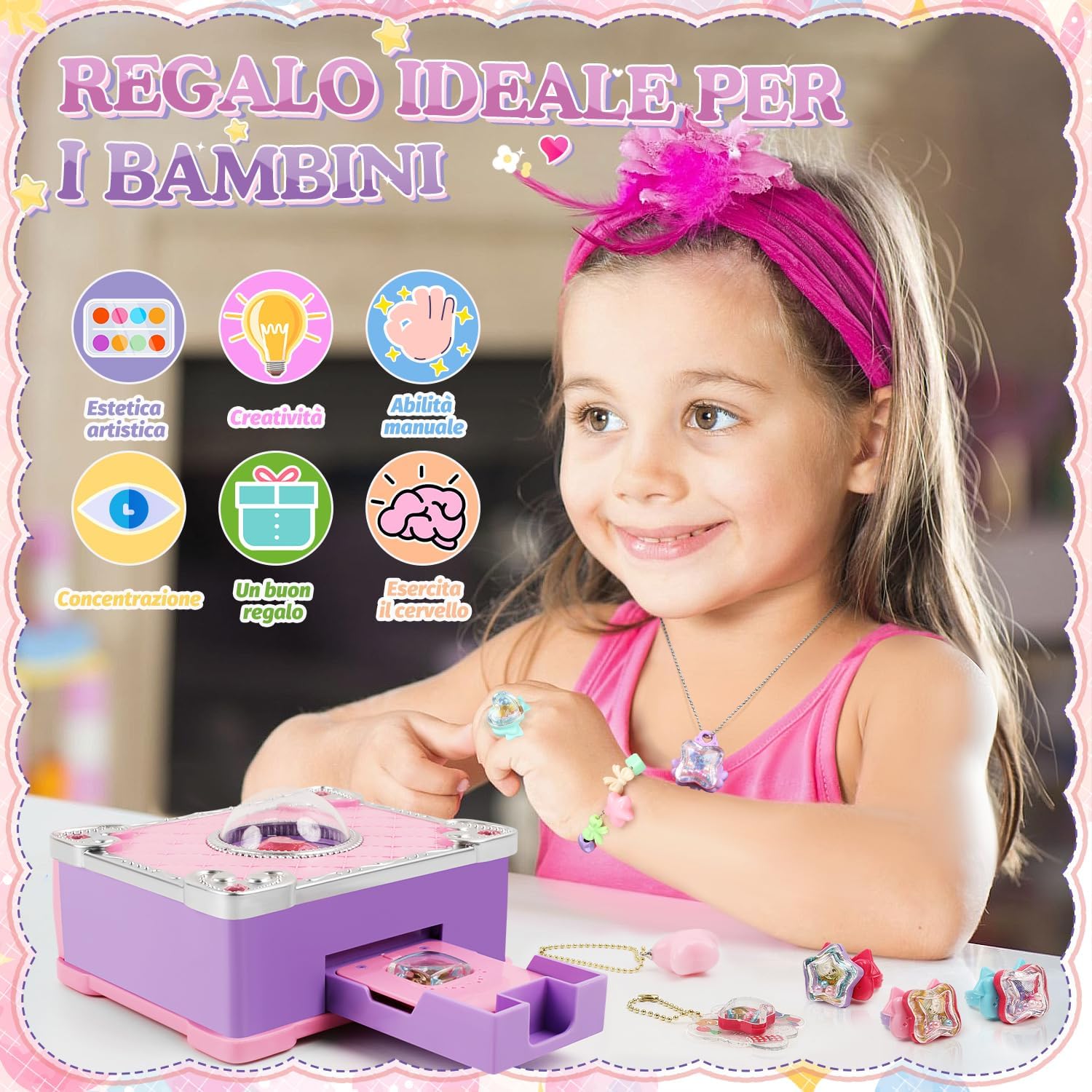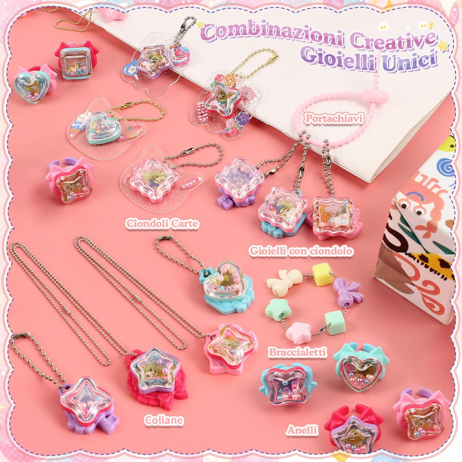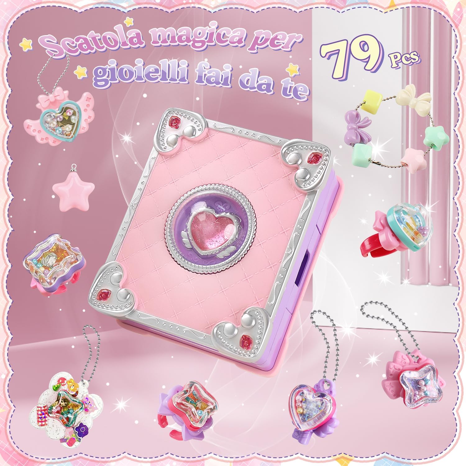Confezione regalo con 79 pezzi: la confezione contiene un totale di 79 pezzi, tra cui collane, bracciali, anelli, ciondoli, adesivi, perline colorate, ecc. con diverse forme e colori come ad esempio forme a stelle, forme a cuore, ecc. La varietà consente la creazione creativa di vari mestieri, set creativo per bambini. Facile da montare: il nostro kit di gioielli fai da te per bambini è facile da realizzare. Con l'aiuto delle istruzioni, è pronta all'uso in appena 1 minuto e l'intero processo è sicuro e senza sforzo. Giochi da 3 anni per bambini. Stimola la creatività: il kit per braccialetti consente di creare diversi mestieri come bracciali, collane, anelli, ecc. e favorisce la mentalità creativa, la coordinazione dei colori e le abilità manuali dei bambini, creare braccialetti dell'amicizia. Da combinare e combinare per creare il proprio braccialetto. Attività genitore-figlio: i genitori possono accompagnare i loro figli durante il fai da te per incoraggiare la comunicazione genitore-figlio, trascorrere del tempo insieme e sostenere lo sviluppo delle loro abilità divertendosi insieme. Ideale come regalo per bambini: il set di gioielli fai da te è perfetto come regalo di Natale, regalo di compleanno, regalo per la scuola, regalo per la festa dei bambini, ecc. È il regalo ideale per bambini.