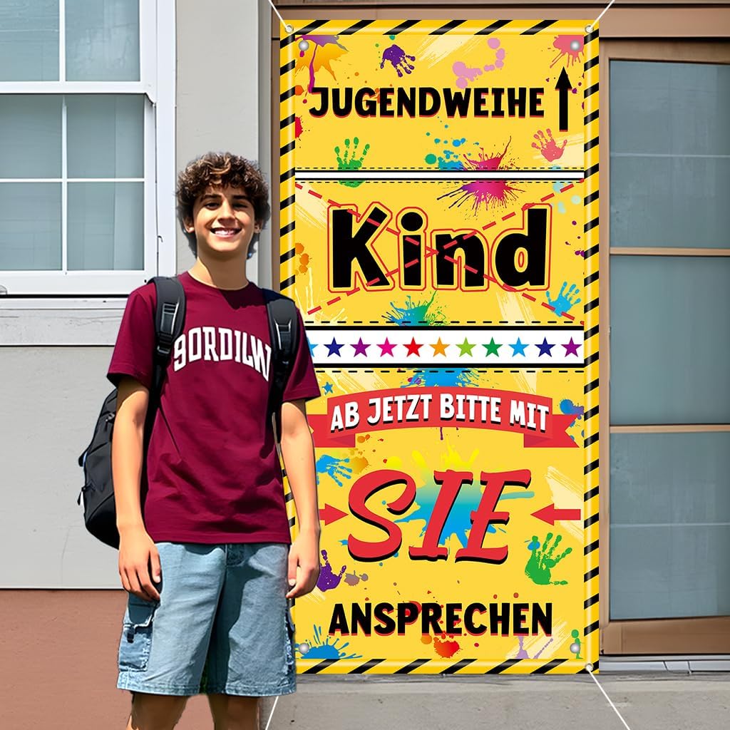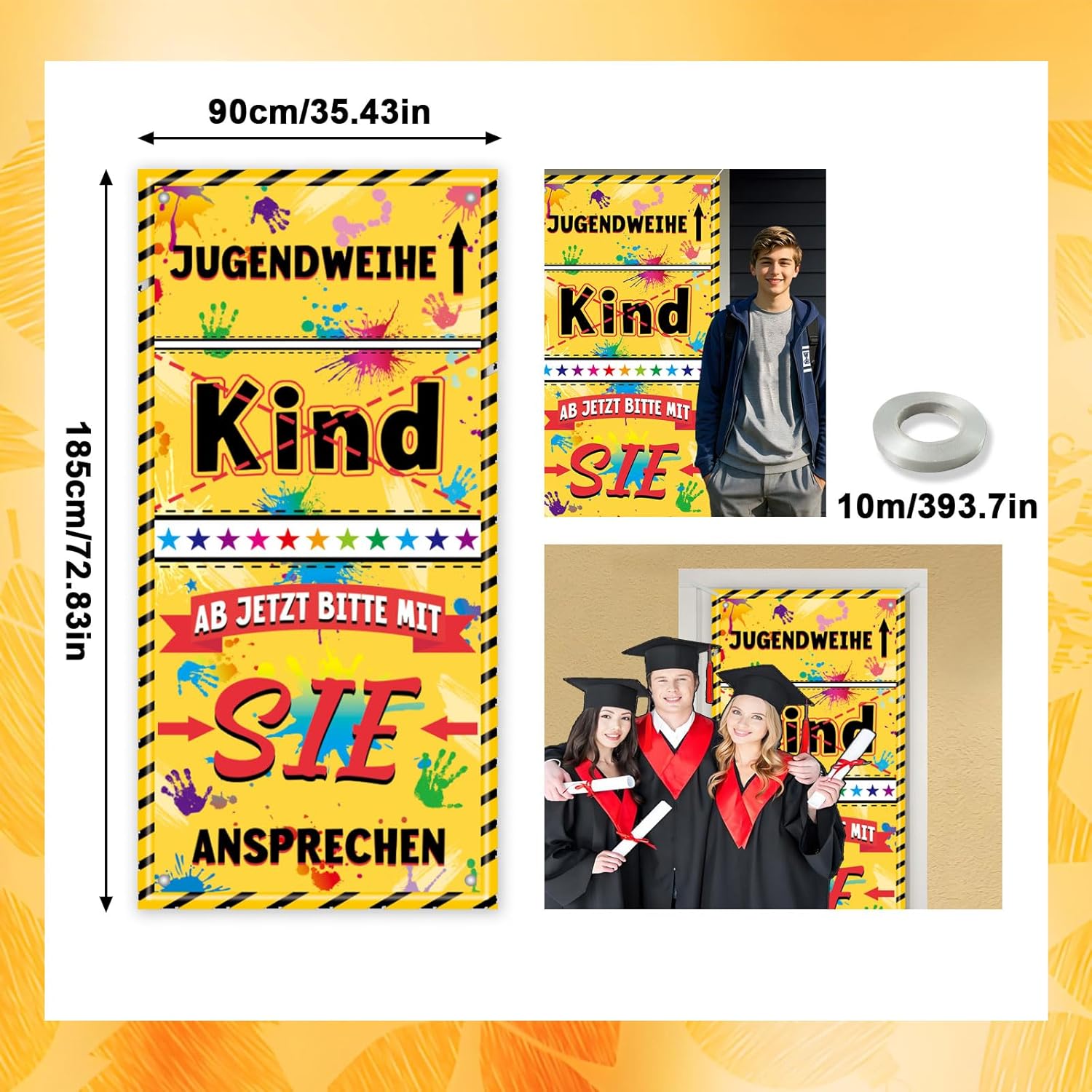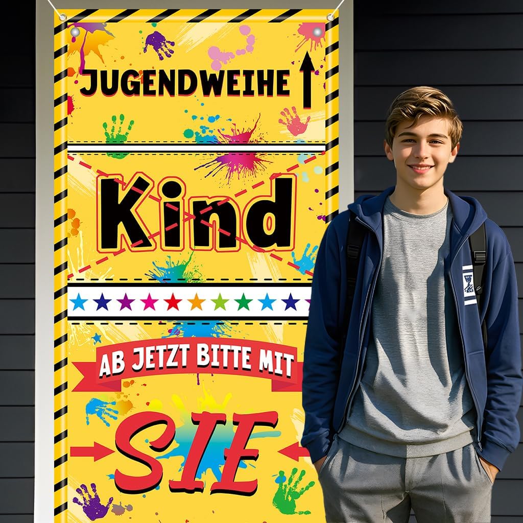 【Banner Jugendweihe】Riceverai uno striscione decorativo con dedica giovanile, 185 x 90 cm, abbastanza grande da essere utilizzato come decorazione finale o sfondo fotografico alla festa, aggiungi più colori alla festa! 【Materiale di alta qualità】 Il banner è realizzato in tessuto di poliestere resistente, morbido, leggero e resistente, stampato digitalmente con colori vivaci e elevata solidità del colore! Lo sfondo della festa è lavabile e riutilizzabile. 【Facile da usare】 Basta infilare lo striscione con la dedica dei giovani attraverso gli occhielli in ottone. Facile da appendere, può essere appeso ovunque nella stanza, parete, porta, tavolo, finestra, recinzione del giardino, ecc. Può essere utilizzato per decorare una stanza, come sfondo per le foto di laurea o come momento clou di una festa per catturare lo spirito devoto della giovinezza. 【Design unico】 Tipo-->Jugendweihe Deko, questo striscione finalmente per adulti può essere utilizzato come decorazione Jugendweihe per interni ed esterni, ideale per Jugendweihe o decorazione murale. Può essere utilizzato per decorare una stanza, come sfondo per le foto di laurea o come momento clou di una festa per catturare lo spirito devoto della giovinezza.
