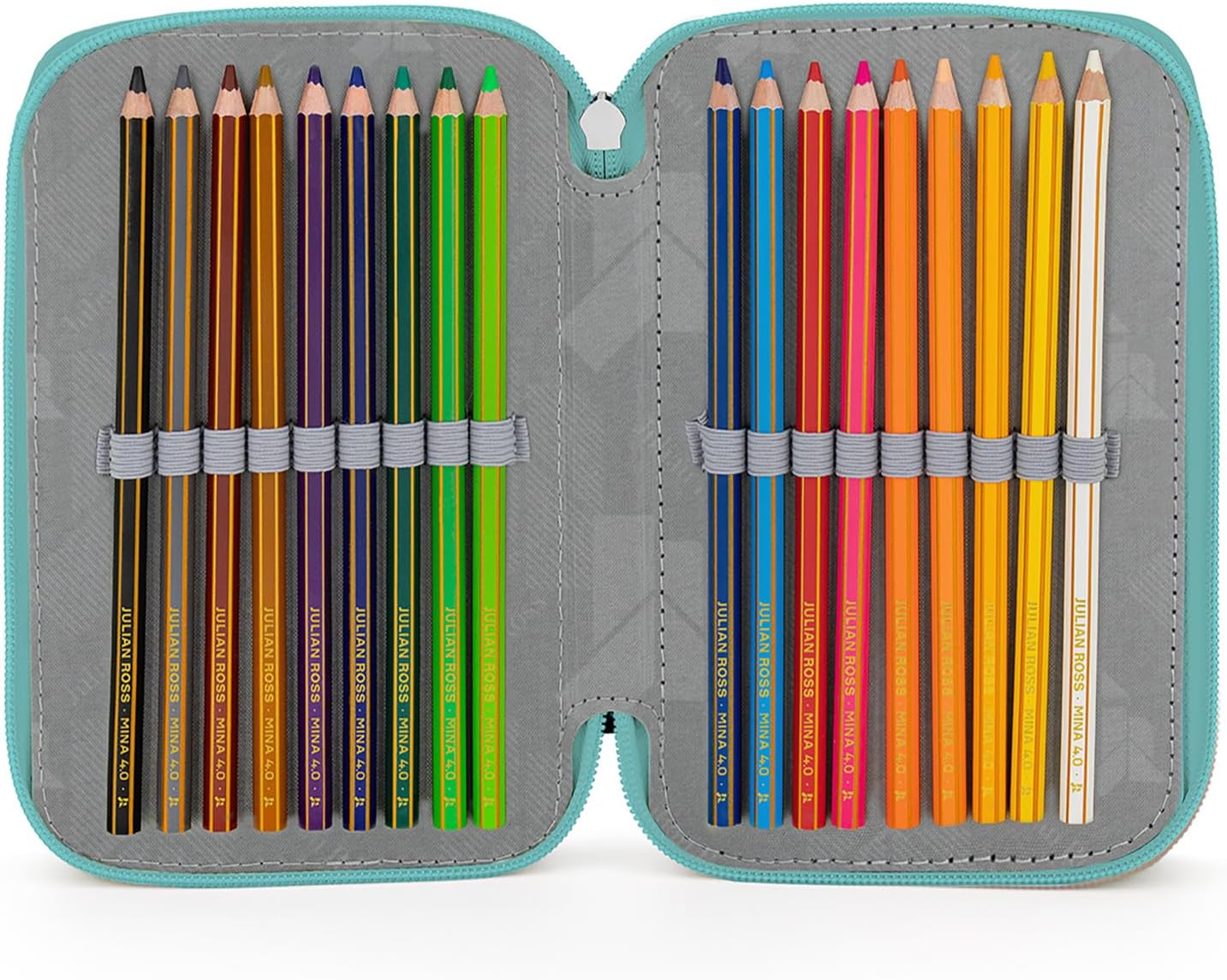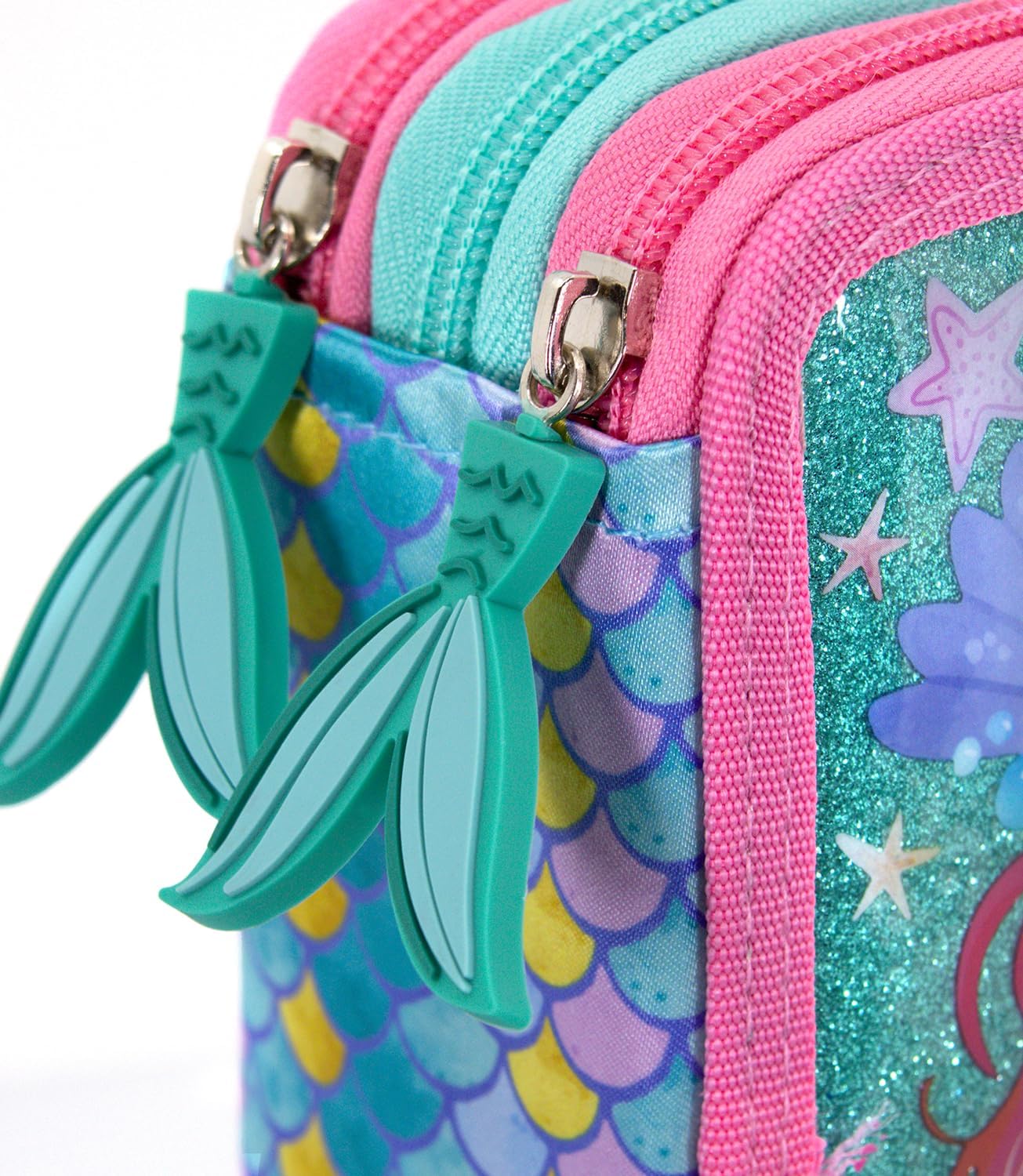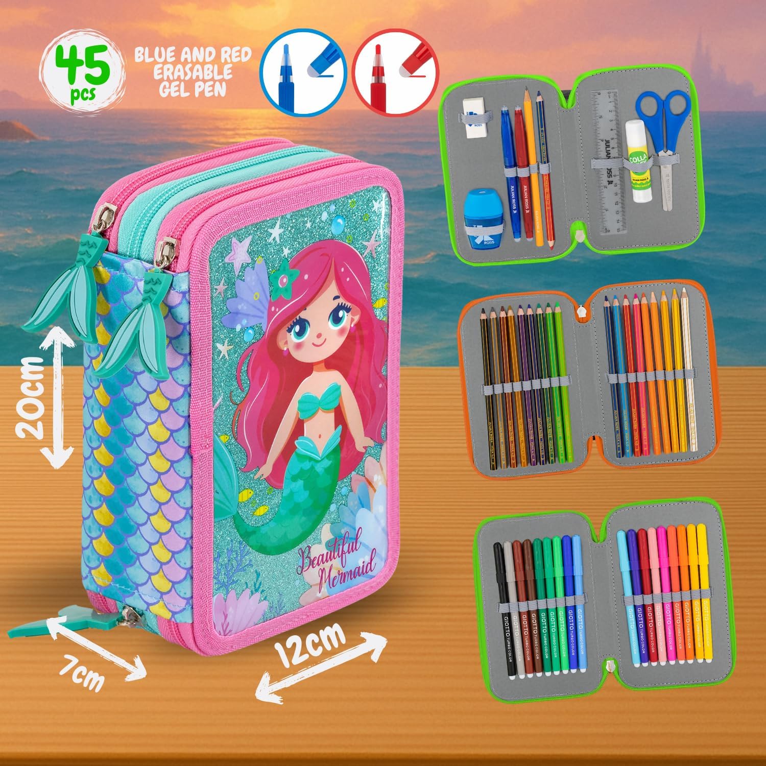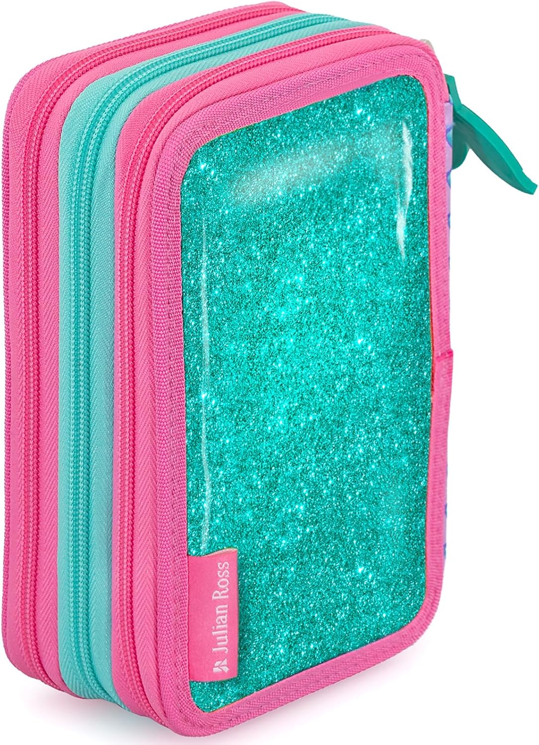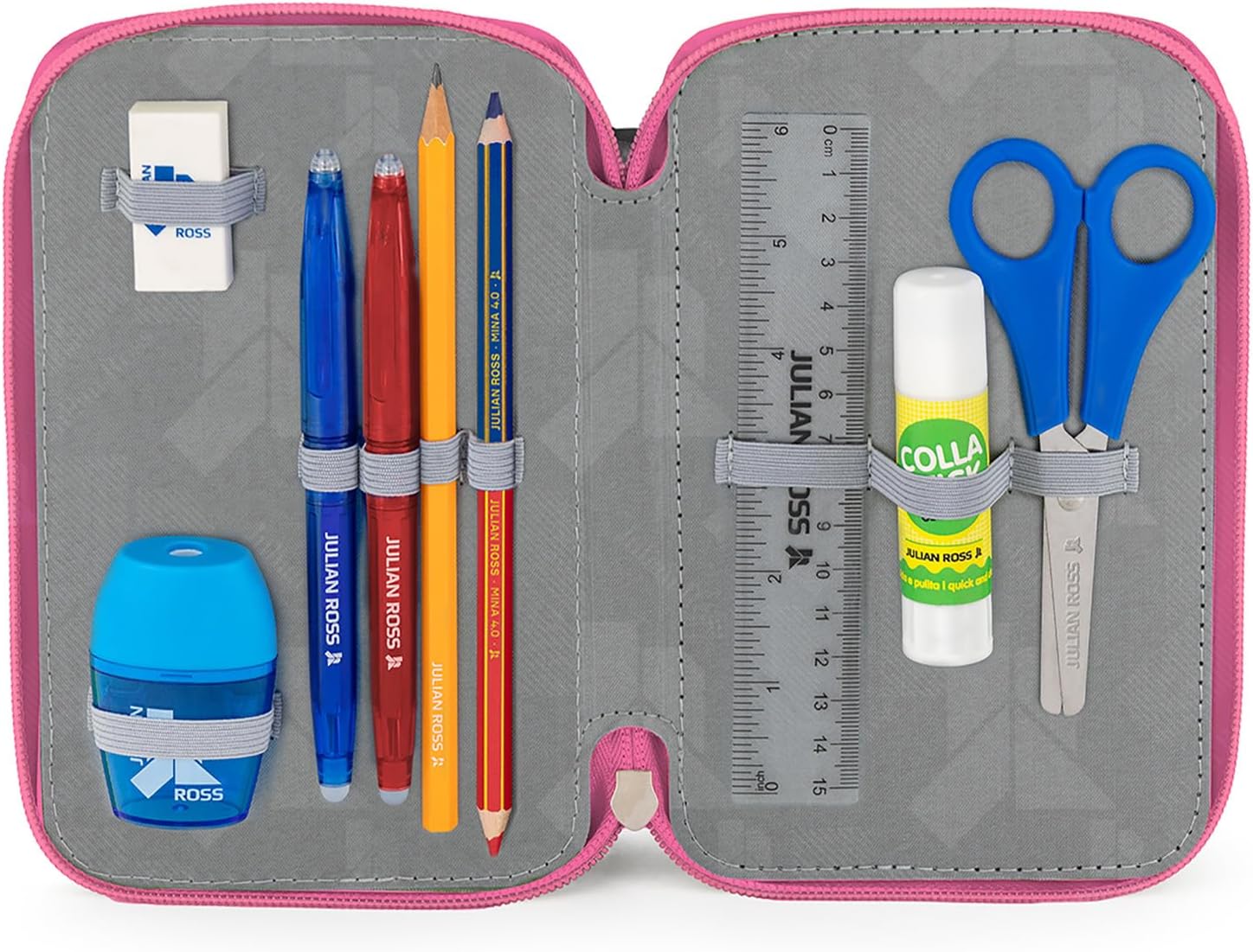 Prodotto ufficiale Julian Ross. La Divisione Scuola Julian Ross è specializzata nella produzione e distribuzione di articoli per la scuola e accessori per il tempo libero. Contenuto astuccio: triplo scomparto, 1 penna gel cancellabile blu, 1 penna gel cancellabile rossa, 1 matite, 1 pastello rosso/blu, 1 gomma, 1 temperino, 1 righello, 1 forbicine, 1 colla stick, 18 pastelli Julian Ross Mina 4mm, 18 pennarelli Giotto. Dimensioni: 20 x 12 x 7 cm. Questo astuccio presenta un design incantevole e colorato ispirato al mondo delle sirene. Sulla parte frontale spicca una simpatica sirena dai capelli rosa con dettagli brillanti glitterati, immersa in un fondale marino decorato con stelle marine, pesciolini e piante acquatiche. I dettagli tridimensionali come le zip a forma di pinna di sirena rendono l'astuccio ancora più originale e accattivante per i bambini. La combinazione di colori vivaci come il turchese, il rosa e il lilla dona all'astuccio un aspetto allegro e fantasioso. L'astuccio è dotato di cerniere robuste che garantiscono una chiusura sicura e durevole. Questo permette di mantenere i contenuti al sicuro e di evitare che si spargano o si danneggino durante il trasporto. L'astuccio con questi tre scomparti offre una soluzione completa per le esigenze di scrittura e colorazione dei bambini. È un modo pratico per tenere tutto il necessario per le attività creative organizzato e facilmente accessibile. Inoltre, l'astuccio è leggero e compatto, perfetto per essere trasportato a scuola, in viaggio o in altre occasioni.