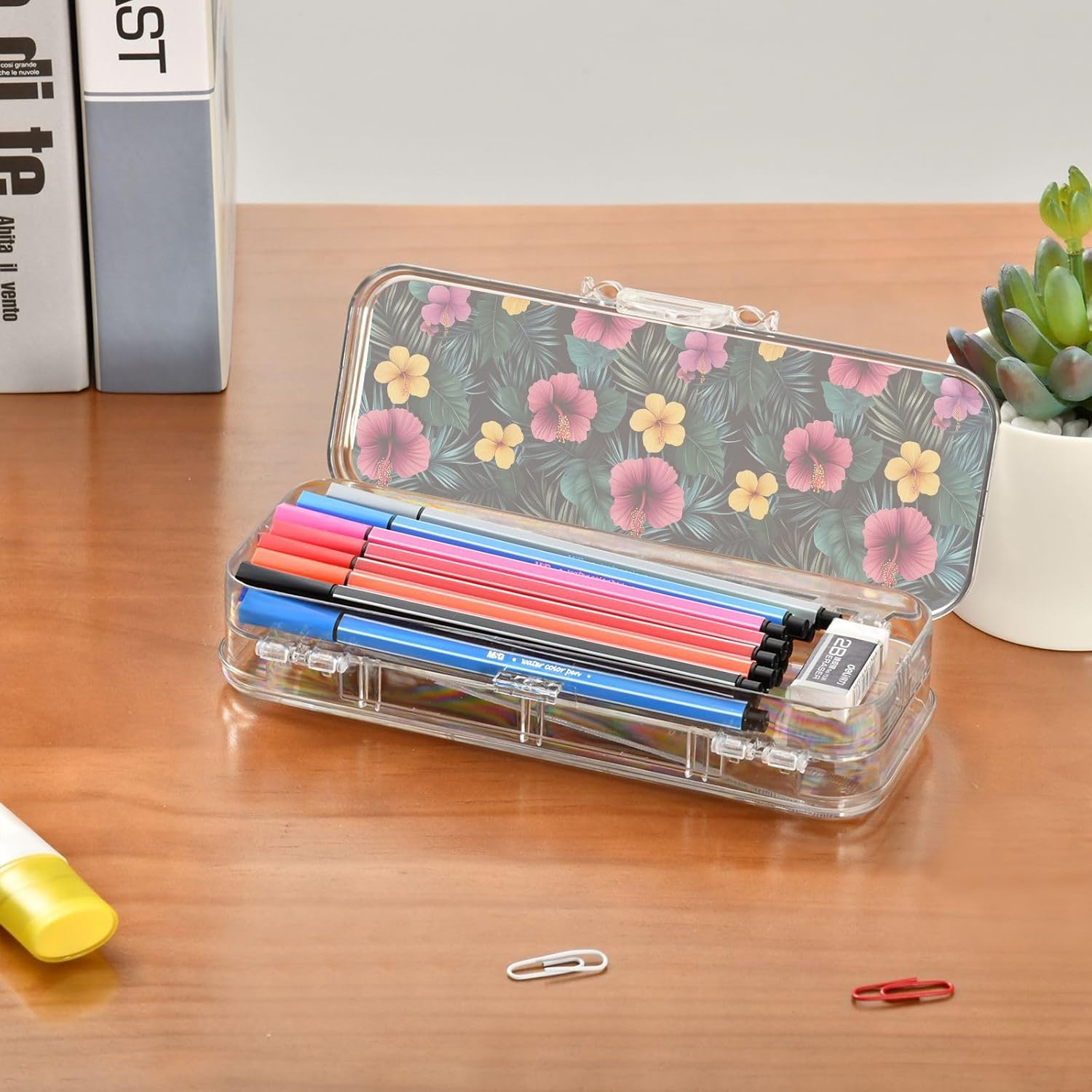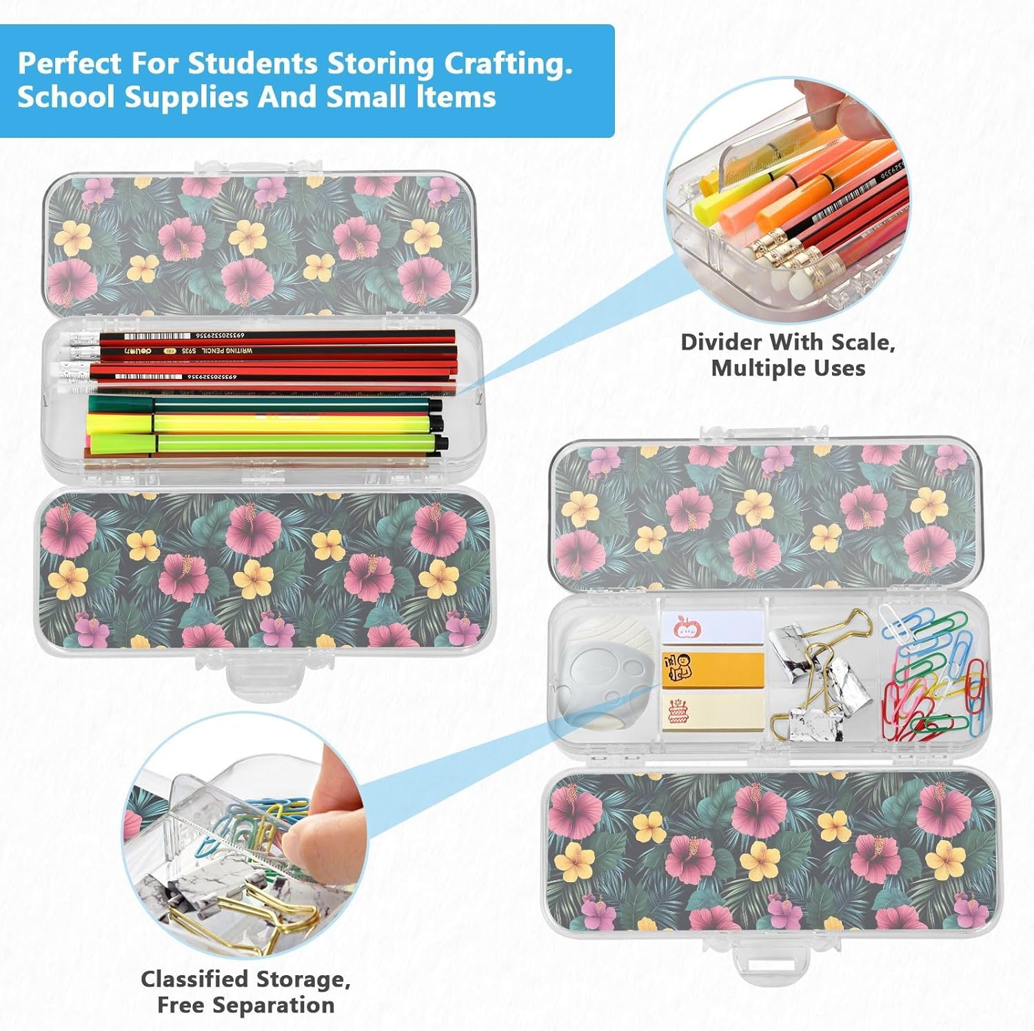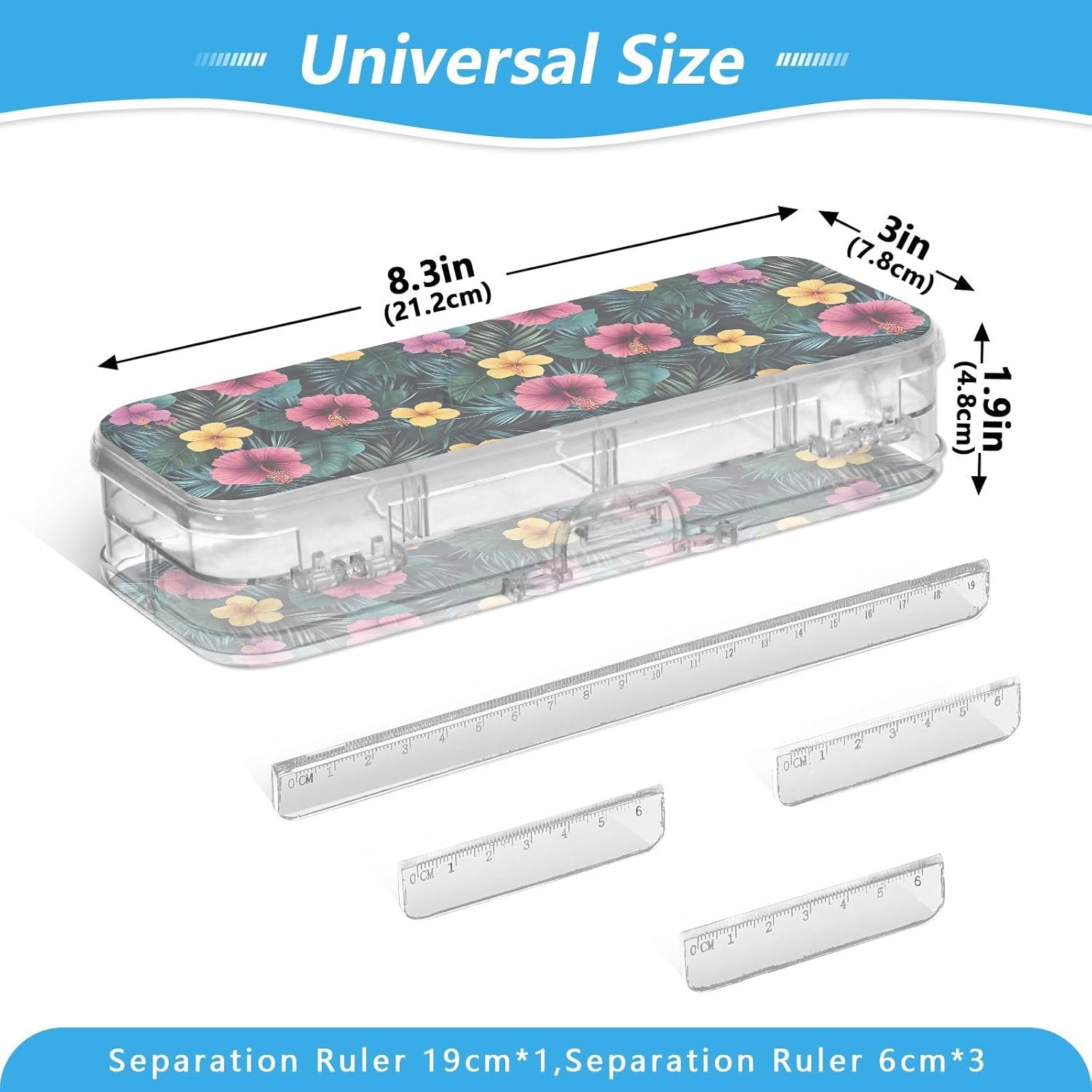Trasparente e portatile: la scatola di plastica trasparente è realizzata in plastica PET trasparente per una visibilità istantanea del contenuto. Dimensioni compatte (21,1 x 7,6 x 4,8 cm) per scuola, ufficio, viaggi o avventure di schizzi all'aperto. Doppio strato: il design a doppio strato offre una grande capacità. Entrambi gli strati possono contenere matite, pennarelli o piccoli oggetti come gomme, graffette e clip. Consigliato per bambini dai 3 anni in su. Divisori regolabili: la scatola di plastica per matite dispone di 3 divisori corti (6 cm) e 1 lungo (19 cm). Rimuovili liberamente per creare 6 scomparti, mantenendo tutti gli articoli di cancelleria organizzati e prevenendo perdite e disordine disordinato. Righelli di separazione multiuso: ogni divisore rimovibile funge da pratico righello piccolo (6 cm o 19 cm) per misurazioni rapide in classe o in viaggio. Soluzione versatile per l'organizzazione: design di archiviazione su due lati. Separa facilmente diversi oggetti (matite contro gomme). Aiutare bambini e adulti a mantenere in ordine scrivanie, borse o kit di attività.