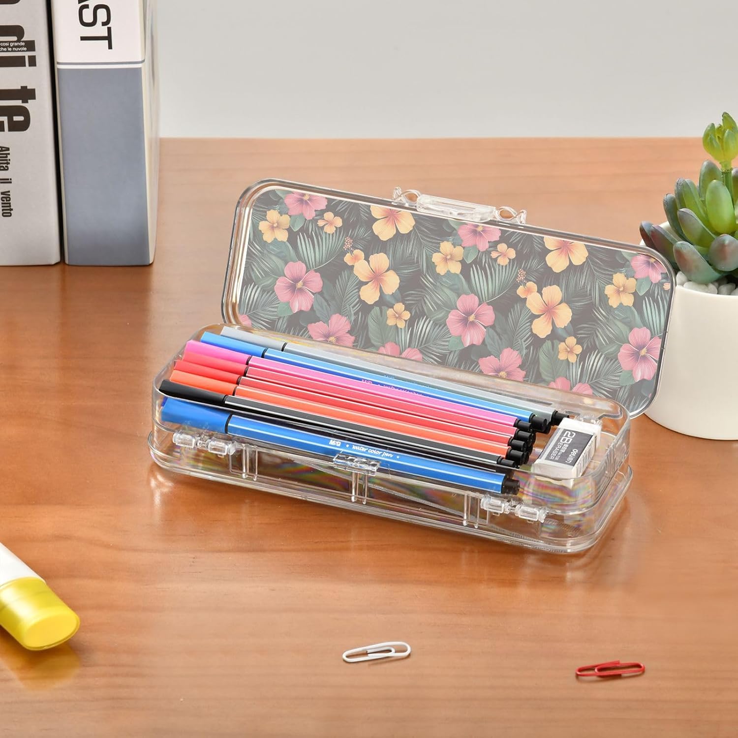 Plastica PET. Resistenza: presenta una struttura robusta e trasparente in PET. Facile da pulire; si consiglia il lavaggio a mano (non lavare in lavatrice/candeggina). Mantiene la chiarezza e resiste all'uso quotidiano negli zaini per l'apprendimento, il lavoro o i viaggi. Doppio strato: il design a doppio strato offre una grande capacità. Entrambi gli strati possono contenere matite, pennarelli o piccoli oggetti come gomme, graffette e clip. Consigliato per bambini dai 3 anni in su. Divisori regolabili: la scatola di plastica trasparente presenta 3 divisori corti (6 cm) e 1 lungo (19 cm). Rimuovili liberamente per creare 6 scomparti, mantenendo tutti gli articoli di cancelleria organizzati e prevenendo perdite e disordine disordinato. Portatile e sicuro: custodia compatta per scuola, ufficio, gite o viaggi. La chiusura a scatto mantiene il contenuto al sicuro durante . Trasporta oggetti artistici, articoli di cancelleria o oggetti essenziali da viaggio ordinatamente organizzati Coperchio affidabile: la chiusura a scatto assicura che entrambi gli strati rimangano al sicuro. Il contenuto rimane protetto e perfettamente posizionato.