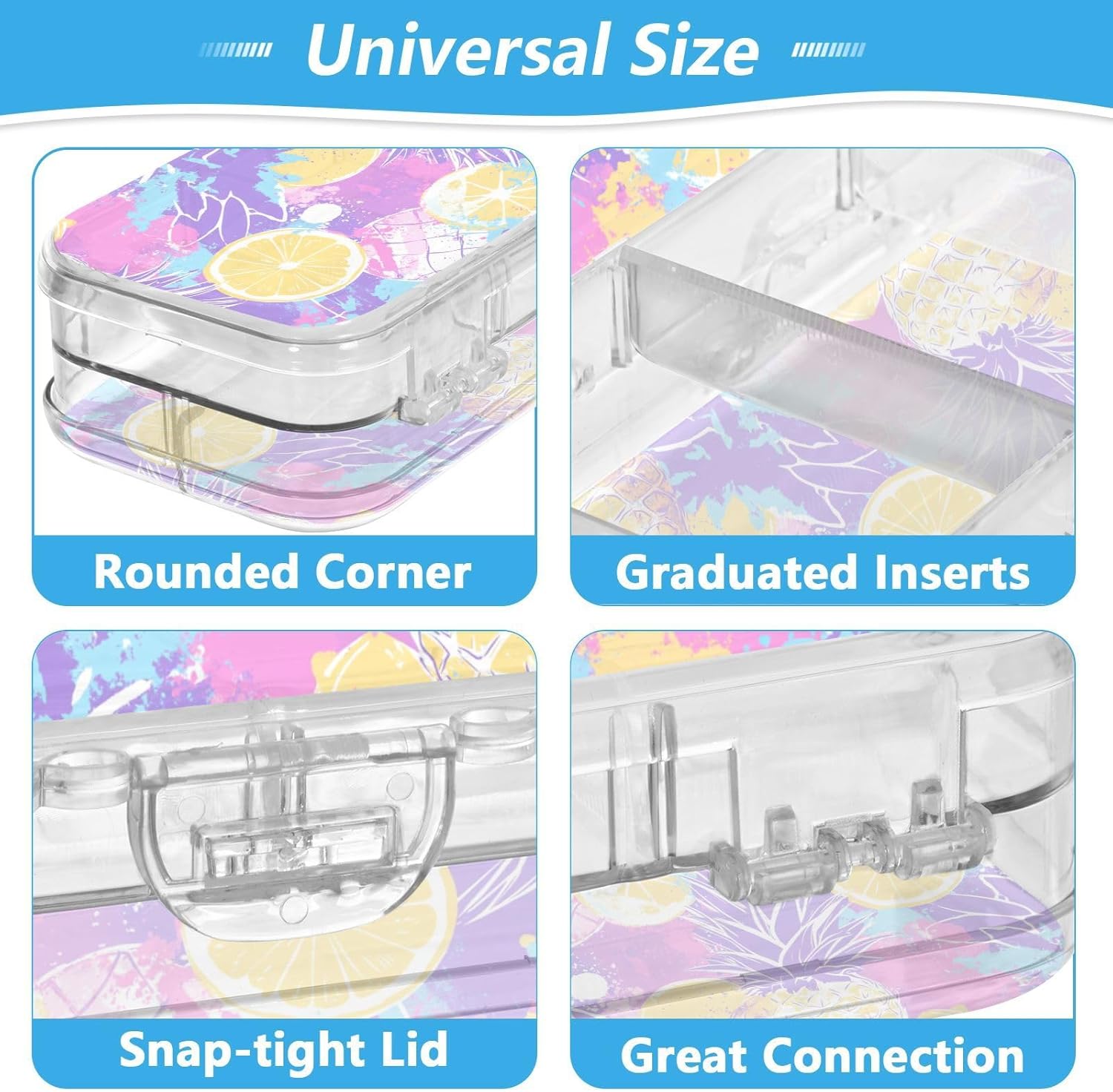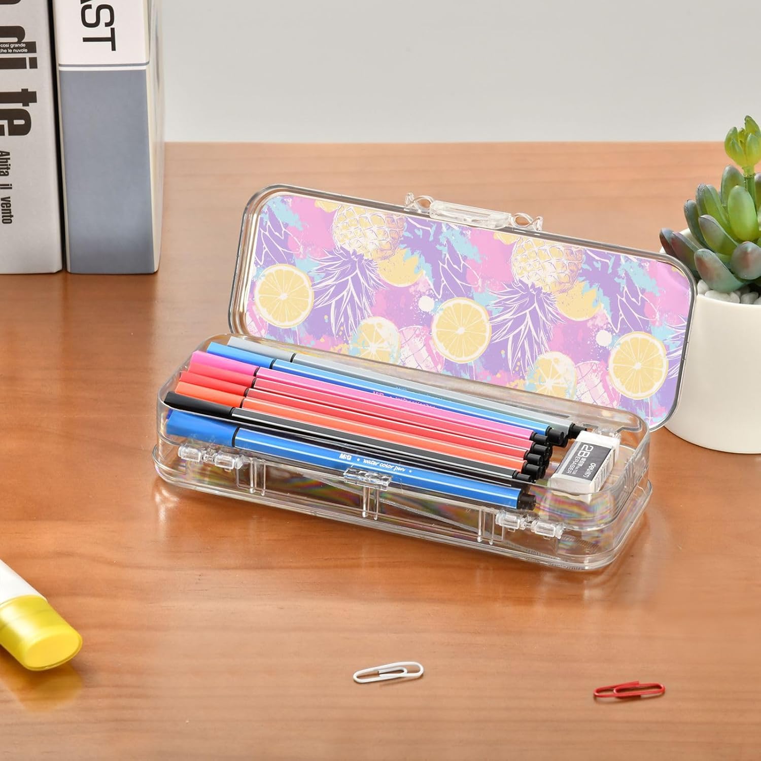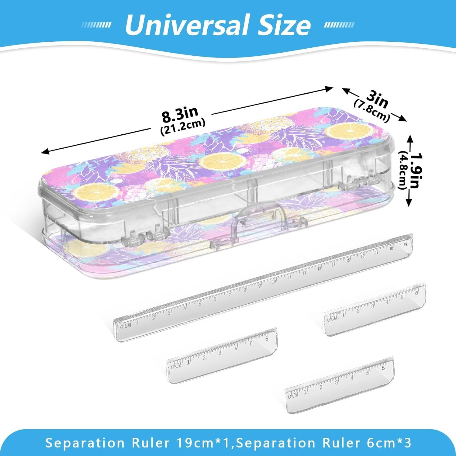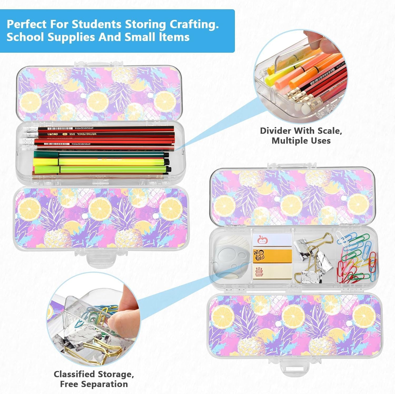 Materiale trasparente: la scatola di plastica trasparente misura 21,1 x 7,6 x 4,8 cm, realizzata in PET trasparente resistente ai graffi. Visualizza facilmente i contenuti e prendi ciò di cui hai bisogno per studiare, lavorare o viaggiare. Design trasparente a doppio strato: massimizza lo spazio di archiviazione nel minimo spazio. Due scomparti in plastica PET trasparente per matite, pennarelli, gomme, clip e altro ancora. Perfetto per mantenere la scuola, l'ufficio o oggetti artigianali visibili e accessibili. Adatto per bambini dai 3 anni in Conservazione personalizzabile: la scatola trasparente include 3 divisori corti (6 cm) e 1 lungo (19 cm). Rimuovili facilmente per progettare 6 sezioni, risolvendo la disorganizzazione e mantenendo ogni piccolo oggetto classificato. Divisori e righelli di separazione: 3 divisori corti (6 cm) e 1 lungo (19 cm) sono anche righelli funzionali! Adatto per compiti rapidi e soluzioni intelligenti per studenti e artigiani. Soluzione versatile per l'organizzazione: design di archiviazione su due lati. Separa facilmente diversi oggetti (matite contro gomme). Aiutare bambini e adulti a mantenere in ordine scrivanie, borse o kit di attività.