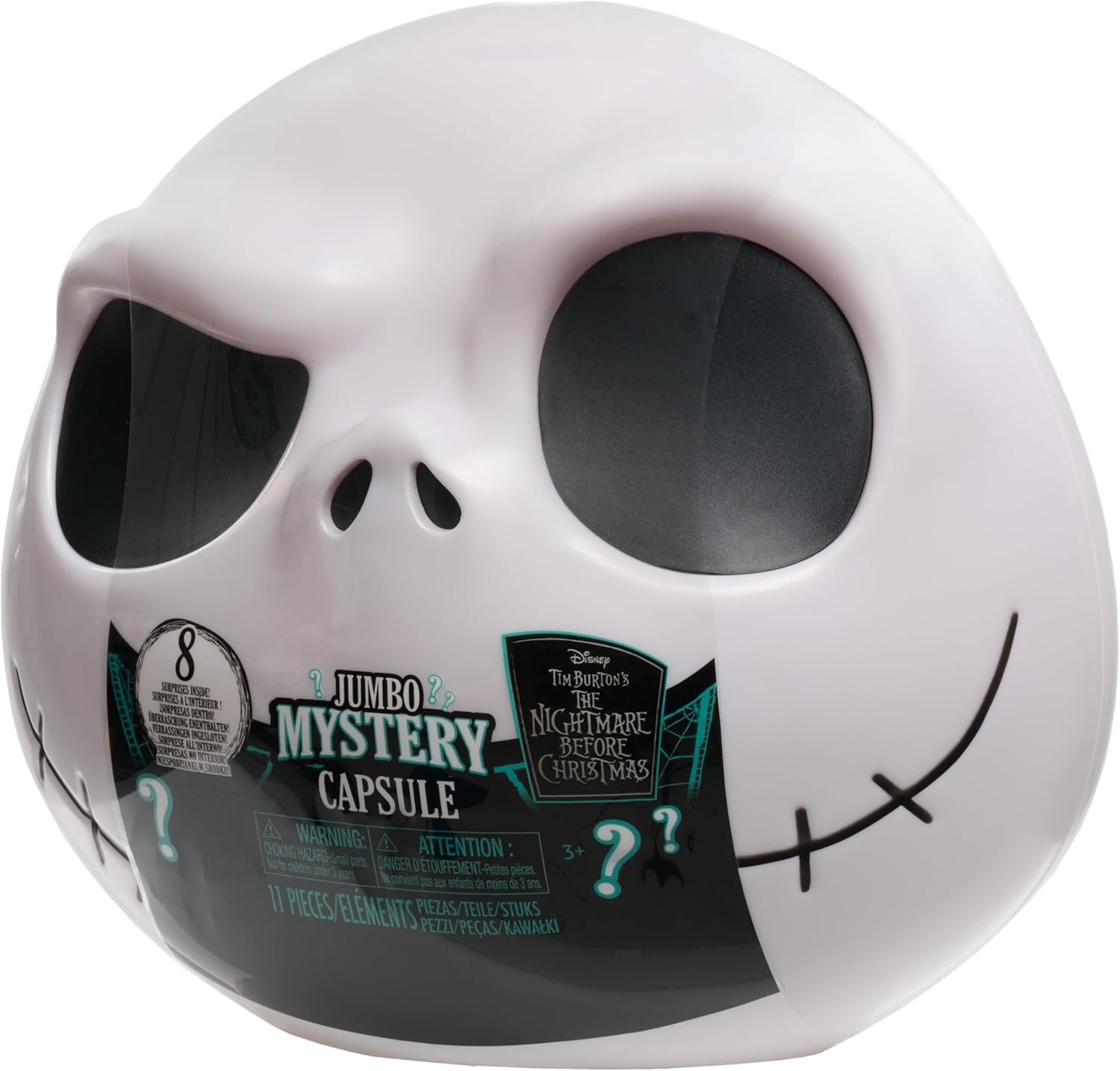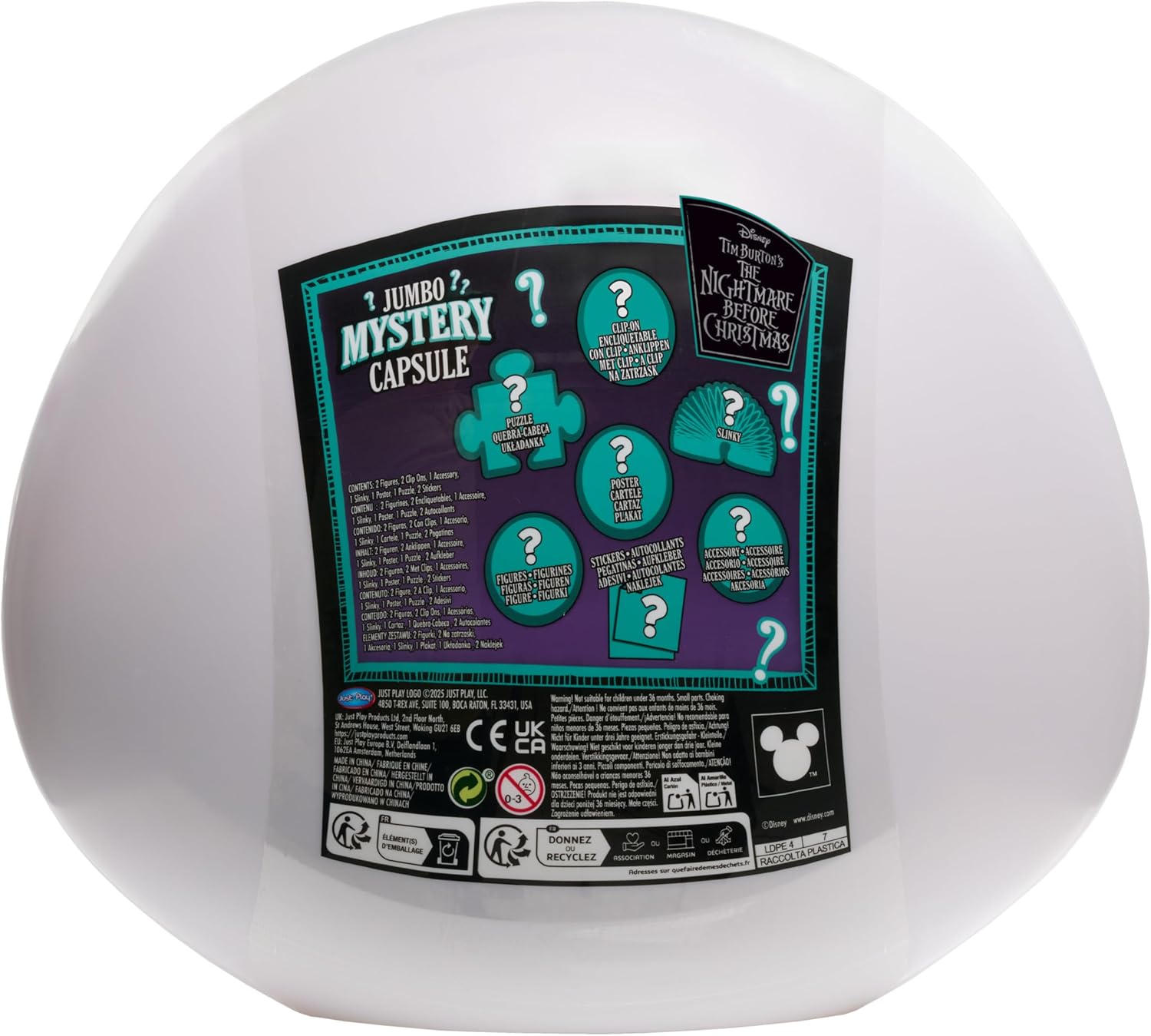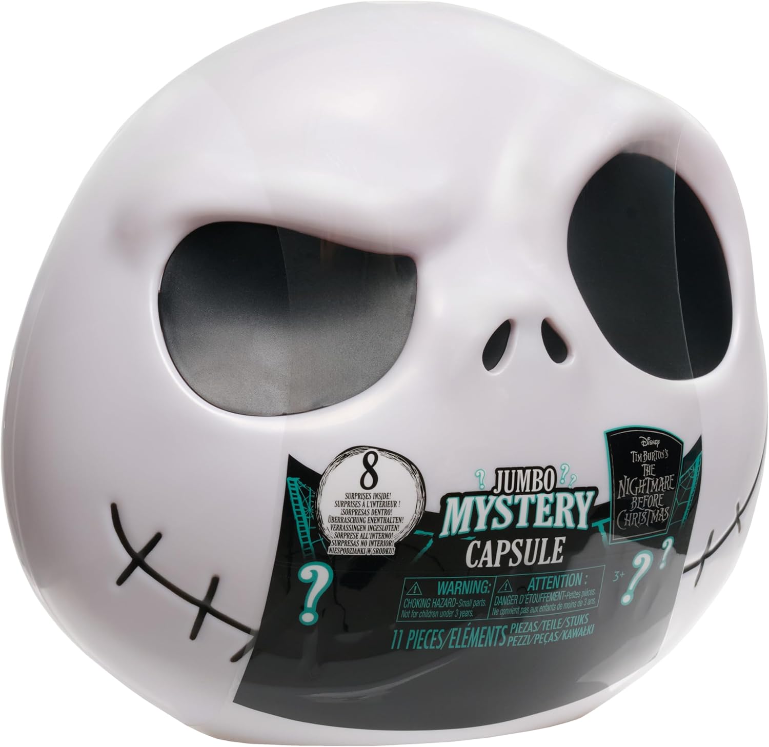 Includes: 2 figures, 2 clip ons, 1 accessory, 1 Slinky, 1 poster, 1 puzzle, and 2 stickers. 8 Frightfully Fun Surprises: The Disney Tim Burton’s The Nightmare Before Christmas Jumbo Mystery Capsule comes packed with spellbinding surprises for loads of unboxing fun. Frightfully Fun Surprises: Pry open this 9-inch Jack Skellington capsule to reveal 8 blind bags filled with eerie treasures for fans of all ages to unwrap and discover. Ghoulishly Great Value: From mini figures to creative activities—this capsule is packed with a variety of play experiences in one thrilling blind-box-style package. Creepy Creative Play: Whether displaying figures, decorating with stickers, or accessorizing with backpack clips, each surprise inspires playtime fun and imaginative storytelling. Reusable Container: The Jack Skellington head makes a delightfully eerie display and a fitting hideaway for trinkets, toys, and curiosities once the unboxing fun is done. Officially Licensed Disney Toys by Just Play: This Disney Jumbo Blind Capsule makes an enthralling birthday present, anytime surprise, or holiday gift for fans of Disney Tim Burton’s The Nightmare Before Christmas. Ages 3 years and up.