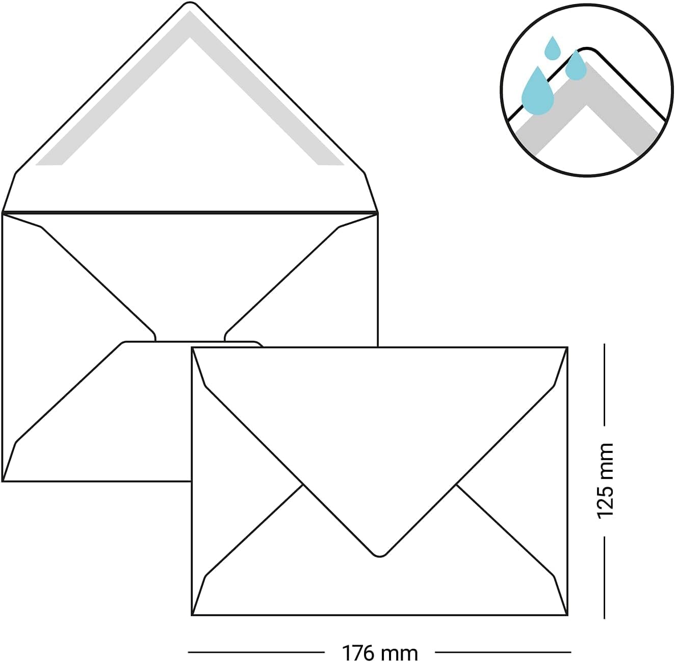 Karten und Co., 25 buste per lettere, formato B6 (12,5 x 17,6 cm), con chiusura dorata Adesivo umido con linguetta triangolare (oro). Grammatura: 100 g/m².