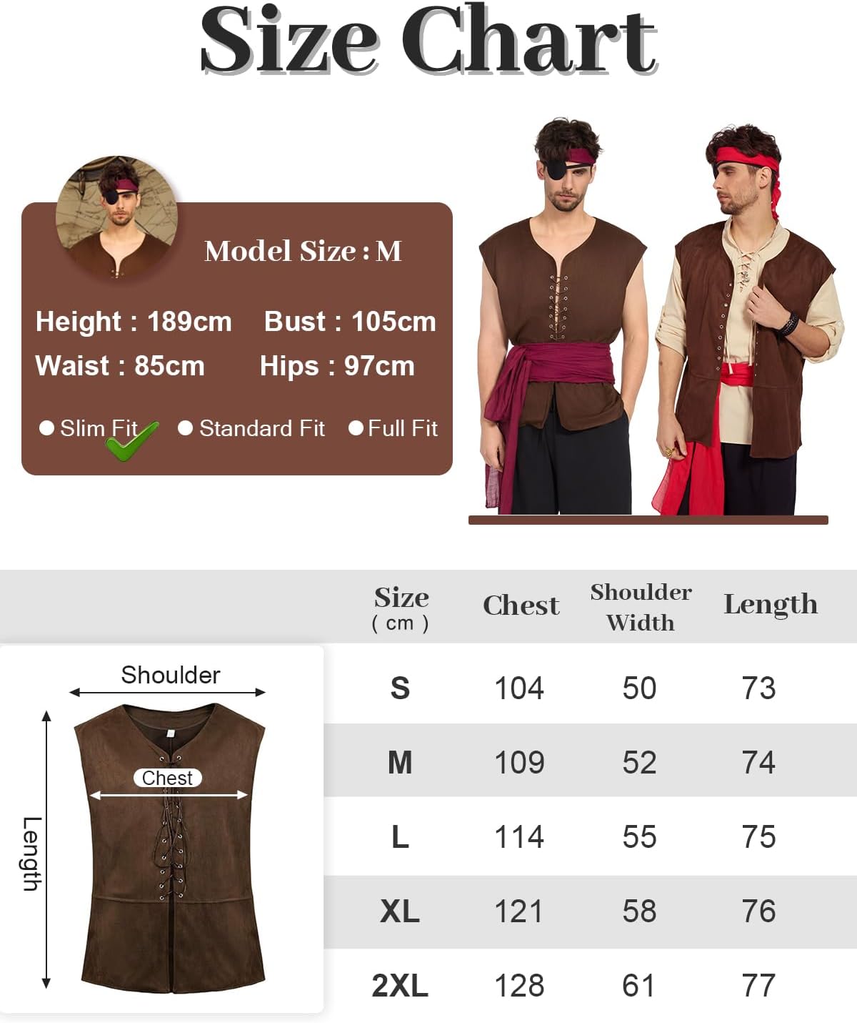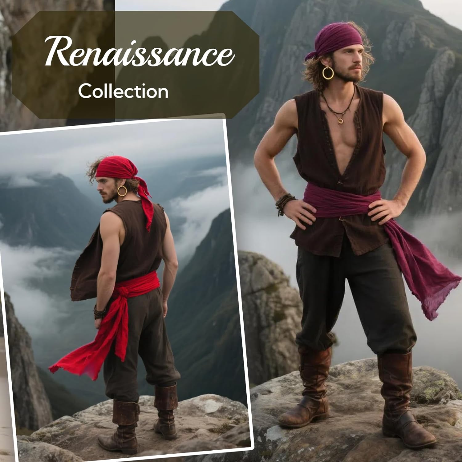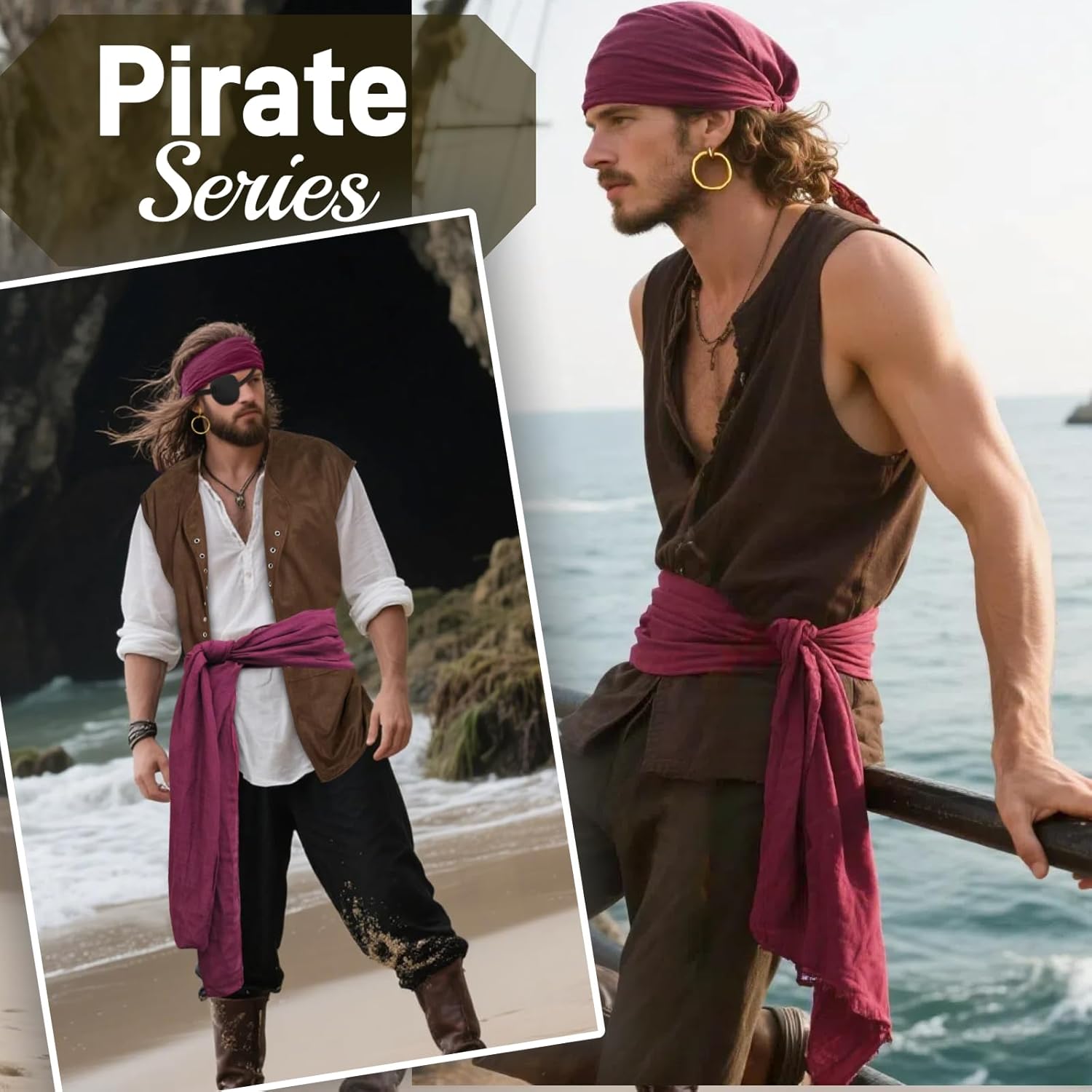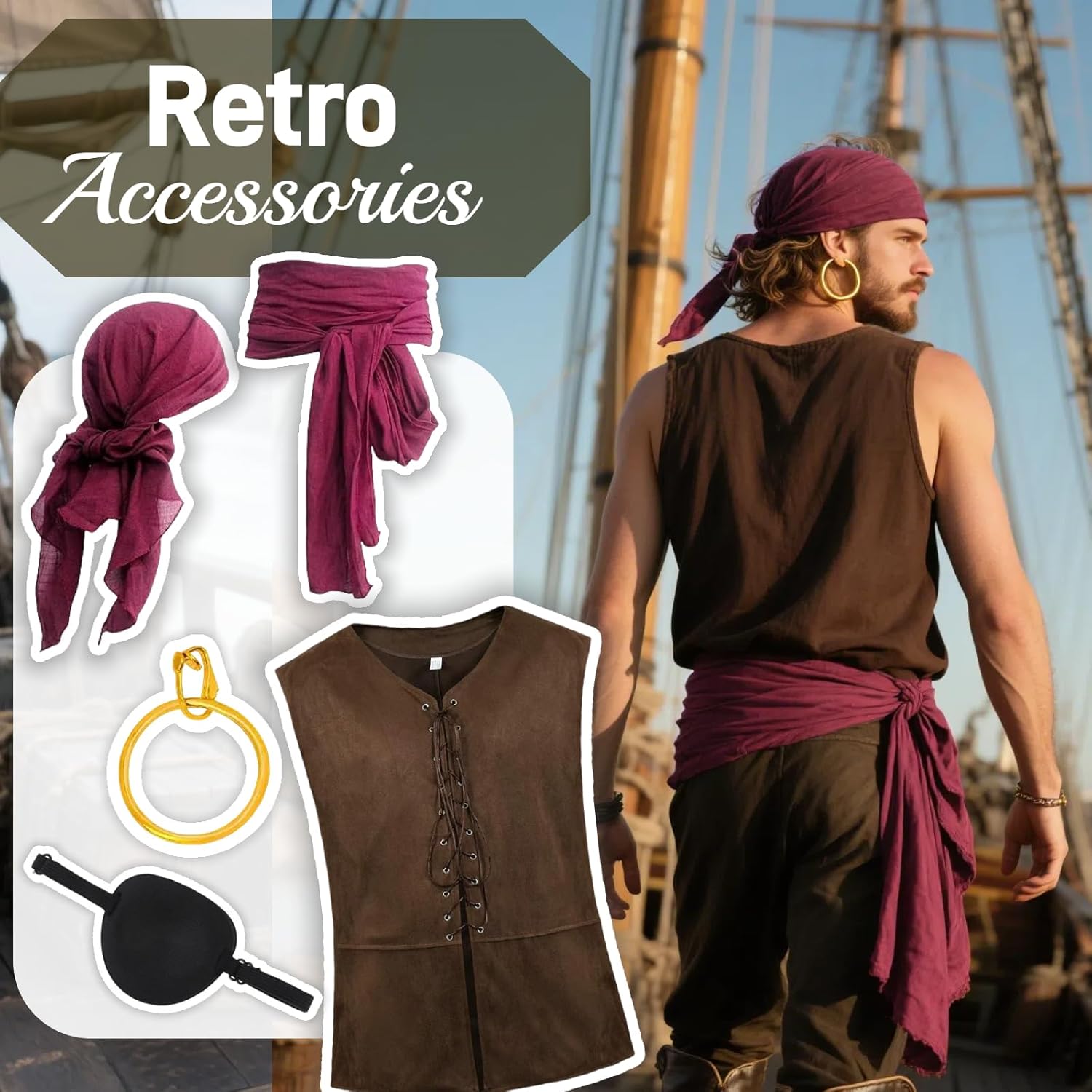kasahara Costume da pirata da uomo, stile medievale, retrò, abbigliamento rinascimentale, costume da pirata, bandana, cintura per gli occhi, costume vichingo, costume da carnevale