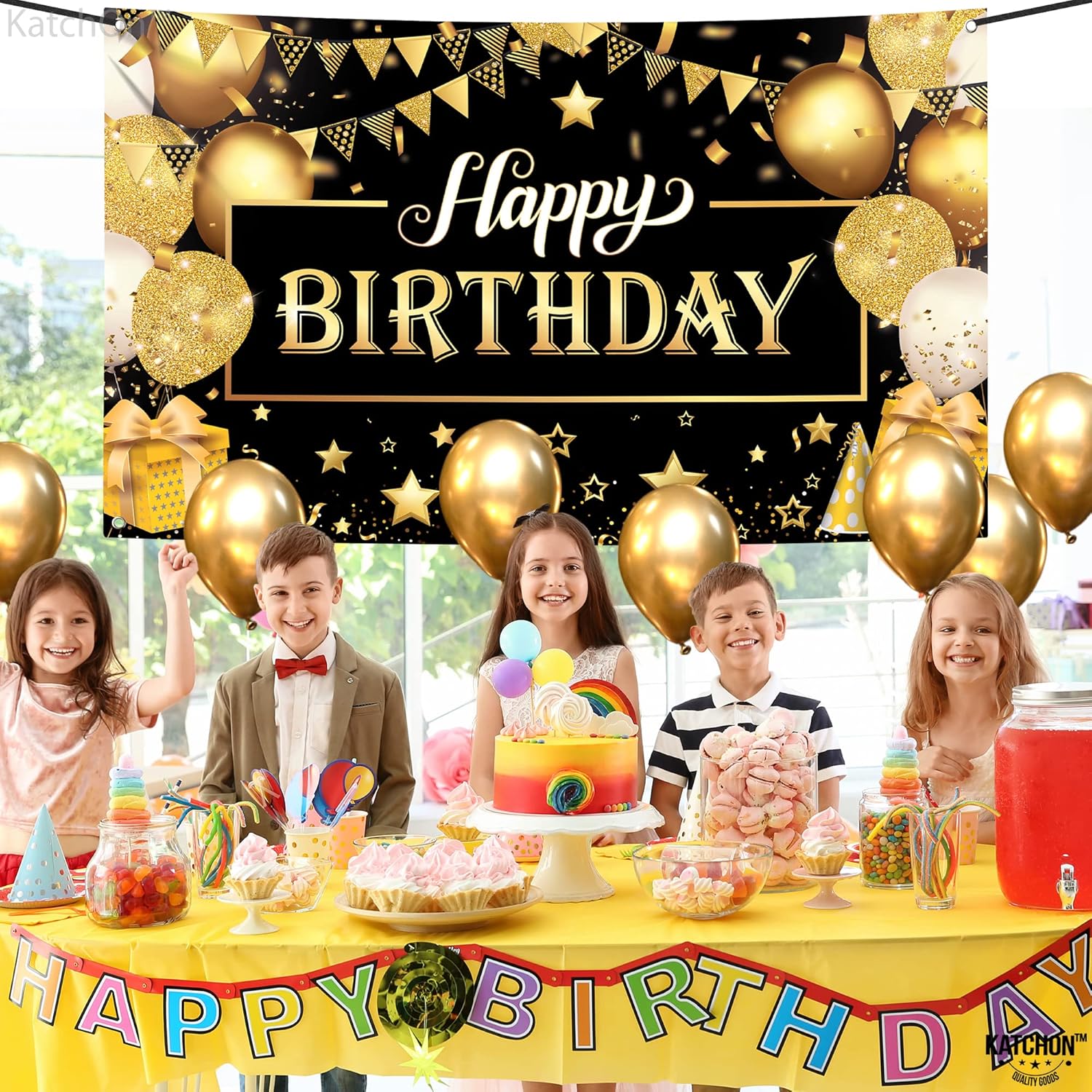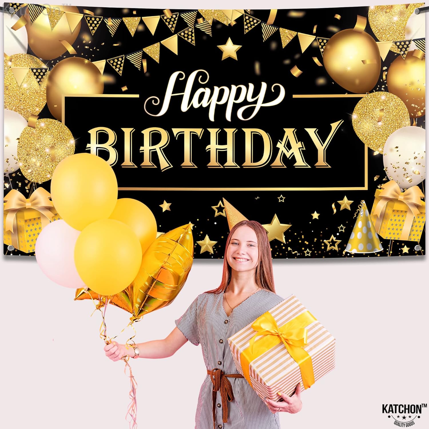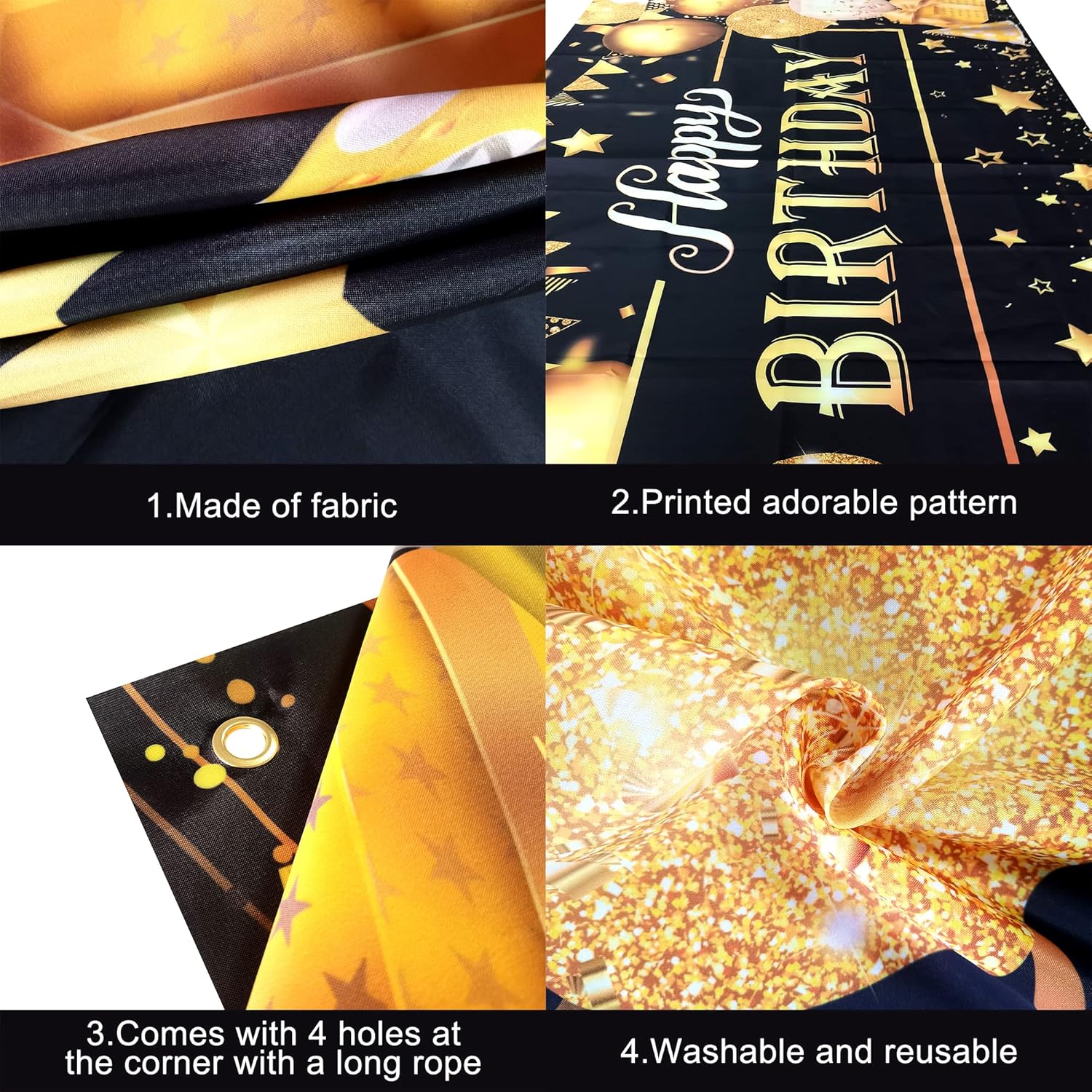 Dimensioni extra large - 180x110 cm: un affascinante sfondo per striscioni di buon compleanno con elementi neri e dorati, stampato con palloncini dorati scintillanti, stelle, coriandoli e cappellini di compleanno, che aggiungono bellezza e lasciano un'impressione profonda sugli ospiti con decorazioni di compleanno nere. Questo striscione di buon compleanno da uomo nero e oro è un'aggiunta perfetta alle tue decorazioni di buon compleanno. RIUTILIZZABILE