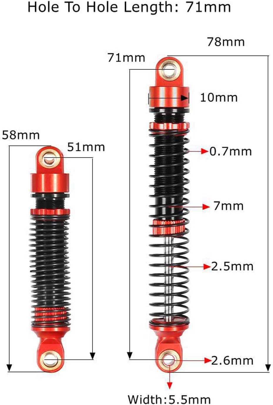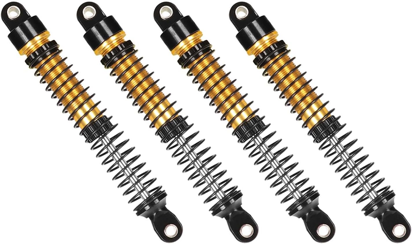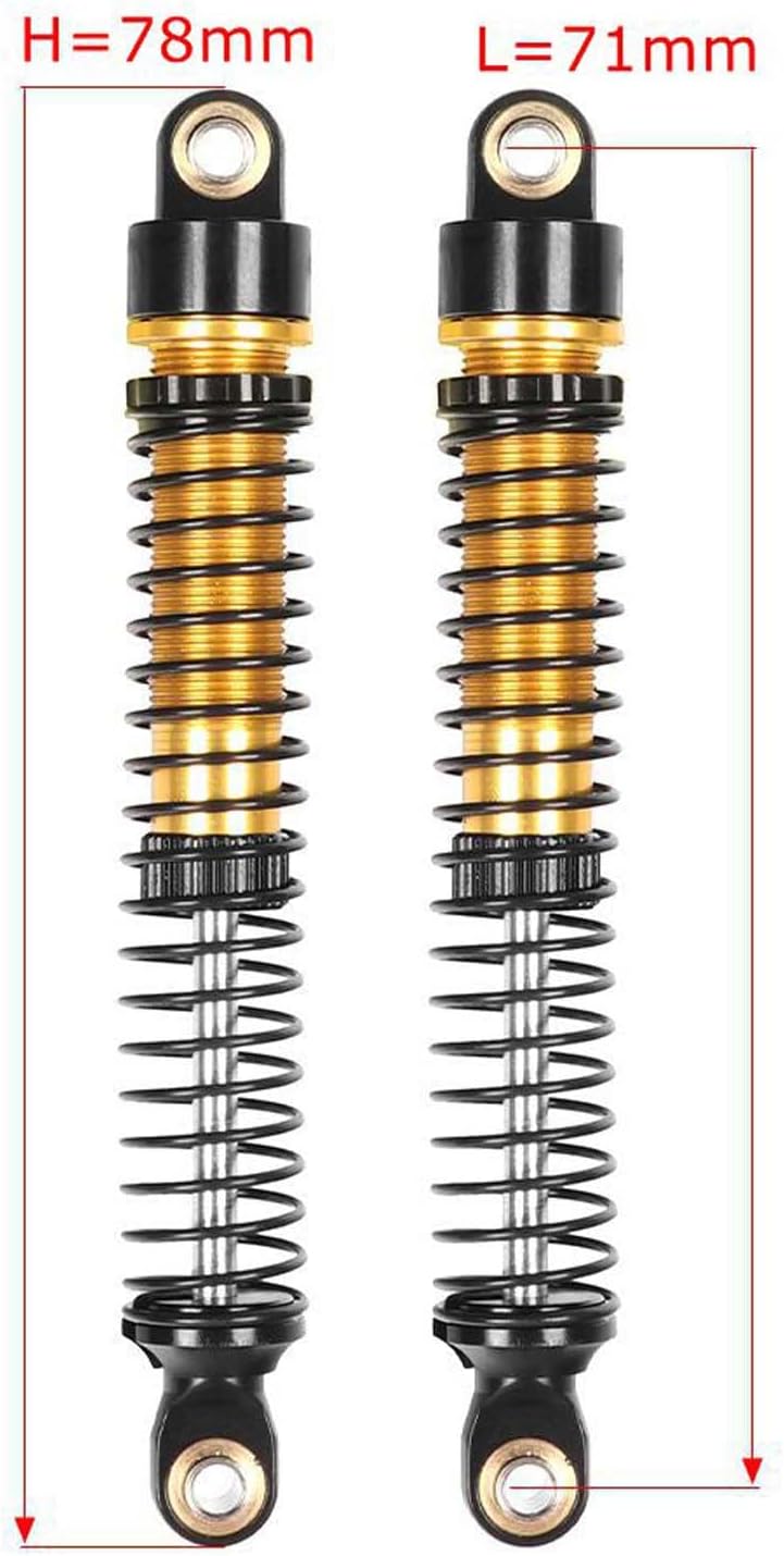 Stabilità ottimizzata: i nostri ammortizzatori garantiscono un'ammortizzazione uniforme e precisa. Riducono efficacemente le vibrazioni e garantiscono una stabilità di guida affidabile e una maneggevolezza precisa della tua auto in miniatura, anche su superfici esigenti. Aspetto e qualità convincenti: realizzato in alluminio 6061 con lavorazione CNC di precisione e anodizzato per una finitura liscia e durevole. Così combinano un design accattivante e una durata robusta. Miglioramento delle prestazioni per il tuo veicolo RC: grazie al suo corpo filettato, gli ammortizzatori possono essere regolati rapidamente e facilmente al precarico desiderato. Perfetto per ottimizzare le prestazioni del tuo modello in modo mirato. Trova la tua vestibilità perfetta: con una scelta di 5 misure (53 mm, 59 mm, 65 mm, 71 mm, 77 mm), si adattano perfettamente alla maggior parte dei modelli Crawler RC 1/12 1/18. Migliora le prestazioni del tuo RC Crawler oggi stesso Nota: i nostri ammortizzatori sono forniti senza olio. Questo ti dà la flessibilità di adattare individualmente il tipo e la quantità di olio alle tue esigenze per ottenere diverse caratteristiche di smorzamento.