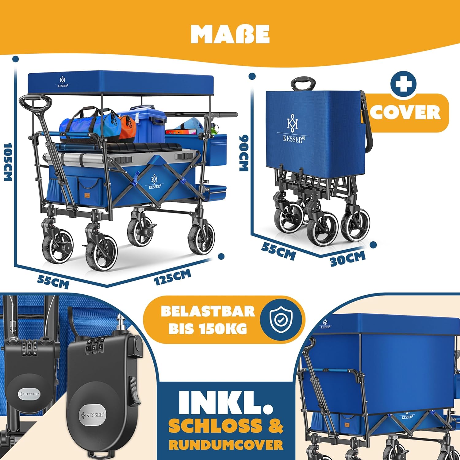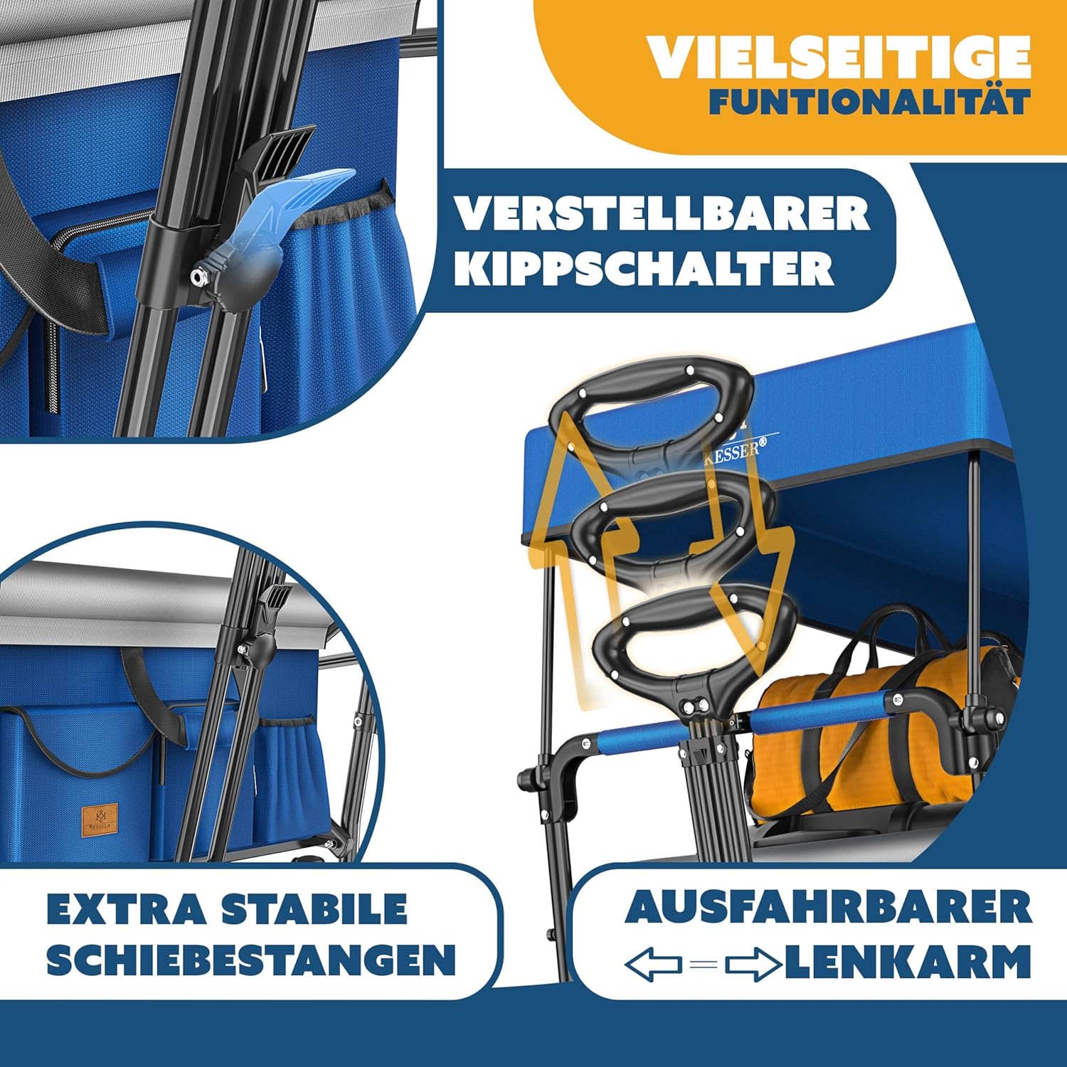 Facile da usare: grazie al vano piedi richiudibile, che si può aprire e chiudere rapidamente, il bambino potrà godersi il viaggio con il carrello seduto o sdraiato. Inoltre, le comode sospensioni sulle nostre ruote in gomma dura ultra robuste garantiscono una guida piacevole, anche i percorsi più impegnativi possono essere facilmente gestiti. Inoltre, il carrello è dotato di due ruote anteriori girevoli a 360° e freni anteriori e posteriori. Il materiale resistente e la robusta struttura del telaio offrono una capacità di carico fino a 150 kg, in modo da poterlo caricare pesantemente e sono preparati per ogni avventura. Per proteggere in modo ottimale il vostro trasporto e i vostri bambini dal sole, il parasole rimovibile è protetto dai raggi UV. Allo stesso tempo funge da parapioggia in nylon Oxford 600D di alta qualità e resistente. Facile da montare: il carrello a mano di alta qualità si monta e si piega rapidamente con pochi gesti. Grazie al sistema di piegatura intelligente, il carrello GTS della marca KESSER può essere piegato in un batter d'occhio in una dimensione compatta di soli 90 cm x 55 cm x 30 cm ed è quindi facile da trasportare e riporre. Approfittate di una sicurezza ottimale e di una coscienza tranquilla, grazie ai sistemi a due cinture nel carrello KESSER da trasporto. I vostri bambini sono comodi e protetti dalla caduta del carrello. Con il nostro carrello potrete godere di momenti preziosi con la massima sicurezza. Massimo comfort e protezione ottimale dalle intemperie. Abbastanza spazio per deliziosi cibi, bevande e molto spazio per i più piccoli. È inclusa una serratura di sicurezza Facile da usare: mentre con la sua superficie di carico, le tasche aggiuntive sulla parte posteriore e vari supporti offrono spazio ordinato per gite con bambini, festival o altre attività ricreative, può essere ripiegato in modo compatto se necessario. Inoltre, il tetto rimovibile offre una protezione affidabile da sole e pioggia e la copertura completa garantisce la privacy. La funzionalità incontra un design sofisticato.