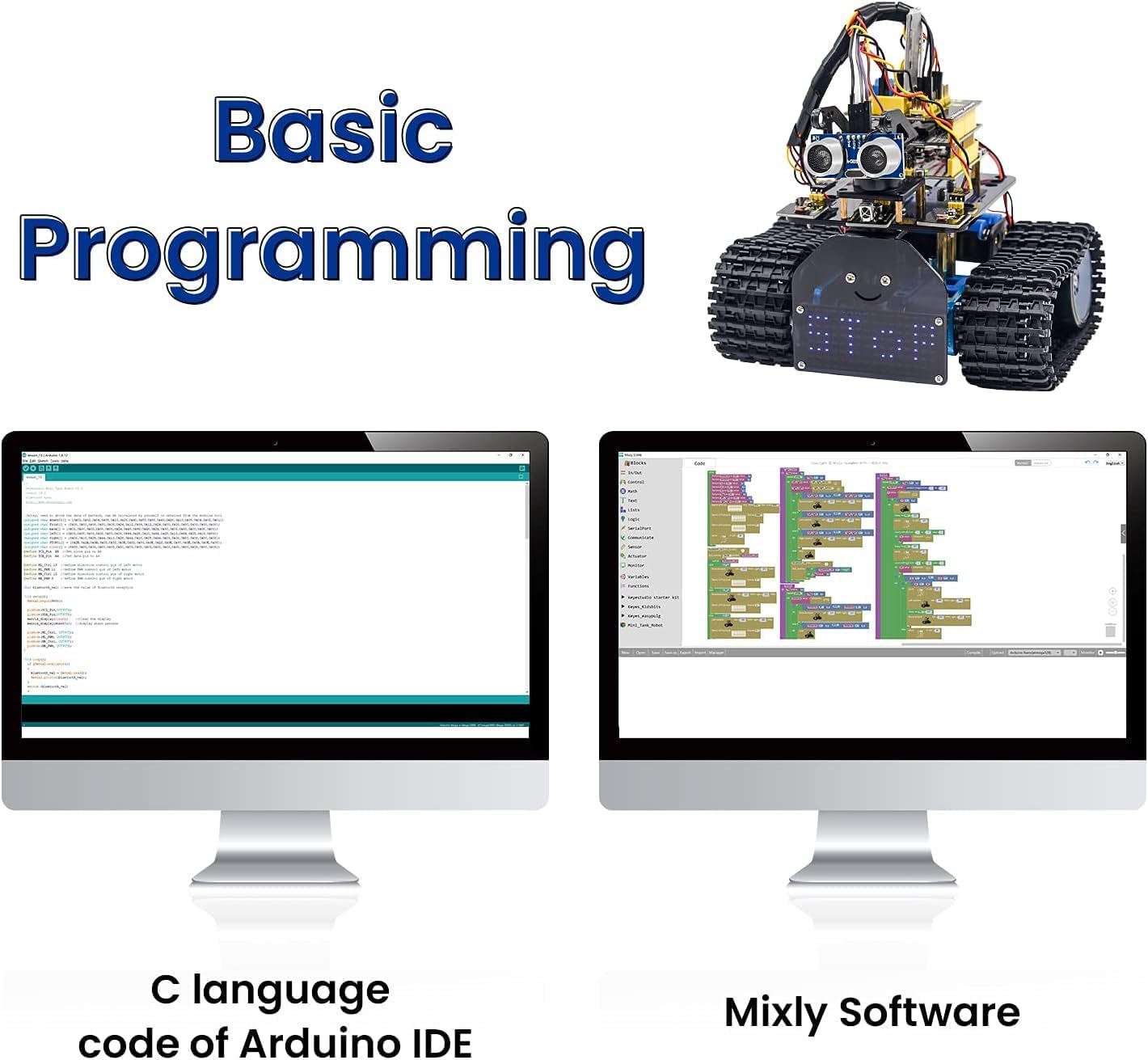 【Programmierbares Lernkit für die Arduino-Programmiergrundlage】 Basierend auf der Erweiterungsplatine für Roboterantriebe ist dieses MINT-Lernauto-Kit eine Hilfe für diejenigen, die über Arduino-Programmierkenntnisse verfügen, ein fortgeschrittenes pädagogisches Wissenschaftskit für Kinder, die Robotik und Programmierung lernen. 【Programmazione di Scratch e Arduino C】 Il kit robot serbatoio STEM oltre alle consuete funzioni di tracciamento della linea, evitamento degli ostacoli e telecomando IR, ha anche driver del motore, rilevamento degli ultrasuoni e comunicazione Bluetooth e utilizza il modulo LED per creare espressioni adorabili. E aiuterà a sviluppare la creatività, la coordinazione occhio-mano, la concentrazione e il pensiero logico dei bambini. 【Componenti in metallo e CPU UNO Plus】 Utilizza lo stesso chip di Arduino UNO e i componenti principali sono realizzati in lega di alluminio aeronautico di alta qualità. Questo tipo di materiale metallico è sicuro, leggero, resistente e durevole. Ciò consente molte opzioni di espansione sul lato meccanico, elettronico e di codifica. 【Facile da assemblare】 Non c'è bisogno di saldature aggiuntive, con un tutorial online per l'installazione e Arduino, codice Scratch. (Le batterie non sono incluse, è necessario portare le proprie batterie 18650). Puoi ottenere tutorial dettagliati da 👉https://fs.keyestudio.com/KS0555 【Regalo educativo ideale】 È un regalo perfetto per i bambini e gli amanti dei robot. È anche il regalo educativo ed educativo perfetto per ragazzi e ragazze per compleanni, festa dei bambini, Natale, Pasqua, attività STEM, progetti STEM, campo estivo, ritorno a scuola e momenti divertenti a casa.