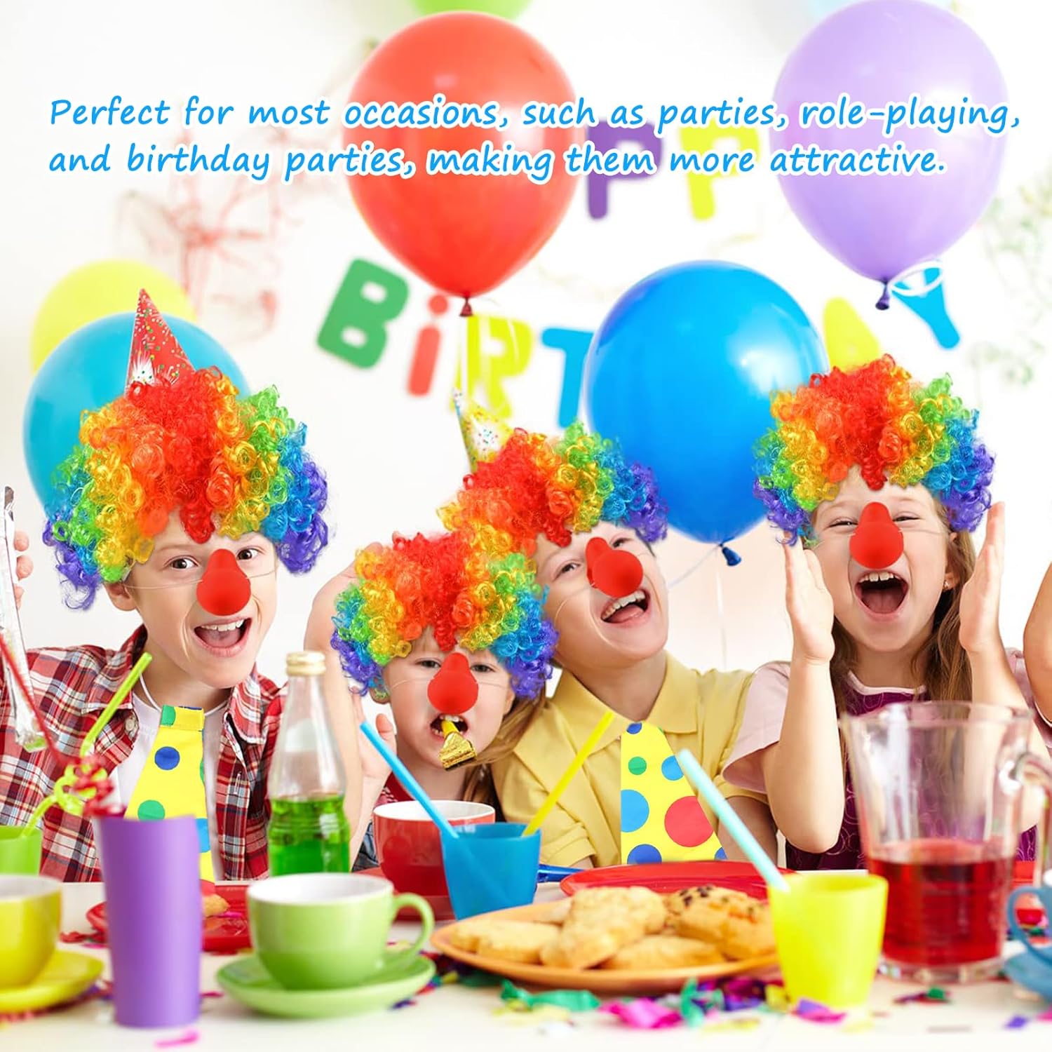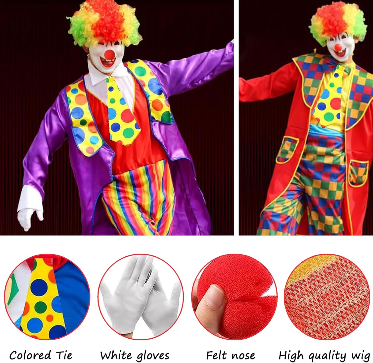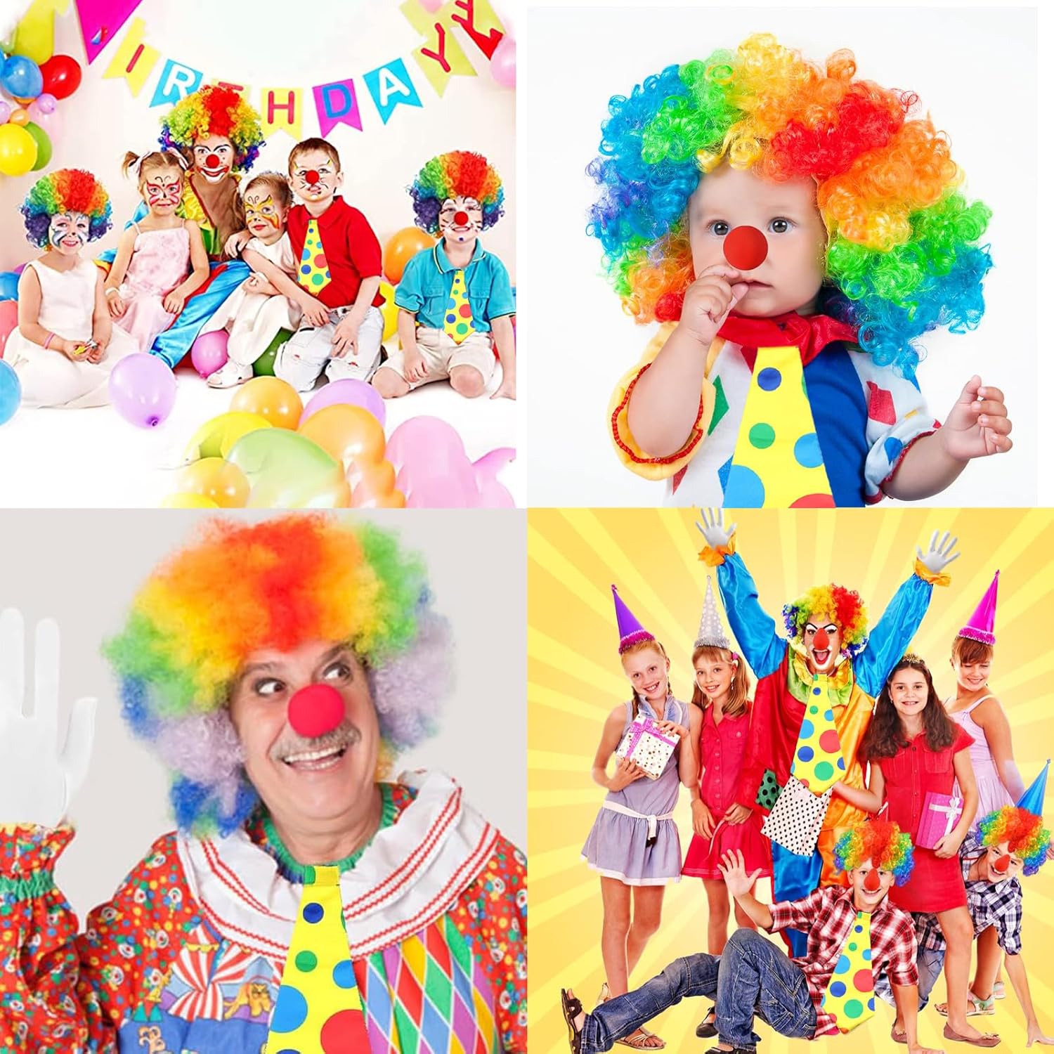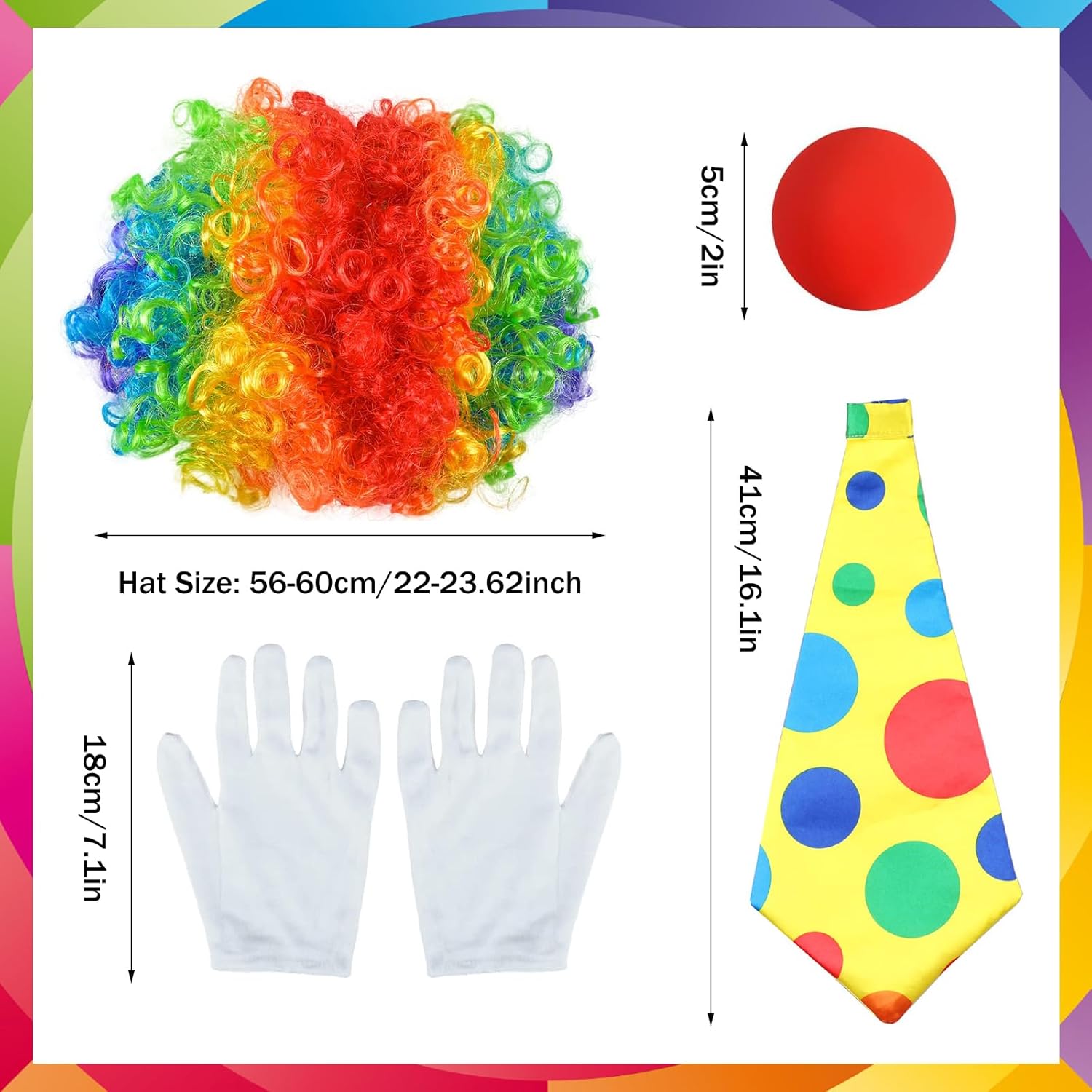 Confezione: La confezione contiene 4 pezzi di accessori da clown, tra cui 1 parrucca colorata da clown, 1 paio di guanti bianchi da clown, 1 cravatta da clown e 1 naso rosso; la parrucca con è adatta alla maggior parte delle teste. Materiali di alta qualità: la parrucca di Joker è realizzata in fibre sintetiche di alta qualità. Il naso rosso è realizzato in spugna di alta qualità, leggera e morbida e molto comoda da indossare. Alla moda e attraente: il nostro costume da clown da circo è dotato di una bella parrucca color arcobaleno con capelli ricci per un look carino e accattivante, una cravatta gialla brillante con punti irregolari su di essa per un look giovane e carino, guanti bianchi da clown e un naso rosso da clown possono rendere l'intero costume più elegante. Scene applicabili: Nasi da clown rossi perfetti per la maggior parte delle occasioni come parchi di divertimento, circo, feste, carnevali, Natale, eventi sportivi, festival e vacanze, adatti anche per le persone a tenere feste cosplay per renderli più attraenti. Gioco di ruolo: parrucca da clown color arcobaleno, grandi capelli ricci, molto vicini alla nostra impressione del clown. Dopo aver indossato il costume da clown, si può andare a qualsiasi festa, creando un'atmosfera unica.