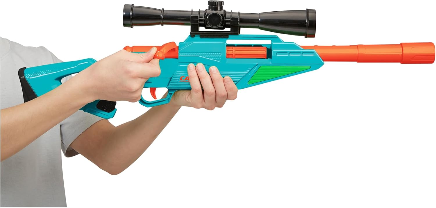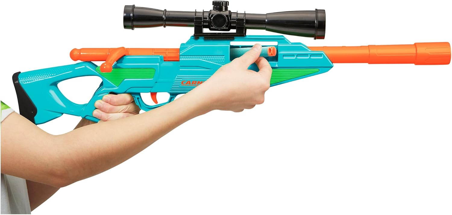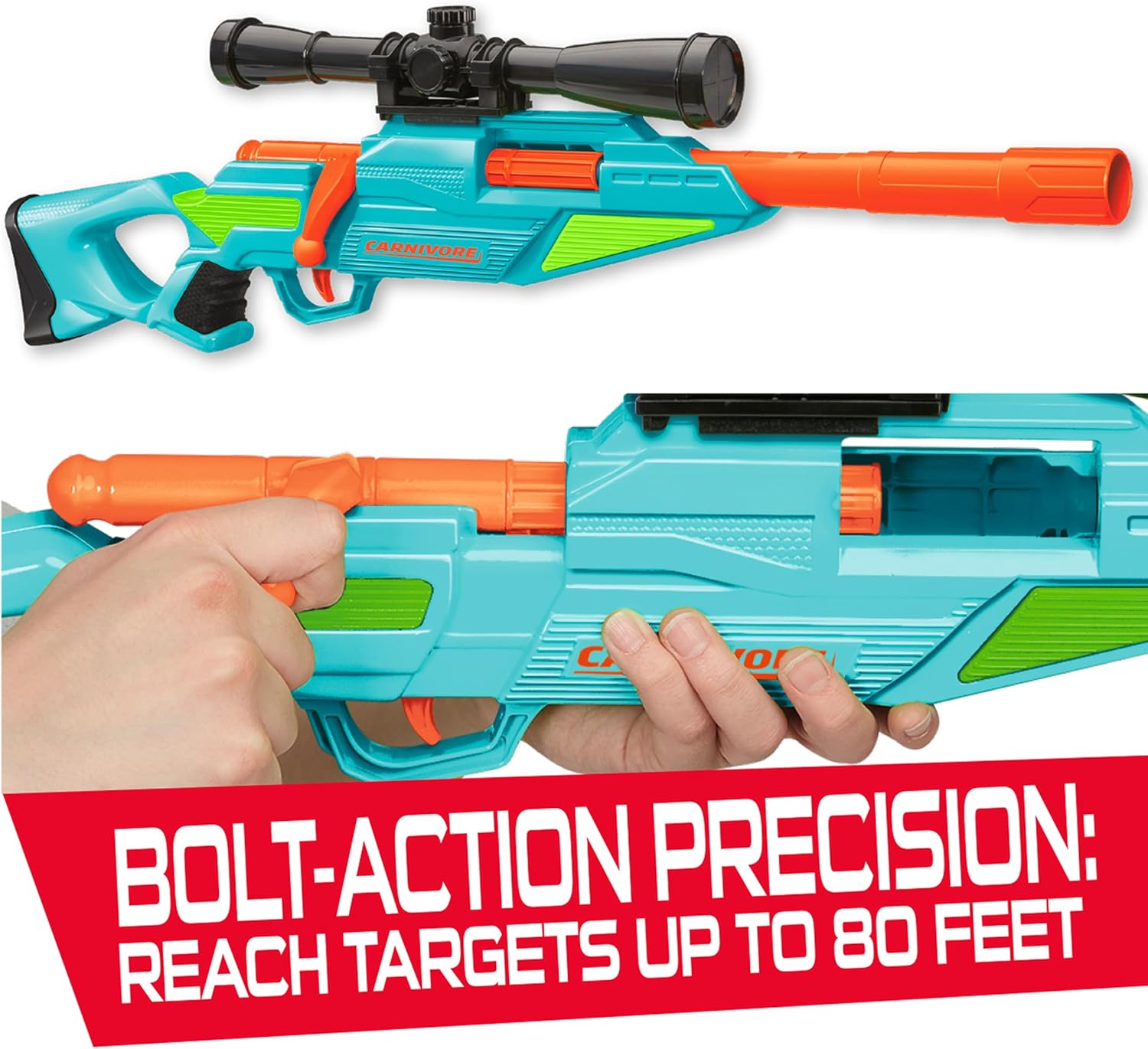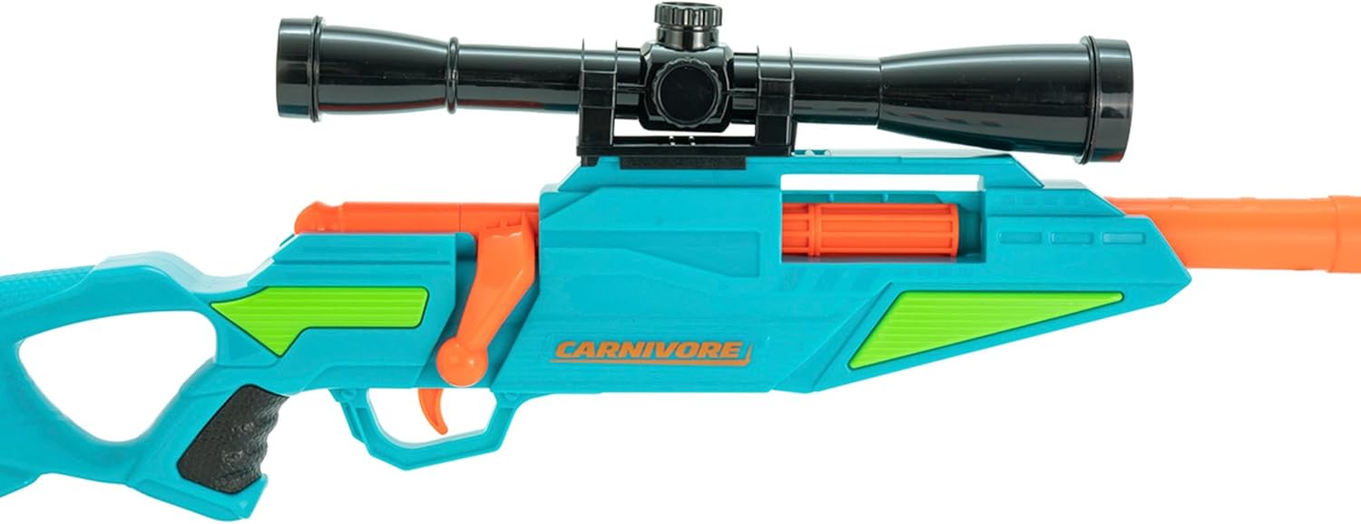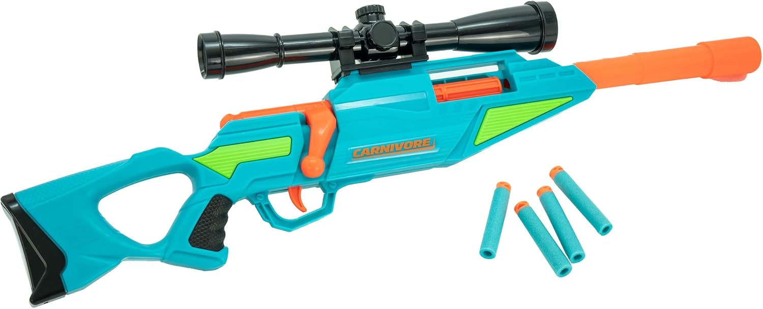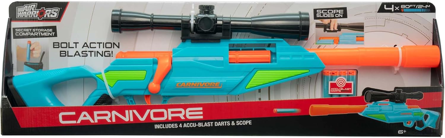 Air Warriors carnivoro con mirino e 4 dardi lunghi Bolt Action Blaster con occhiali e 4 dardi a lungo raggio Questo blaster fa una bella impressione. Per tutti i fan di Bolt Action Blasters. Ripeti con stile e carica i dardi uno alla volta.