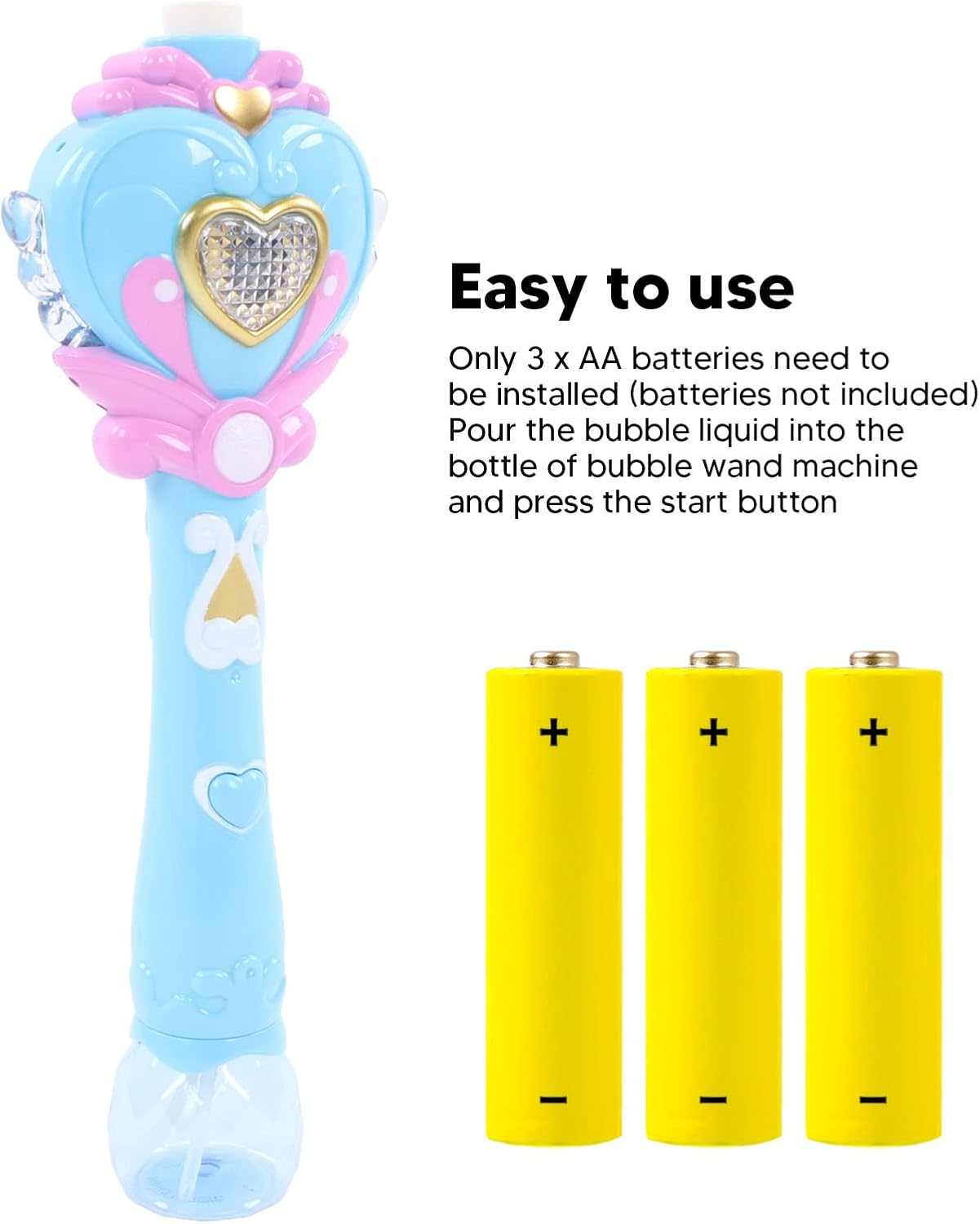 Ambito di applicazione: per diverse occasioni, per compleanni, feste e altre occasioni speciali si apre un fantastico e colorato mondo di bolle per. Include luci e musica: la macchina Bubble Wand Maker è dotata di luci lampeggianti e musica che possono produrre suoni e aggiungere più divertimento alla macchina a bolle. Bottiglia per bolle a prova di perdite: l'asta per bambini è realizzata in plastica ABS e ha un bordo antiscivolo e senza burr, per un uso sicuro. Il design delle bottiglie per bolle di fuoriuscita significa che non devi preoccuparti di giocare con piccole mani sporche. Facile da usare: le bacchette magiche Bubble Blower installano 3 batterie AA) batterie non incluse, versare il liquido per bolle nella bottiglia della macchina per bolle e premere il pulsante di avvio. Bacchetta magica a forma di coda di fata unica: la bacchetta magica illuminata Bubble Blower offre un design unico con cui il tuo bambino può giocare come una vera principessa in un mondo da favola da sogno.