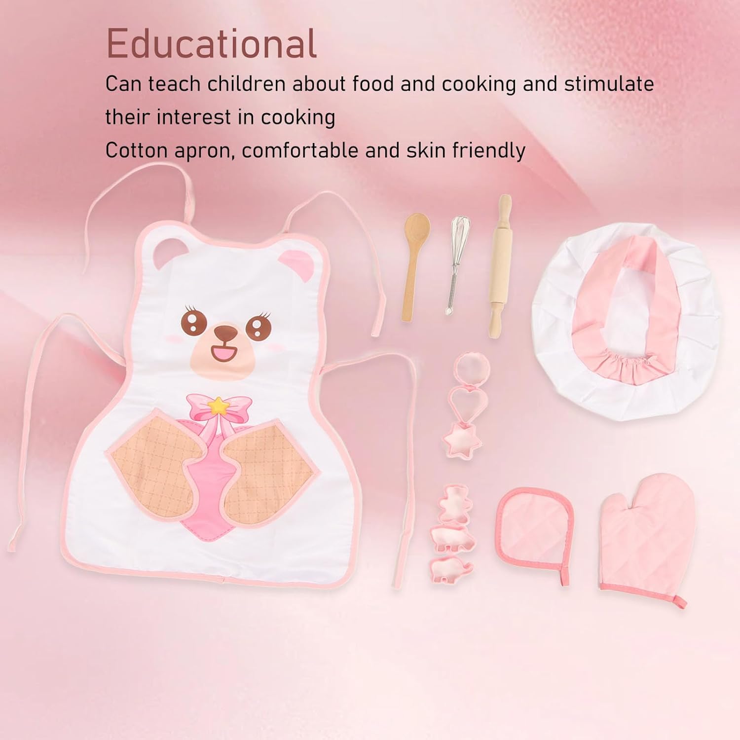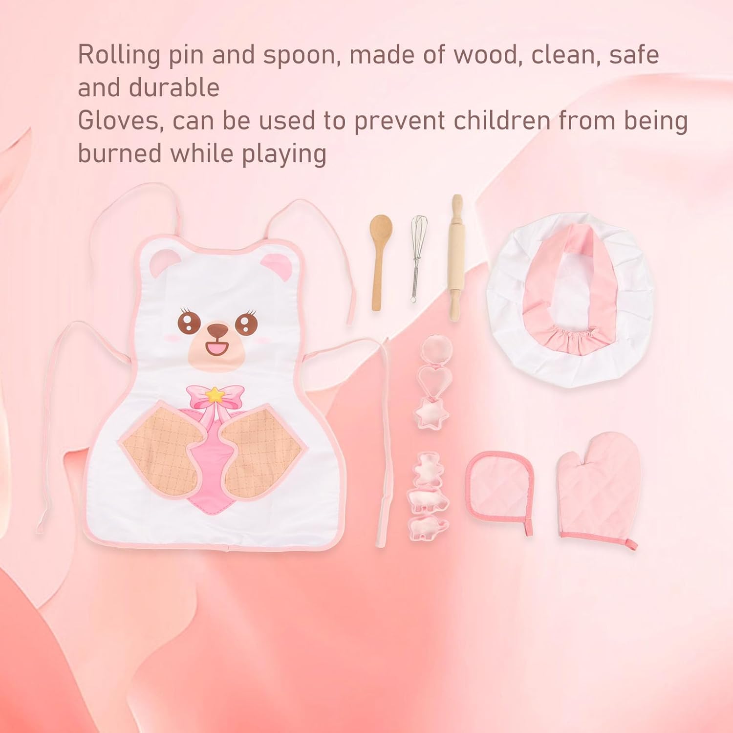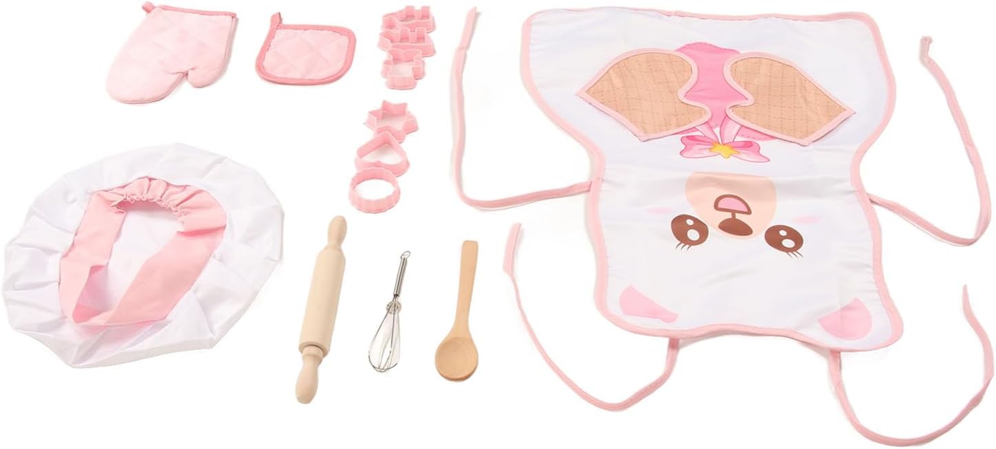 [Educational]: questo giocattolo da cuoco per cuocere per bambini insegna ai bambini il cibo e la cucina, stimolando il loro interesse per la cucina e lo sviluppo dell'infanzia. [Gruppo di cotone]: il grembiule di cotone incluso è comodo, adatto alla pelle e soddisfa gli standard di certificazione della sicurezza dei bambini. [Cappello da chef leggero]: il giocattolo da chef per bambini presenta un cappello da chef leggero e attraente, che offre ai bambini un'esperienza nuova per diventare chef. [Pensino e cucchiaio rotolante in legno]: realizzati in legno, il mattarello e il cucchiaio inclusi in questo set di giocattoli da cucina per bambini sono puliti, sicuri e resistenti. [Guanti preventivi]: il set di giocattoli per bambini che lo chef include guanti per prevenire le ustioni durante il gioco, garantendo un'esperienza per i bambini.