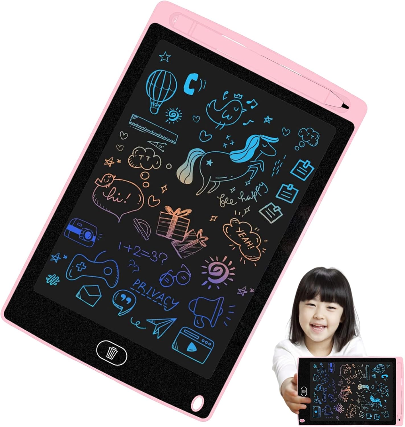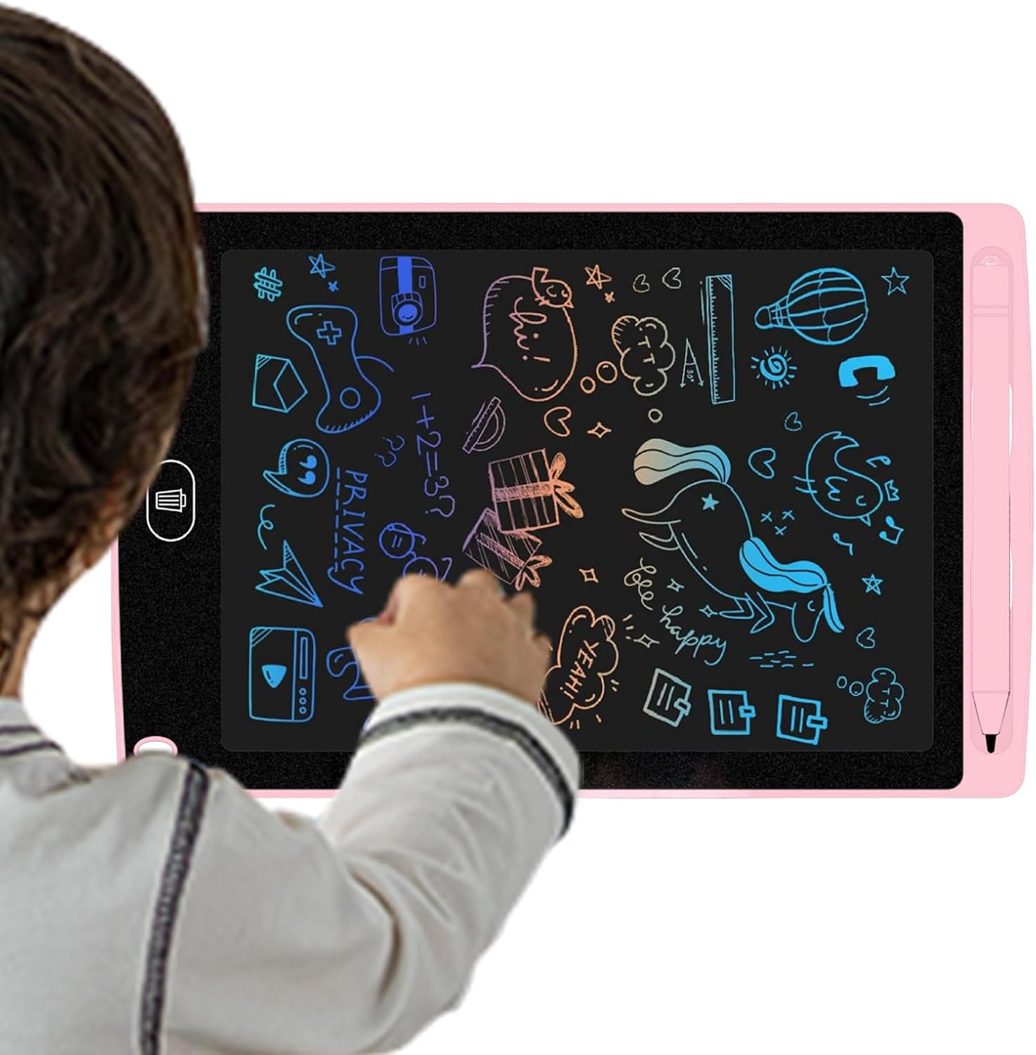 Colorful Eye-Catching Display: The vibrant screen brings drawings to life with rainbow-like colors, enhancing visual engagement for kids while they sketch, write, or learn—an exciting way to boost imagination and attention -Click Erase Function: With just press, kids can instantly clear the screen and start fresh—no , no paper waste, and perfect for continuous use whether at home, school, or during travel Pressure-Sensitive : Comes with a smooth, responsive that mimics pen-on-paper feel—ideal for handwriting practice, drawing activities, or math work without digital distractions or screen time worries Lightweight and Travel-Friendly: Slim and portable design easily fits in backpacks or travel bags—makes car rides, airplane trips, restaurant visits, and waiting rooms calm, fun, and screen-free for kids Great Gift for Any Occasion: A perfect birthday, holiday, or classroom gift for and young children—supports learning, fine motor skill development, and creativity with every doodle and note