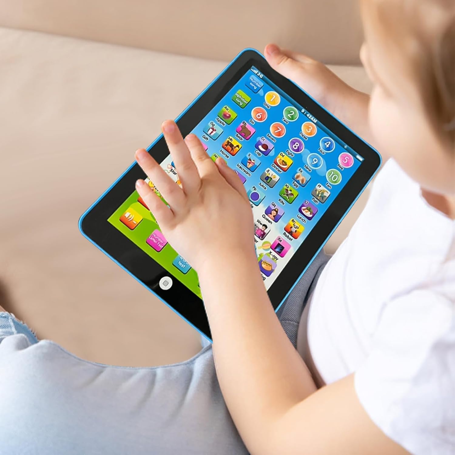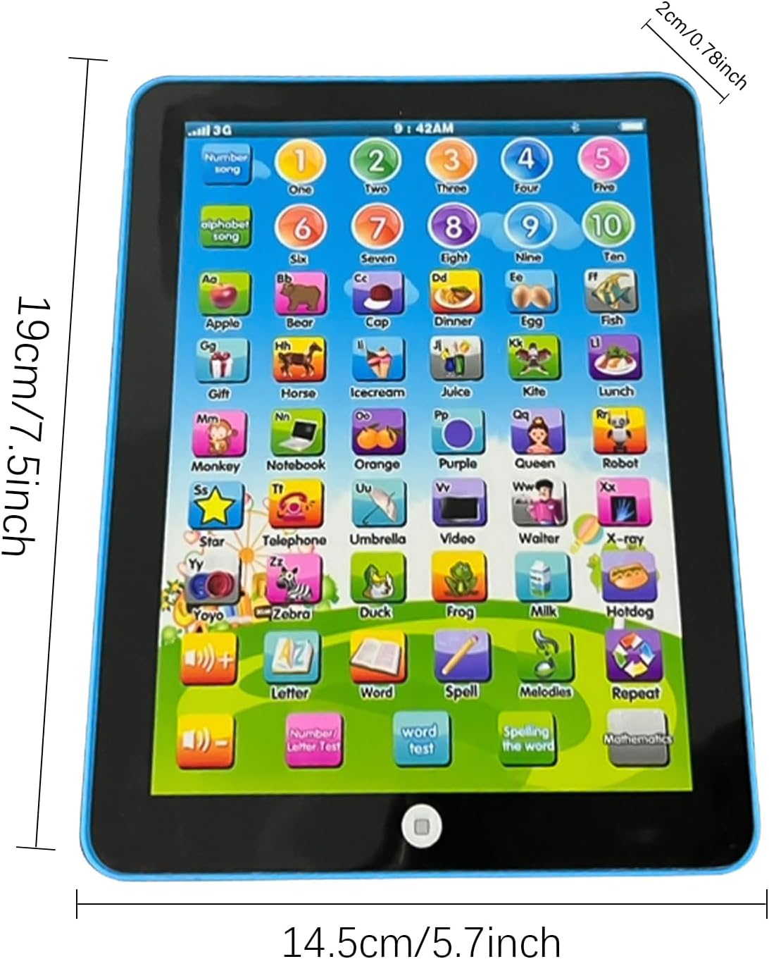 Modalità multiple interessanti: con una varietà di modalità, i bambini dei bambini permetteranno ai bambini di imparare l'alfabeto in modo divertente attraverso canzoni e giochi di vocabolario. Puoi anche regolare il volume e riprodurre musica. Porta batterie (vendute separatamente) e inizia i tuoi studi. Progressi nell'apprendimento precoce: questo tablet per bambini promuove l'apprendimento precoce per il tuo bambino con disegni interessanti e una pronuncia chiara. La funzione del pulsante a sfioramento consente al bambino di praticare parole ortografiche, imparare lettere e vocabolario, e aumentare la sua energia e interesse per l'apprendimento. Migliora il tuo apprendimento: questa tavoletta di apprendimento musicale stimola i pensieri e la curiosità di un bambino. Presenta una varietà di melodie, canzoni coinvolgenti e sfide basate su domande per il divertimento educativo. Facile da trasportare: il tablet per bambini di questo bambino è facile da trasportare, pone le basi per l'educazione all'asilo e protegge la vista con un gioco e un'applicazione divertente che aiuta il bambino a imparare attraverso il gioco. Regalo perfetto: regalo perfetto per i tuoi genitori. Kids Tablet Boys è un regalo speciale che unisce educazione e divertimento per bambini dai 3 anni in su. Perfetto per ragazzi e ragazze, viene fornito preinstallato con applicazioni e giochi che promuovono l'apprendimento e la creatività. Un ottimo regalo per Natale o compleanno.