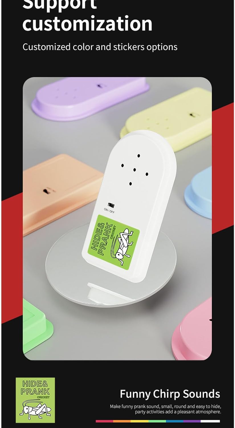 Suoni realistici: il maker di rumore di cricket presenta quattro diversi suoni di cricket progettati per imitare il cinguettio naturale dei grilli. I suoi suoni chiari e intermittenti creano un'atmosfera realistica, inducendo i tuoi amici a credere che ci siano vevi grilli nelle vicinanze. Questo elemento di sorpresa aggiungerà sicuramente una deliziosa svolta a qualsiasi giorno! Comodo sostegno adesivo: ogni scatola di scherzi da cricket viene fornito con un supporto adesivo, rendendo facile nascondere sotto i tavoli, dietro i mobili o in qualsiasi nascondiglio intelligente. Ciò non migliora l'elemento di sorpresa, ma garantisce anche che lo scherzo possa essere impostato in modo rapido e senza sforzo, consentendo il divertimento spontaneo in qualsiasi ambiente. Funzionalità di riproduzione automatica: una volta attivato, il dispositivo Sound Cricket suona automaticamente un suono di cricket e passa in una modalità di riproduzione casuale unica. Ciò significa che suonerà inaspettatamente suoni di cricket a intervalli da 3 a 20 minuti, mantenendo lo scherzo senza alcun intervento manuale. Funziona in un ciclo continuo fino a quando non viene spento, garantendo risate prolungate. Ideale per tutte le età: questo produttore di rumore di cricket è l'ultimo giocattolo di scherzi per entrambi gli adulti e. È per battute pratiche in ufficio o divertenti riunioni di famiglia. Con il suo design amichevole e la funzionalità sofisticata, fa appello a una vasta gamma di ENCE, rendendolo un'aggiunta versatile a qualsiasi collezione di Prankster. Design compatto e portatile: misura 83,5 x 42 x 10,2 mm, la scatola dello scherzo da cricket è abbastanza piccola da adattarsi in tasca, rendendo facile da trasportare ovunque. Che tu stia pianificando scherzo a casa, in ufficio o ad una festa, questo dispositivo compatto ti assicura di essere sempre pronto risata. Il suo design leggero significa che può essere portato lungo ovunque i lead divertenti!