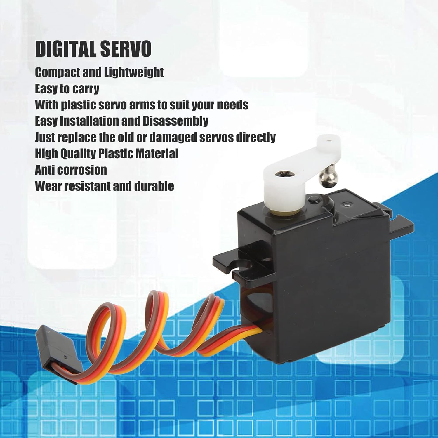 Prestazioni eccezionali: questo servo RC offre alta efficienza con basso rumore e risposta rapida. Durante il funzionamento, consuma meno energia, rendendolo per le tue avventure di guida in auto RC. Con oltre 200 caratteri, questa funzione funge da compagno affidabile ed efficiente per i tuoi modelli di auto. Elevata capacità di carico: dotato di un robusto ingranaggio in plastica, il servo digitale può gestire carichi più elevati. Ciò garantisce prestazioni costanti dello sterzo e offre un'esperienza di guida intensa e ininterrotta per le tue auto RC. Design compatto: questo servo dello sterzo RC non è piccolo e leggero, ma è anche portatile e facile da trasportare. Inoltre, viene fornito con un braccio del servo in plastica flessibile per soddisfare tutte le esigenze di guida della tua auto RC. Installazione senza problemi: il nostro servo digitale consente una facile installazione e smontaggio, per coloro che desiderano sostituire un servo vecchio o danneggiato. È sufficiente sostituirlo direttamente con il servo esistente, rendendo il processo efficiente e semplice. Materiale: durata e longevità sono fondamentali per questo sterzo. Realizzato in plastica di alta qualità, è resistente all'usura e progettato per resistere a lunghe ore di intense corse automobilistiche. È costruito per durare, assicurandoti di ottenere il massimo dalla tua esperienza con l'auto RC.