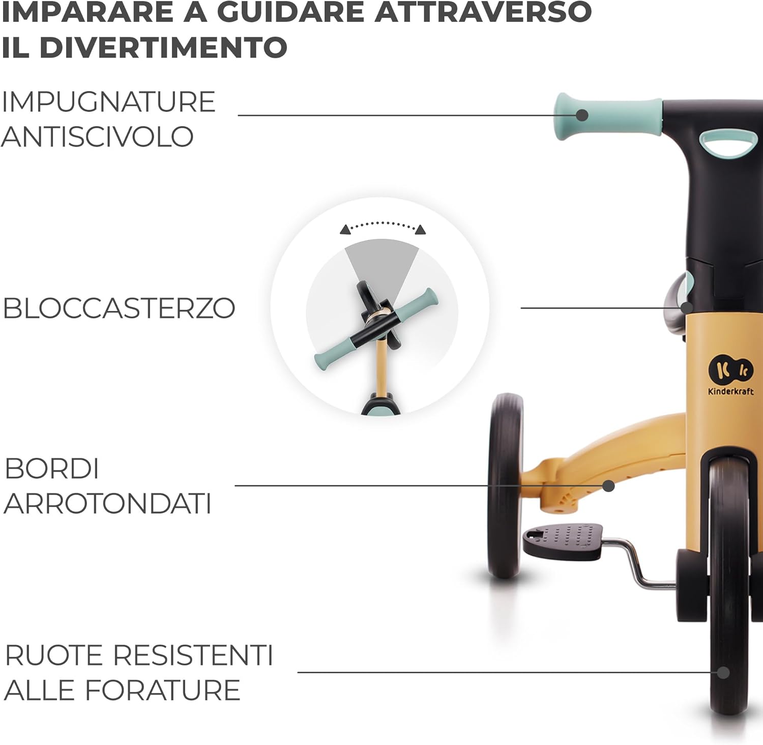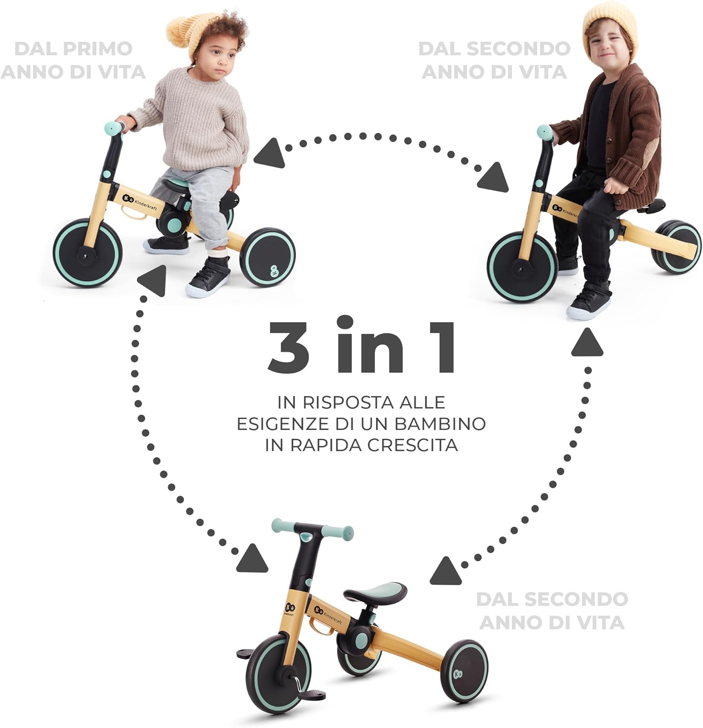 ✅BICICLETTA PIEGHEVOLE 3 IN 1: triciclo per bambini a partire da 1 anno fino a circa 5 anni (25 kg). Bicicletta primi passi a tre ruote, mini-bici senza pedali e triciclo con pedali in un’unica soluzione. Permette il passaggio rapido da una funzione all’altra, senza l’ausilio di alcun attrezzo ✅SICURA: la bicicletta dispone di un bloccasterzo posto sul manubrio, che impedisce di svoltare bruscamente durante la corsa. Il manubrio è dotato, inoltre, di impugnature antiscivolo per garantire il massimo controllo alla guida ✅MULTIFUNZIONI: il cambio di funzioni è molto semplice e non richiede l’uso di alcun attrezzo. É possibile rimuovere i pedali (trasformando la bicicletta in una mini-bici senza pedali) e fissarli sotto la seduta. Modificare la posizione delle ruote è semplice e non richiede alcuno sforzo – nel kit è incluso un apposito elemento che permette di fissare la posizione delle ruote e che può fungere da pratico manico per il trasporto, cambiandone semplicemente il montaggio ✅CONFORTEVOLE: la seduta sagomata è regolabile (29,5 – 31,5 cm). La bicicletta è leggera (3,5 kg) e dispone di un manico per il trasporto posizionato sul telaio e sul manubrio. Si ripiega in dimensioni compatte e può essere comodamente riposta nel bagagliaio della macchina o nell’armadio ✅LEGGERA: il telaio in alluminio conferisce alla bicicletta leggerezza e grande resistenza. Le ruote “piene” realizzate in schiuma a prova di forature, sono anti abrasione, non danneggiano il pavimento e aderiscono perfettamente al suolo. La bicicletta pieghevole sarà ideale sia in città, che a casa