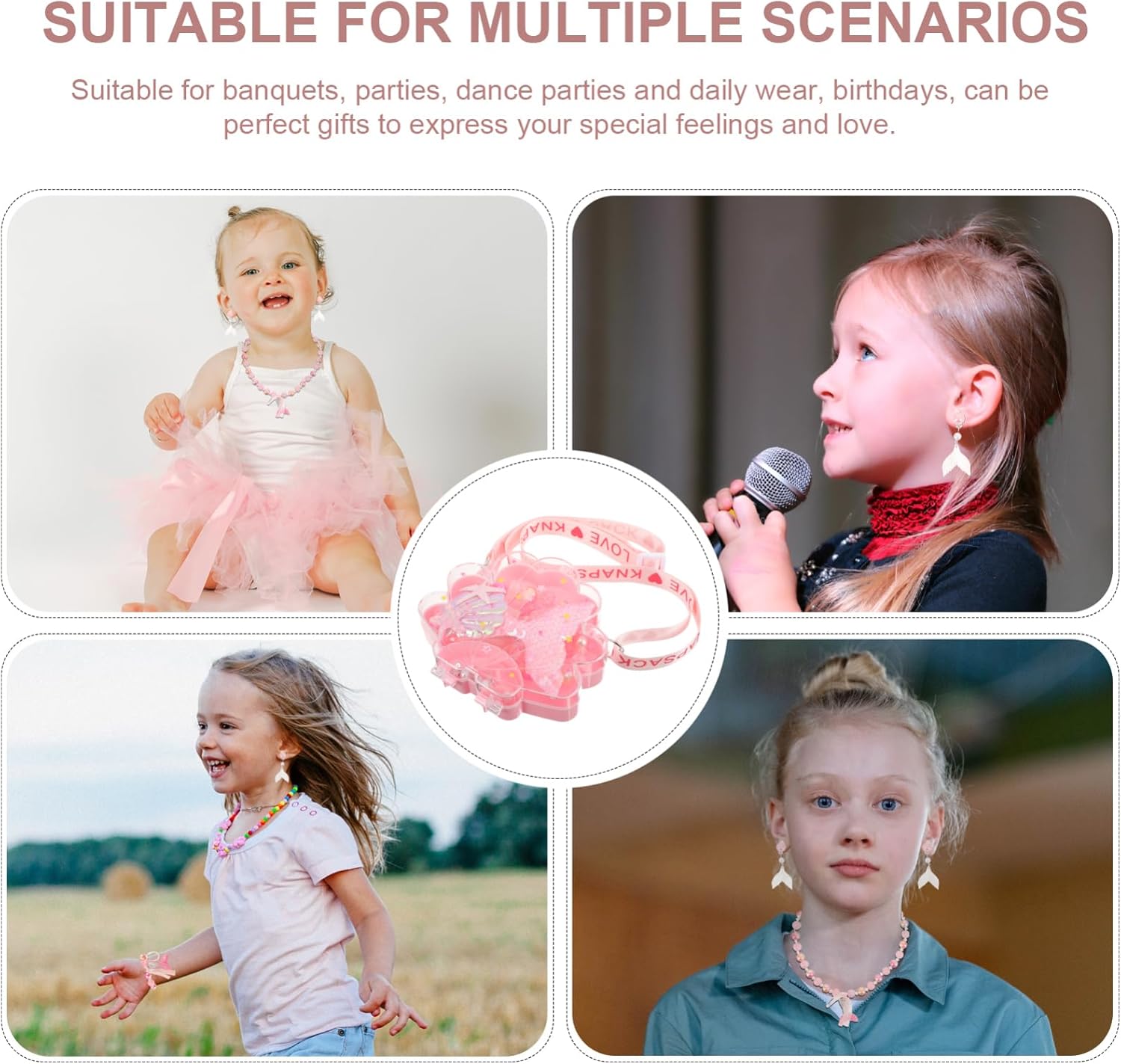 Il pacchetto include 1 x Collana 1 x Bracciale 1 x Paio di Orecchini 1 x Forcina 1 Caratteristiche -Dimensioni: 3,50X2,50X2,00 cm/1,38X0,98X0,79 pollici gioielli per bambini -Dimensioni: 15,00X15,00X4,50 cm/5,89X5,89X1,77 pollici gioielli per bambini piccoli -Dimensioni: 5,50X5,50X4,50 cm/2,16X2,16X1,77 pollici gioielli per bambine -Dimensioni: 11,00X9,00X2,00 cm/4,32X3,54X0,79 pollici gioielli per ragazze -Colore: gioielli rosa per bambini -Dimensioni: 58,00X14,00X3,80 cm/22,79X5,50X1,49 pollici, gioielli da gioco per bambine -Dimensioni: 6,50X2,80X1,00 cm/2,55X1,10X0,39 pollici gioielli sirena -Materiale: stoffa, resina, gioielli in metallo per bambine - Alla moda e unici, puoi facilmente abbinare la maggior parte dei vestiti, vestiti, gonne, pantaloni, ecc. Gioielli per bambine. -Colori vivaci, look . Questo set di gioielli è delicato e bellissimo, ogni ragazza lo adorerà. - Comodi e comodi da indossare, questi gioielli per bambine non danneggiano la loro delicata pelle. -Con il design a tema sirena dei cartoni animati, questo set di gioielli conquisterà le bambine. - Adatto come gioiello da sirena per ragazze, per feste in maschera, come accessorio fotografico, come costume quotidiano, per spettacoli teatrali, feste a tema e così via. Descrizione della merce gioielli per bambine Questo set di gioielli è realizzato con buoni materiali ed è sicuro da indossare. Gioielli per bambini Puoi regalarli alle tue bambine e saranno molto felici. La lavorazione dei gioielli per bambine e il design creativo a tema sirena renderanno la tua bambina più attraente