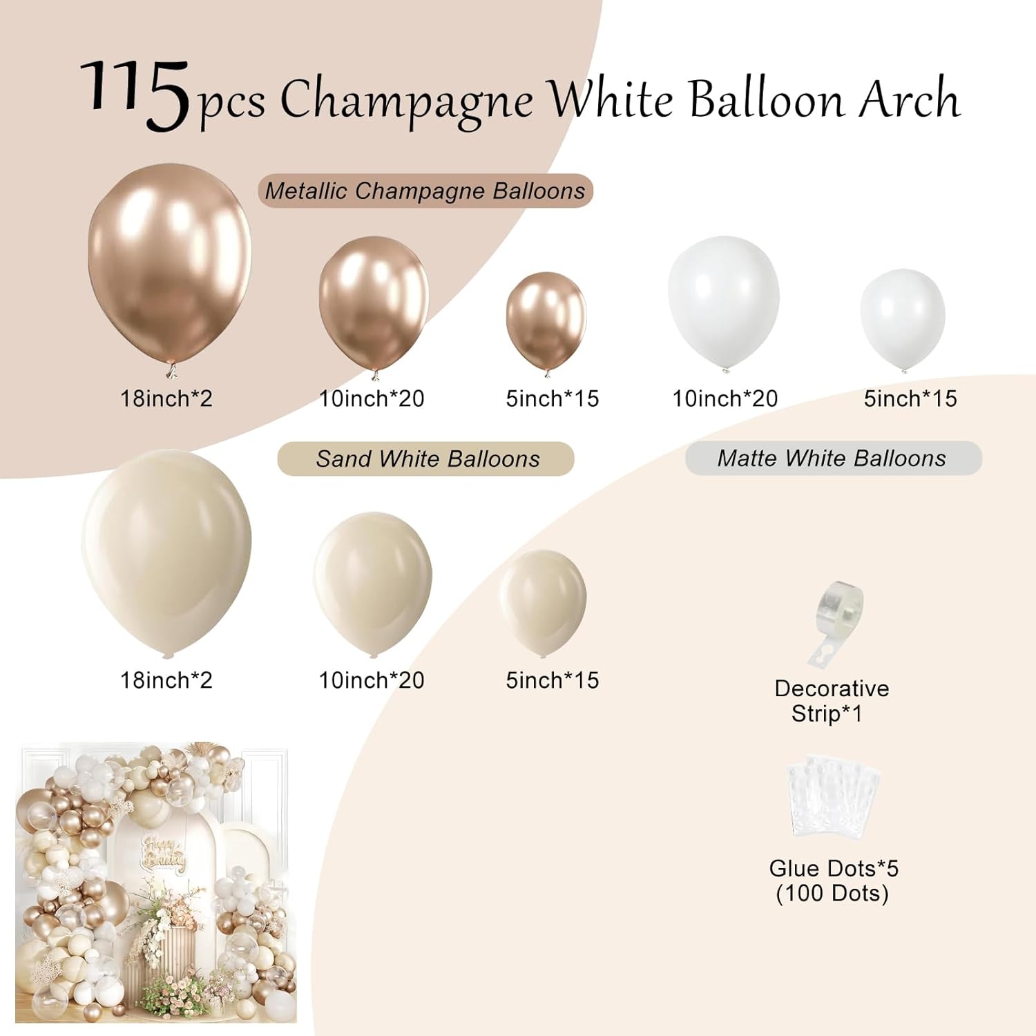 【Palloncini Dorati di Champagne Bianchi】115 pezzi kit arco palloncino avorio con champagne white champagne oro: palloncini bianchi (15pc 5 pollici, 20pcs 10 pollici), palloncini bianchi di sabbia (15 pezzi 5 pollici, 20pcs 10 pollici, 2pcs 18 pollici), palloncini d'oro di champagne (15pcs 5 pollici, 20pcs 10 pollici, 2pcs 18 pollici), 1 rotolo di palloncini arco, 5 fogli (100 punti) punti colla. Il perfetto arco di palloncini beige in oro bianco champagne per qualsiasi decorazione per feste 【Palloncini per Feste di Qualità Premium】Palloncini dorati bianchi e champagne riutilizzabili di diverse dimensioni sono realizzati in lattice naturale di alta qualità, innocuo e non tossico, e sicuro da usare intorno ai bambini come sfondo a palloncino per la decorazione delle feste. Questi palloncini beige possono supportare aria e elio. Sono molto più durevoli dei palloncini normali, che possono rimanere una buona forma per molto tempo dopo l'inflazione 【Palloncini per Feste di Qualità Premium】Palloncini dorati bianchi e champagne riutilizzabili di diverse dimensioni sono realizzati in lattice naturale di alta qualità, innocuo e non tossico, e sicuro da usare intorno ai bambini come sfondo a palloncino per la decorazione delle feste. Questi palloncini beige possono supportare aria e elio. Sono molto più durevoli dei palloncini normali, che possono rimanere una buona forma per molto tempo dopo l'inflazione 【Applicazione Ampia】 Il kit arco a palloncino beige è perfetto per qualsiasi evento. Fai un'enorme dichiarazione con questo elegante kit di palloncini di tema nudo bianco di sabbia per docce per bambini, docce nuziali, feste di compleanno, matrimonio, anniversari, fidanzamento. Eleganti palloncini in oro bianco e champagne lascerà ricordi indimenticabili per tutti, permettendo alla tua famiglia e ai tuoi amici di trascorrere momenti meravigliosi 【Ricordo Caldo】Si prega di non riempire troppo il palloncino, basta riempire il palloncino il 90% è perfetto per impedire che esploda. Oltre ai palloncini devono evitare un'esposizione eccessiva alla luce solare, lontano da oggetti acuti e attrito eccessivo. È meglio farlo lo stesso giorno o un giorno di anticipo per risultati migliori. In caso di domande, ti preghiamo di contattarci, risolveremo il tuo problema il prima possibile